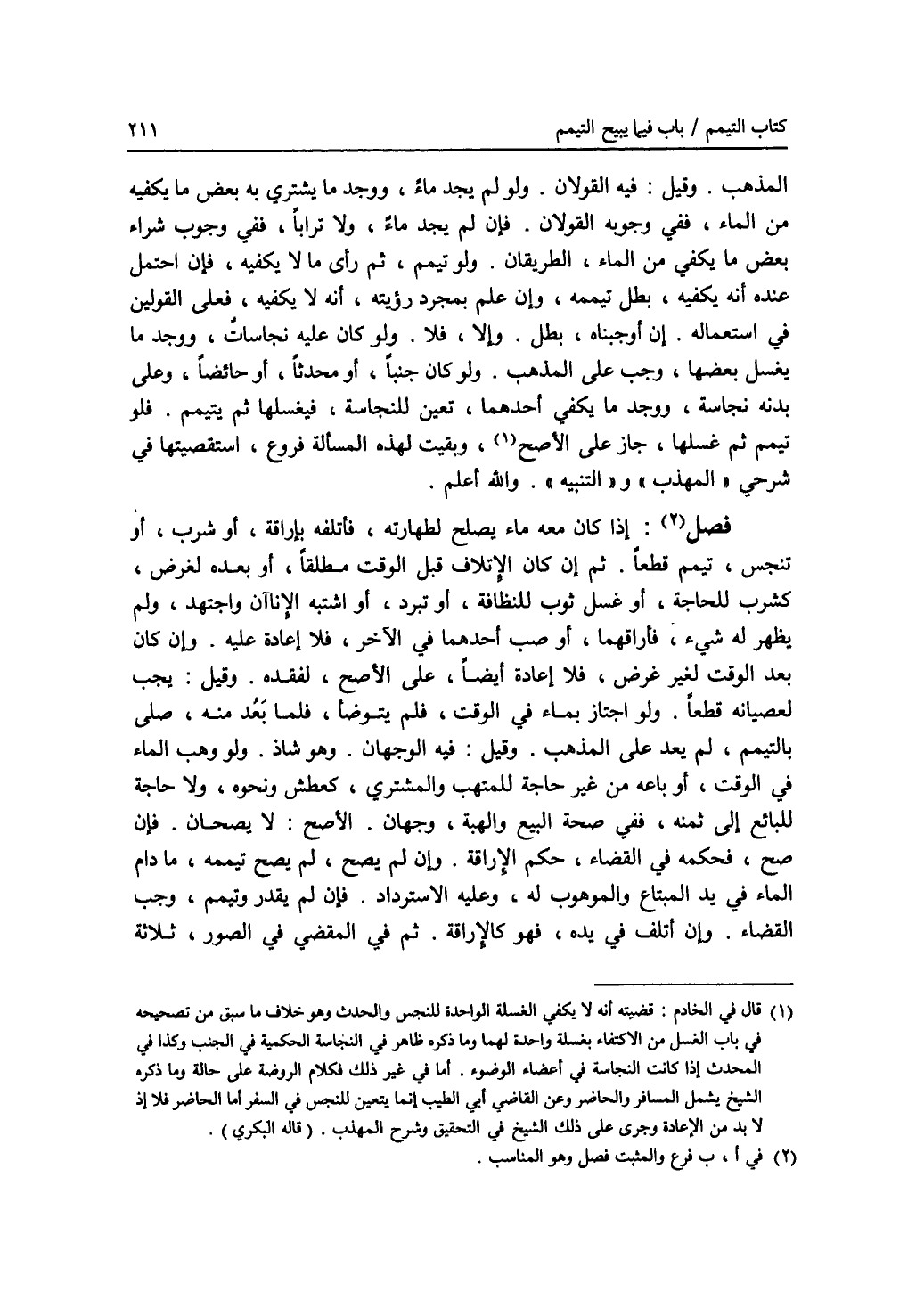 المذهب. وقيل: فيه القولان. ولو لم يجد ماء، ووجد ما يشتري به بعض ما يكفيه من الماء، ففي وجوبه القولان. فإن لم يجد ماء، ولا ترابا، ففي وجوب شراء بعض ما يكفي من الماء، الطريقان. ولو تيمم، ثم رأى ما لا يكفيه، فإن احتمل عنده أنه يكفيه، بطل تيممه، وإن علم بمجرد رؤيته، أنه لا يكفيه، فعلى القولين في استعماله. إن أوجبناه، بطل. وإلا، فلا. ولو كان عليه نجاسات، ووجد ما يغسل بعضها، وجب على المذهب، ولو كان جنبا، أو محدثا، أو حائضا، وعلى بدنه نجاسة، ووجد ما يكفي أحدهما، تعين للنجاسة، فيغسلها ثم يتيمم. فلو تيمم ثم غسلها، جاز على الاصح (1)، وبقيت لهذه المسألة فروع، استقصيتها في شرحي (المهذب) و (التنبيه). والله أعلم. فصل (2): إذا كان معه ماء يصلح لطهارته، فأتلفه بإراقة، أو شرب، أو تنجيس، تيمم قطعا. ثم إن كان الاتلاف قبل الوقت مطلقا، أو بعده لغرض، كشرب للحاجة، أو غسل ثوب للنظافة، أو تبرد، أو اشتبه الاناآن واجتهد، ولم يظهر له شئ، فأراقهما، أو صب أحدهما في الآخر، فلا إعادة عليه. وإن كان بعد الوقت لغير غرض، فلا إعادة أيضا، على الاصح، لفقده. وقيل: يجب لعصيانه قطعا. ولو اجتاز بماء في الوقت، فلم يتوضأ، فلما بعد منه، صلى بالتيمم، لم يعد على المذهب. وقيل: فيه الوجهان. وهو شاذ. ولو وهب الماء في الوقت، أو باعه من غير حاجة للمتهب والمشتري، كعطش ونحوه، ولا حاجة للبائع إلى ثمنه، ففي صحة البيع والهبة، وجهان. الاصح: لا يصحان. فإن صح، فحكمه في القضاء، حكم الاراقة. وإن لم يصح، لم يصح تيممه، ما دام الماء في يد المبتاع والموهوب له، وعليه الاسترداد. فإن لم يقدر وتيمم، وجب القضاء. وإن أتلف في يده، فهو كالاراقة. ثم في المقضي في الصور، ثلاثة