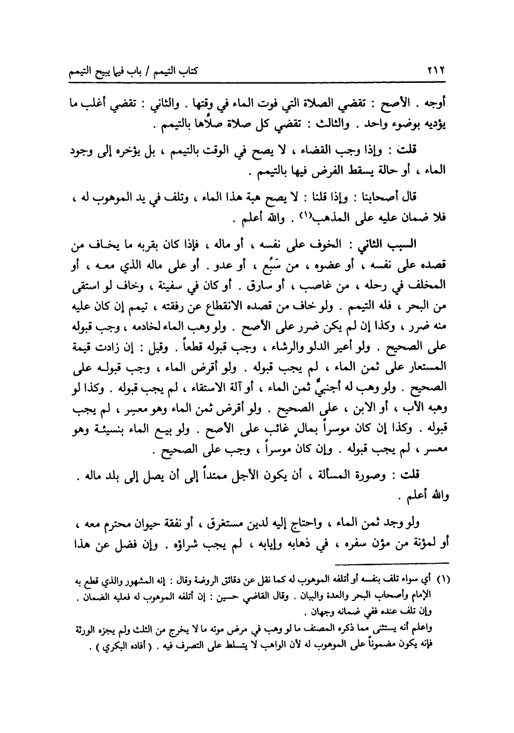 أوجه. الاصح: تقضى الصلاة التي فوت الماء في وقتها. والثاني: تقضى أغلب ما يؤديه بوضوء واحد. والثالث: تقضى كل صلاة صلاها بالتيمم. قلت: وإذا وجب القضاء، لا يصح في الوقت بالتيمم، بل يؤخره إلى وجود الماء، أو حالة يسقط الفرض فيها بالتيمم. قال أصحابنا: وإذا قلنا: لا يصح هبة هذا الماء، وتلف في يد الموهوب له، فلا ضمان عليه على المذهب (1). والله أعلم. السبب الثاني: الخوف على نفسه، أو ماله، فإذا كان بقربه ما يخاف من قصده على نفسه، أو عضوه، من سبع، أو عدو. أو على ماله الذي معه، أو المخلف في رحله، من غاصب، أو سارق. أو كان في سفينة، وخاف لو استقى من البحر، فله التيمم. ولو خاف من قصده الانقطاع عن رفقته، تيمم إن كان عليه منه ضرر، وكذا إن لم يكن ضرر على الاصح. ولو وهب الماء لخادمه، وجب قبوله على الصحيح. ولو أعير الدلو والرشاء، وجب قبوله قطعا. وقيل: إن زادت قيمة المستعار على ثمن الماء، لم يجب قبوله. ولو أقرض الماء، وجب قبوله على الصحيح. ولو وهب له أجنبي ثمن الماء، أو آلة الاستقاء، لم يجب قبوله. وكذا لو وهبه الاب، أو الابن، على الصحيح. ولو أقرض ثمن الماء وهو معسر، لم يجب قبوله. وكذا إن كان موسرا بمال غائب على الاصح. ولو بيع الماء بنسيئة وهو معسر، لم يجب قبوله. وإن كان موسرا، وجب على الصحيح. قلت: وصورة المسألة، أن يكون الاجل ممتدا إلى أن يصل إلى بلد ماله. والله أعلم. ولو وجد ثمن الماء، واحتاج إليه لدين مستغرق، أو نفقة حيوان محترم معه، أو لمؤنة من مؤن سفره، في ذهابه وإيابه، لم يجب شراؤه. وإن فضل عن هذا