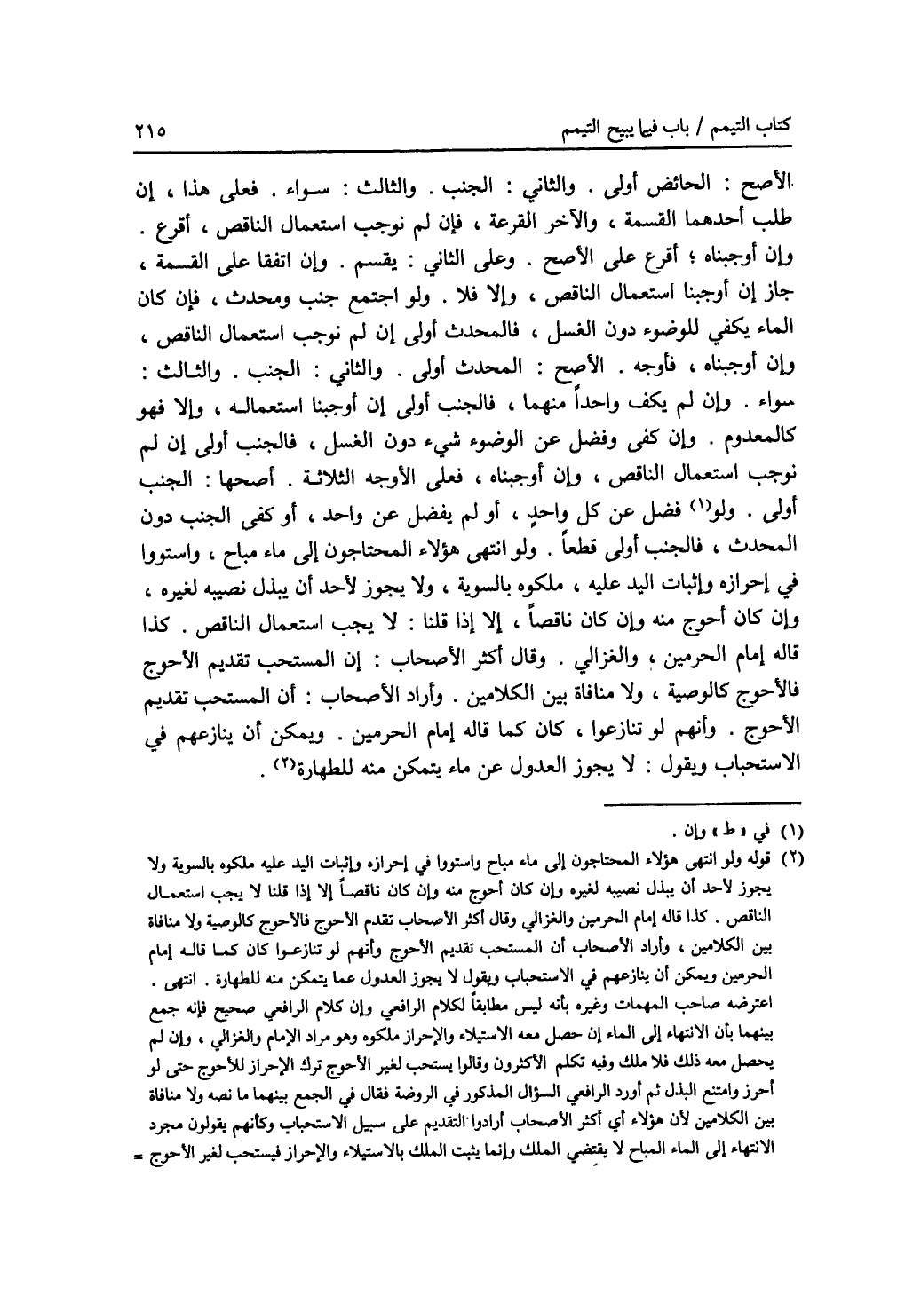 الاصح: الحائض أولى. والثاني: الجنب. والثالث: سواء. فعلى هذا، إن طلب أحدهما القسمة، والآخر القرعة، فإن لم نوجب استعمال الناقص، أقرع. وإن أوجبناه، أقرع على الاصح. وعلى الثاني: يقسم. وإن اتفقا على القسمة، جاز إن أوجبنا استعمال الناقص، وإلا فلا. ولو اجتمع جنب ومحدث، فإن كان الماء يكفي للوضوء دون الغسل، فالمحدث أولى إن لم نوجب استعمال الناقص، وإن أوجبناه، فأوجه. الاصح: المحدث أولى. والثاني: الجنب. والثالث: سواء. وإن لم يكف واحدا منهما، فالجنب أولى إن أوجبنا استعماله، وإلا فهو كالمعدوم. وإن كفى وفضل عن الوضوء شئ دون الغسل، فالجنب أولى إن لم نوجب استعمال الناقص، وإن أوجبناه. فعلى الاوجه الثلاثة. أصحها: الجنب أولى. ولو (1) فضل عن كل واحد، أو لم يفضل عن واحد، أو كفى الجنب دون المحدث، فالجنب أولى قطعا. ولو انتهى هؤلاء المحتاجون إلى ماء مباح، واستووا في إحرازه وإثبات اليد عليه، ملكوه بالسوية، ولا يجوز لاحد أن يبذل نصيبه لغيره، وإن كان أحوج منه وإن كان ناقصا، إلا إذا قلنا: لا يجب استعمال الناقص. كذا قاله إمام الحرمين، والغزالي. وقال أكثر الاصحاب: إن المستحب تقديم الاحوج فالاحوج كالوصية، ولا منافاة بين الكلامين. وأراد الاصحاب: أن المستحب تقديم الاحوج، وأنهم لو تنازعوا، كان كما قاله إمام الحرمين. ويمكن أن ينازعهم في الاستحباب ويقول: لا يجوز العدول عن ماء يتمكن منه للطهارة (2).