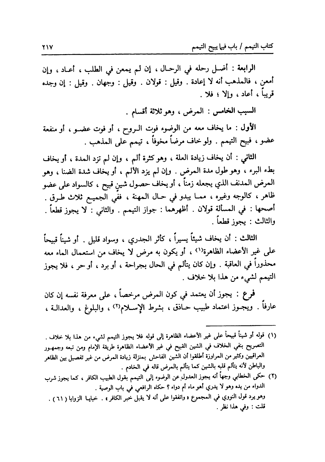 الرابعة: أضل رحله في الرحال، إن لم يمعن في الطلب، أعاد، وإن أمعن، فالمذهب أنه لا إعادة. وقيل: قولان. وقيل: وجهان. وقيل: إن وجده قريبا، أعاد، وإلا، فلا. السبب الخامس: المرض، وهو ثلاثة أقسام. الاول: ما يخاف معه من الوضوء فوت الروح، أو فوت عضو، أو منفعة عضو، فبيح التيمم. ولو خاف مرضا مخوفا، تيمم على المذهب. الثاني: أن يخاف زيادة العلة، وهو كثرة ألم، وإن لم تزد المدة، أو يخاف بطء البرء، وهو طول مدة المرض. وإن لم يزد الالم، أو يخاف شدة الضنا، وهو المرض المدنف الذي يجعله زمنا، أو يخاف حصول شين قبيح، كالسواد على عضو ظاهر، كالوجه وغيره، مما يبدو في حال المهنة، ففي الجميع ثلاث طرق. أصحها: في المسألة قولان. أظهرهما: جواز التيمم. والثاني: لا يجوز قطعا. والثالث: يجوز قطعا. الثالث: أن يخاف شيئا يسيرا، كأثر الجدري، وسواد قليل. أو شينا قبيحا على غير الاعضاء الظاهرة (1)، أو يكون به مرض لا يخاف من استعمال الماء معه محذورا في العاقبة. وإن كان يتألم في الحال بجراحة، أو برد، أو حر، فلا يجوز التيمم لشئ من هذا بلا خلاف. فرع يجوز أن يعتمد في كون المرض مرخصا. على معرفة نفسه إن كان عارفا. ويجوز اعتماد طبيب حاذق، بشرط الاسلام (2)، والبلوغ، والعدالة،