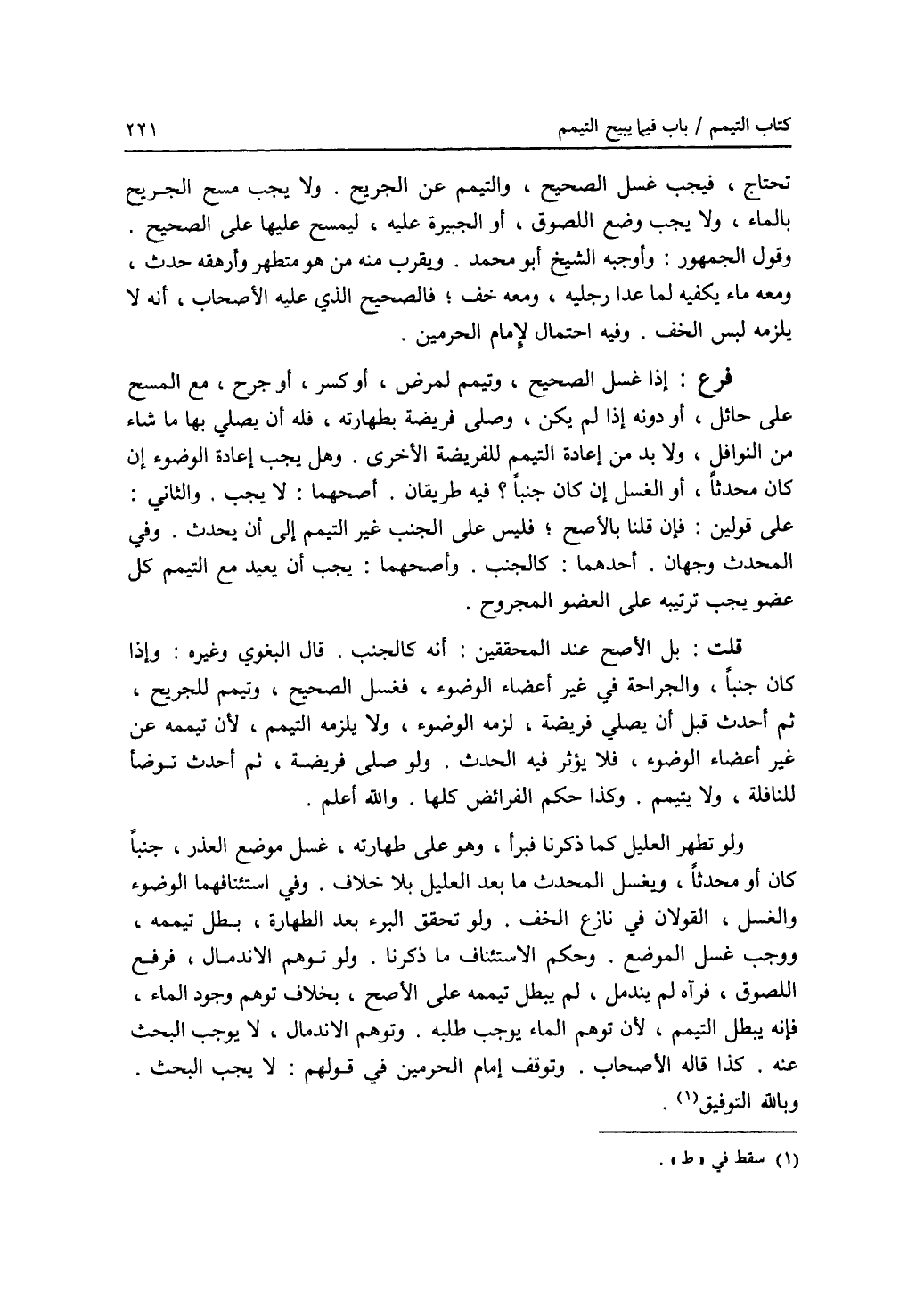 تحتاج، فيجب غسل الصحيح، والتيمم عن الجريح. ولا يجب مسح الجريح بالماء، ولا يجب وضع اللصوق، أو الجبيرة عليه، ليمسح عليها على الصحيح. وقول الجمهور: وأوجبه الشيخ أبو محمد. ويقرب منه من هو متطهر وأرهقه حدث، ومعه ماء يكفيه لما عدا رجليه، ومعه خف، فالصحيح الذي عليه الاصحاب، أنه لا يلزمه لبس الخف. وفيه احتمال لامام الحرمين. فرع: إذا غسل الصحيح، وتيمم لمرض، أو كسر، أو جرح، مع المسح على حائل، أو دونه إذا لم يكن، وصلى فريضة بطهارته، فله أن يصلي بها ما شاء من النوافل، ولا بد من إعادة التيمم للفريضة الاخرى. وهل يجب إعادة الوضوء إن كان محدثا، أو الغسل إن كان جنبا ؟ فيه طريقان. أصحهما: لا يجب. والثاني: على قولين. فإن قلنا بالاصح، فليس على الجنب غير التيمم إلى أن يحدث، وفي المحدث وجهان. أحدهما: كالجنب. وأصحهما: يجب أن يعيد مع التيمم كل عضو يجب ترتيبه على العضو المجروح. قلت: بل الاصح عند المحققين: أنه كالجنب. قال البغوي وغيره: وإذا كان جنبا، والجراحة في غير أعضاء الوضوء، فغسل الصحيح، وتيمم للجريح، ثم أحدث قبل أن يصلي فريضة، لزمه الوضوء، ولا يلزمه التيمم، لان تيممه عن غير أعضاء الوضوء، فلا يؤثر فيه الحدث. ولو صلى فريضة، ثم أحدث، توضأ للنافلة، ولا يتيمم. وكذا حكم الفرائض كلها. والله أعلم. ولو تطهر العليل كما ذكرنا فبرأ، وهو على طهارته، غسل موضع العذر، جنبا كان أو محدثا، ويغسل المحدث ما بعد العليل بلا خلاف. وفي استئنافهما الوضوء والغسل، القولان في نازع الخف. ولو تحقق البرء بعد الطهارة، بطل تيممه، ووجب غسل الموضع. وحكم الاستئناف ما ذكرنا. ولو توهم الاندمال، فرفع اللصوق، فرآه لم يندمل، لم يبطل تيممه على الاصح، بخلاف توهم وجود الماء، فإنه يبطل التيمم، لان توهم الماء يوجب طلبه. وتوهم الاندمال، لا يوجب البحث عنه. كذا قاله الاصحاب. وتوقف إمام الحرمين في قولهم: لا يجب البحث. وبالله التوفيق (1)