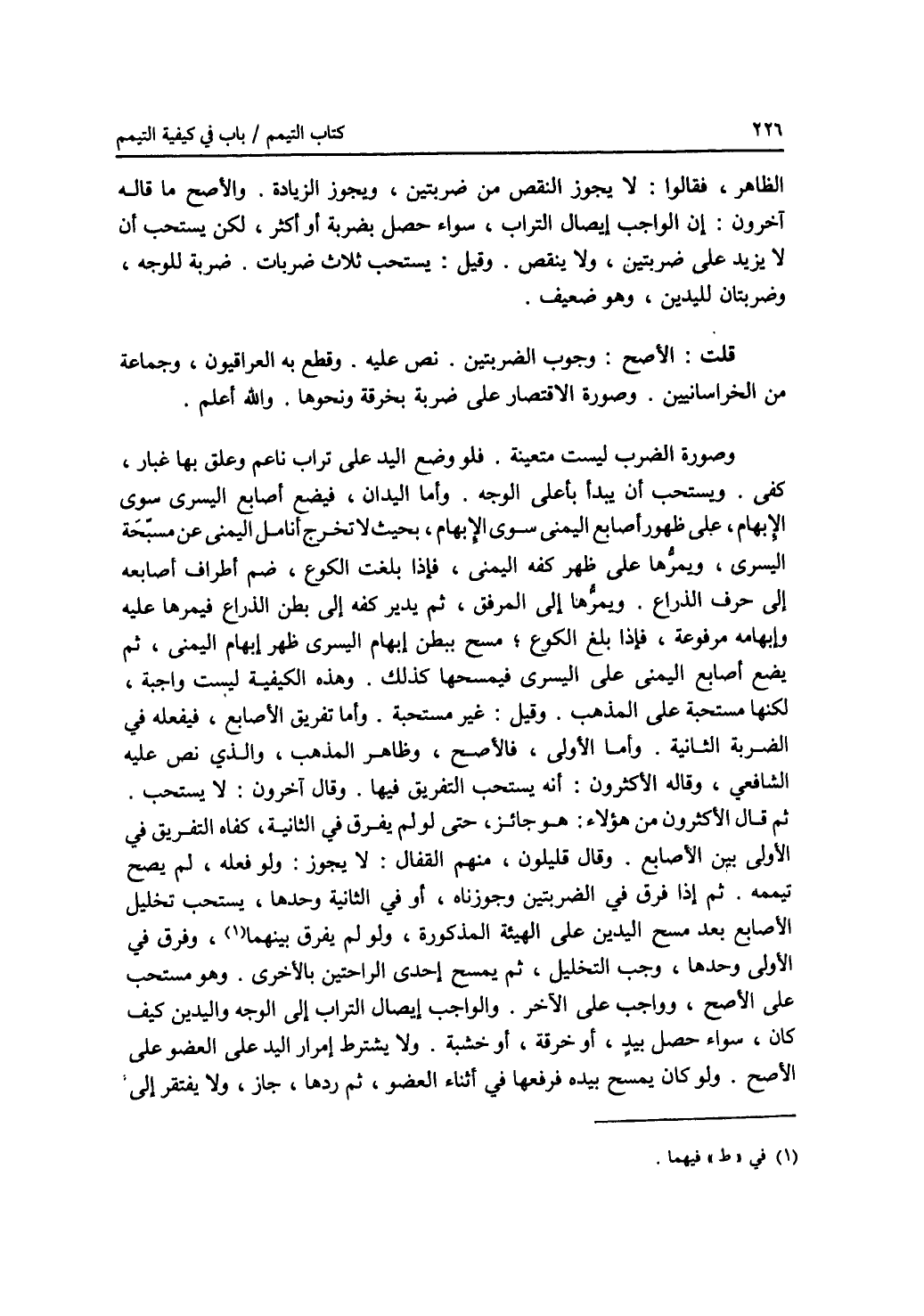 الظاهر، فقالوا: لا يجوز النقص من ضربتين، ويجوز الزيادة. والاصح ما قاله آخرون: أن الواجب إيصال التراب، سواء حصل بضربة أو أكثر، لكن يستحب أن لا يزيد على ضربتين، ولا ينقص. وقيل: يستحب ثلاث ضربات. ضربة للوجه، وضربتان لليدين، وهو ضعيف. قلت: الاصح: وجوب الضربتين. نص عليه. وقطع به العراقيون، وجماعة من الخراسانيين. وصورة الاقتصار على ضربة بخرقة ونحوها. والله أعلم. وصورة الضرب ليست متعينة. فلو وضع اليد على تراب ناعم وعلق بها غبار، كفى. ويستحب أن يبدأ بأعلى الوجه. وأما اليدان، فيضع أصابع اليسرى سوى الابهام، على ظهور أصابع اليمنى سوى الابهام، بحيث لا تخرج أنامل اليمنى عن مسبحة اليسرى، ويمرها على ظهر كفه اليمنى، فإذا بلغت الكوع، ضم أطراف أصابعه إلى حرف الذراع. ويمرها إلى المرفق، ثم يدير كفه إلى بطن الذراع فيمرها عليه وإبهامه مرفوعة، فإذا بلغ الكوع، مسح ببطن إبهام اليسرى ظهر إبهام اليمنى، ثم يضع أصابع اليمنى على اليسرى فيمسحها كذلك. وهذه الكيفية ليست واجبة، لكنها مستحبة على المذهب. وقيل: غير مستحبة. وأما تفريق الاصابع، فيفعله في الضربة الثانية. وأما الاولى، فالاصح، وظاهر المذهب، والذي نص عليه الشافعي، وقاله الاكثرون: أنه يستحب التفريق فيها. وقال آخرون: لا يستحب. ثم قال الاكثرون من هؤلاء: هو جائز، حتى لو لم يفرق في الثانية، كفاه التفريق في الاولى بين الاصابع. وقال قليلون، منهم القفال: لا يجوز: ولو فعله، لم يصح تيممه. ثم إذا فرق في الضربتين وجوزناه، أو في الثانية وحدها، يستحب تخليل الاصابع بعد مسح اليدين على الهيئة المذكورة، ولو لم يفرق فيهما (1)، وفرق في الاولى وحدها، وجب التخليل، ثم يمسح إحدى الراحتين بالاخرى. وهو مستحب على الاصح، وواجب على الآخر. والواجب إيصال التراب إلى الوجه واليدين كيف كان، سواء حصل بيد، أو خرقة، أو خشبة. ولا يشترط إمرار اليد على العضو على الاصح. ولو كان يمسح بيده فرفعها في أثناء العضو، ثم ردها، جاز، ولا يفتقر إلى