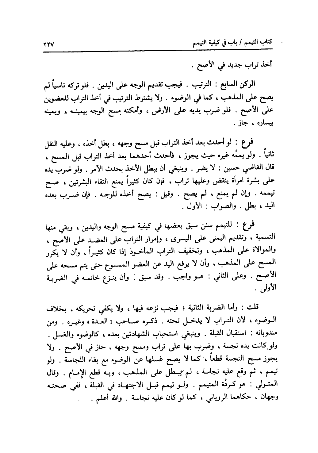 أخذ تراب جديد في الاصح. الركن السابع: الترتيب. فيجب تقديم الوجه على اليدين. فلو تركه ناسيا لم يصح على المذهب، كما في الوضوء. ولا يشترط الترتيب في أخذ التراب للعضوين على الاصح. فلو ضرب يديه على الارض، وأمكنه مسح الوجه بيمينه، ويمينه بيساره، جاز. فرع: لو أحدث بعد أخذ التراب قبل مسح وجهه، بطل أخذه، وعليه النقل ثانية. ولو يممه غيره حيث يجوز، فأحدث أحدهما بعد أخذ التراب قبل المسح، قال القاضي حسين: لا يضر. وينبغي أن يبطل الاخذ بحدث الآمر. ولو ضرب يده على بشرة امرأة ينقض وعليها تراب، فإن كان كثيرا يمنع التقاء البشرتين صح تيممه. وإن لم يمنع، لم يصح. وقيل: يصح أخذه للوجه. فإن ضرب بعده لليد، بطل. والصواب: الاول. فرع: للتيمم سنن سبق بعضها في كيفية مسح الوجه واليدين، وبقي منها التسمية، وتقديم اليمنى على اليسرى، وإمرار التراب على العضد على الاصح، والموالاة على المذهب، وتخفيف التراب المأخوذ إذا كان كثيرا، وأن لا يكرر المسح على المذهب، وأن لا يرفع اليد عن العضو الممسوح حتى يتم مسحه على الاصح. وعلى الثاني: هو واجب. وقد سبق. وأن ينزع خاتمه في الضربة الاولى. قلت: وأما الضربة الثانية، فيجب نزعه فيها، ولا يكفي تحريكه، بخلاف الوضوء، لان التراب لا يدخل تحته. ذكره صاحب (العدة) وغيره. ومن مندوباته: استقبال القبلة. وينبغي استحباب الشهادتين بعده، كالوضوء والغسل. ولو كانت يده نجسة، وضرب بها على تراب ومسح وجهه، جاز في الاصح. ولا يجوز مسح النجسة قطعا، كما لا يصح غسلها عن الوضوء مع بقاء النجاسة. ولو تيمم، ثم وقع عليه نجاسة، لم يبطل على المذهب، وبه قطع الامام. وقال المتولي: هو كردة المتيمم. ولو تيمم قبل الاجتهاد في القبلة، ففي صحته وجهان، حكاهما الروياني، كما لو كان عليه نجاسة. والله أعلم.