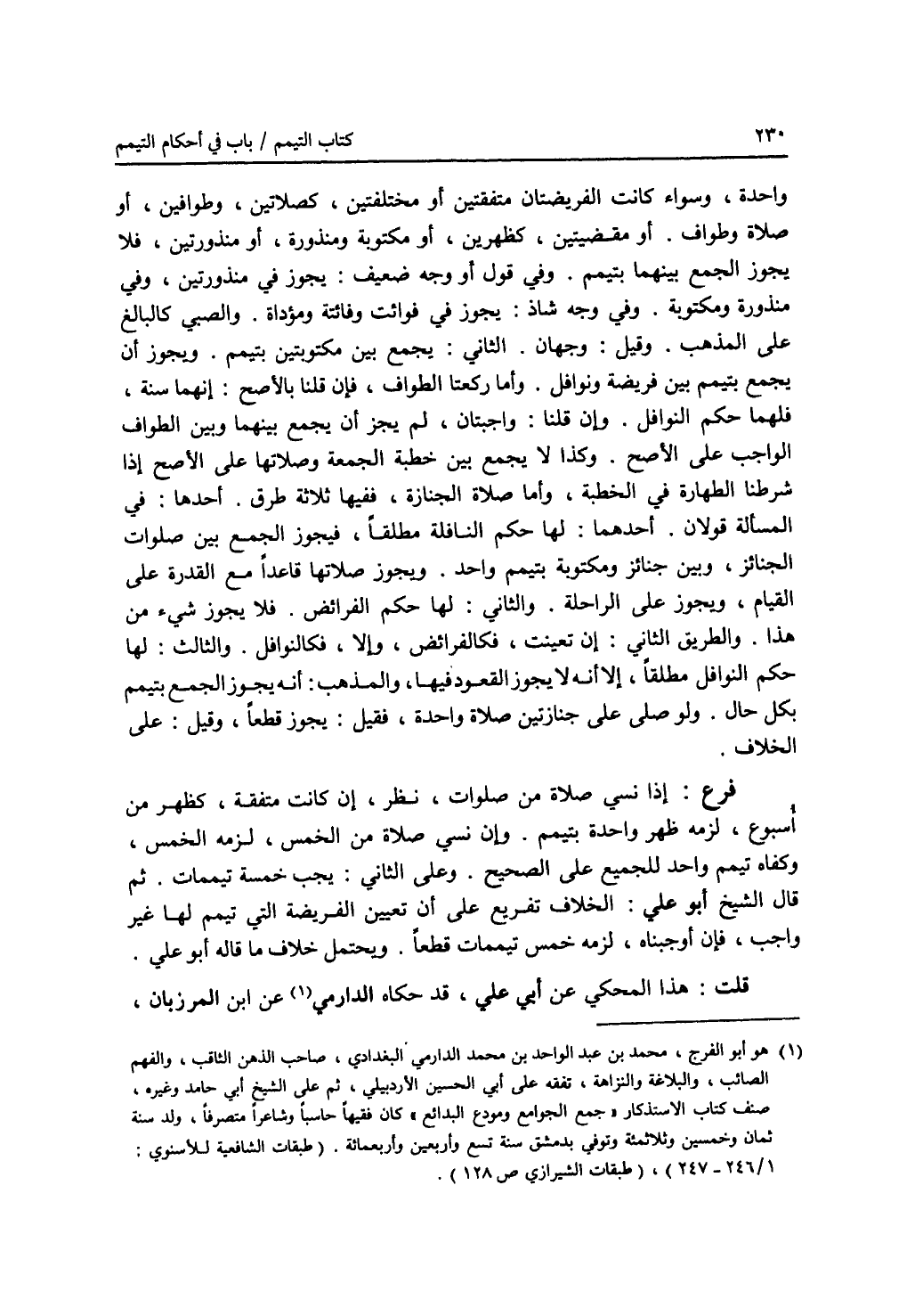 واحدة، وسواء كانت الفريضتان متفقتين أو مختلفتين، كصلاتين، وطوافين، أو صلاة وطواف. أو مقضيتين، كظهرين، أو مكتوبة ومنذورة، أو منذورتين، فلا يجوز الجمع بينهما بتيمم. وفي قول أو وجه ضعيف: يجوز في منذورتين، وفي منذورة ومكتوبة، وفي وجه شاذ: يجوز في فوائت وفائتة ومؤداة. والصبي كالبالغ على المذهب. وقيل: وجهان. الثاني: يجمع بين مكتوبتين بتيمم. ويجوز أن يجمع بتيمم بين فريضة ونوافل. وأما ركعتا الطواف، فإن قلنا بالاصح: إنهما سنة، فلهما حكم النوافل. وإن قلنا: واجبتان، لم يجز أن يجمع بينهما وبين الطواف الواجب على الاصح. وكذا لا يجمع بين خطبة الجمعة وصلاتها على الاصح. إذا شرطنا الطهارة في الخطبة. وأما صلاة الجنازة، ففيها ثلاثة طرق. أحدها: في المسألة قولان. أحدهما: لها حكم النافلة مطلقا، فيجوز الجمع بين صلوات الجنائز، وبين جنائز ومكتوبة بتيمم واحد. ويجوز صلاتها قاعدا مع القدرة على القيام، ويجوز على الراحلة. والثاني: لها حكم الفرائض. فلا يجوز شئ من هذا. والطريق الثاني: إن تعينت، فكالفرائض، وإلا، فكالنوافل. والثالث: لها حكم النوافل مطلقا، إلا أنه لا يجوز القعود فيها، والمذهب: أنه يجوز الجمع بتيمم بكل حال. ولو صلى على جنازتين صلاة واحدة، فقيل: يجوز قطعا، وقيل: على الخلاف. فرع: إذا نسي صلاة من صلوات، نظر، إن كانت متفقة، كظهر من أسبوع، لزمه ظهر واحدة بتيمم. وإن نسي صلاة من الخمس، لزمه الخمس، وكفاه تيمم واحد للجميع على الصحيح. وعلى الثاني: يجب خمسة تيممات. ثم قال الشيخ أبو علي: الخلاف تفريع على أن تعيين الفريضة التي تيمم لها غير واجب، فإن أوجبناه، لزمه خمس تيممات قطعا. ويحتمل خلاف ما قال أبو علي. قلت: هذا المحكي عن أبي علي، قد حكاه الدارمي (1) عن ابن المرزبان،