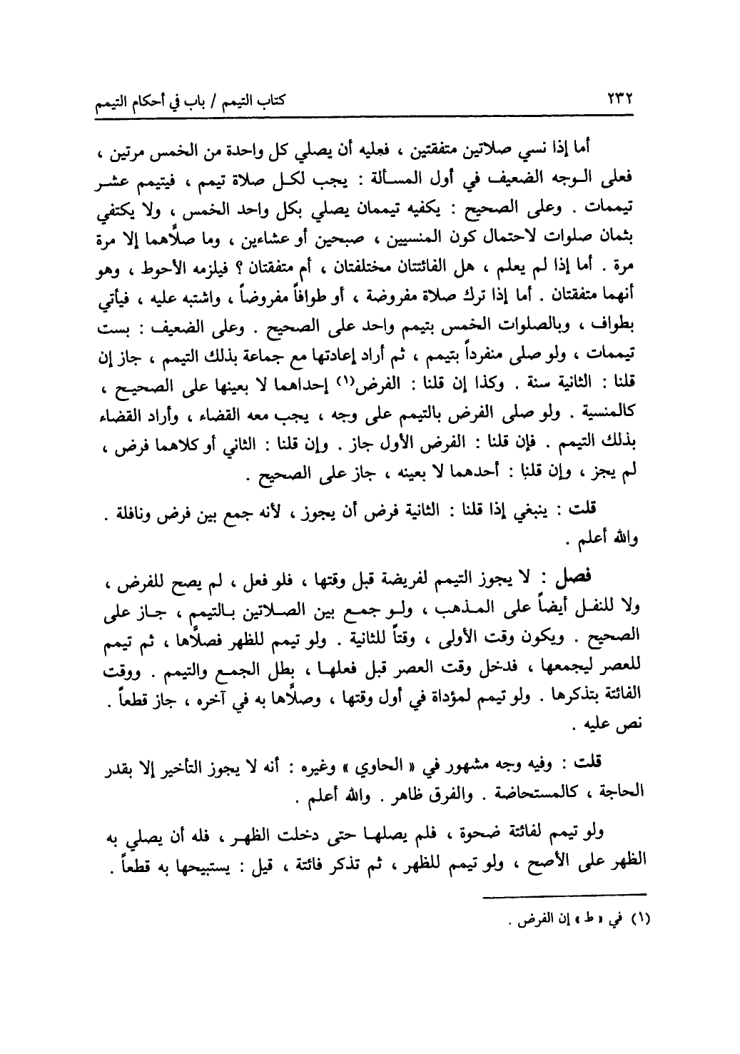 أما إذا نسي صلاتين متفقتين، فعليه أن يصلي كل واحدة من الخمس مرتين، فعلى الوجه الضعيف في أول المسألة: يجب لكل صلاة تيمم، فيتيمم عشر تيممات. وعلى الصحيح: يكفيه تيممان يصلي بكل واحد الخمس، ولا يكتفي بثمان صلوات لاحتمال كون المنسيين، صبحين أو عشاءين، وما صلاهما إلا مرة مرة. أما إذا لم يعلم، هل الفائتتان مختلفتان، أم متفقتان ؟ فيلزمه الاحوط، وهو أنهما متفقتان. إما إذا ترك صلاة مفروضة، أو طوافا مفروضا، واشتبه عليه، فيأتي بطواف، وبالصلوات الخمس بتيمم واحد على الصحيح. وعلى الضعيف: بست تيممات، ولو صلى منفردا بتيمم، ثم أراد إعادتها مع جماعة بذلك التيمم، جاز إن قلنا: الثانية سنة. وكذا إن قلنا: الفرض (1) إحداهما لا بعينها على الصحيح، كالمنسية. ولو صلى الفرض بالتيمم على وجه، يجب معه القضاء، وأراد القضاء بذلك التيمم. فإن قلنا: الفرض الاول جاز. وإن قلنا: الثاني أو كلاهما فرض، لم يجز، وإن قلنا: أحدهما لا بعينه، جاز على الصحيح. قلت: ينبغي إذا قلنا: الثانية فرض أن يجوز، لانه جمع بين فرض ونافلة. والله أعلم. فصل: لا يجوز التيمم لفريضة قبل وقتها، فلو فعل، لم يصح للفرض، ولا للنفل أيضا على المذهب، ولو جمع بين الصلاتين بالتيمم، جاز على الصحيح. ويكون وقت الاولى، وقتا للثانية. ولو تيمم للظهر فصلاها، ثم تيمم للعصر ليجمعها، فدخل وقت العصر قبل فعلها، بطل الجمع والتيمم. ووقت الفائتة بتذكرها. ولو تيمم لمؤداة في أول وقتها، وصلاها به في آخره، جاز قطعا. نص عليه. قلت: وفيه وجه مشهور في (الحاوي) وغيره: أنه لا يجوز التأخير إلا بقدر الحاجة، كالمستحاضة. والفرق ظاهر. والله أعلم. ولو تيمم لفائتة ضحوة، فلم يصلها حتى دخلت الظهر، فله أن يصلي به الظهر على الاصح، ولو تيمم للظهر، ثم تذكر فائتة، قيل: يستبيحها به قطعا.