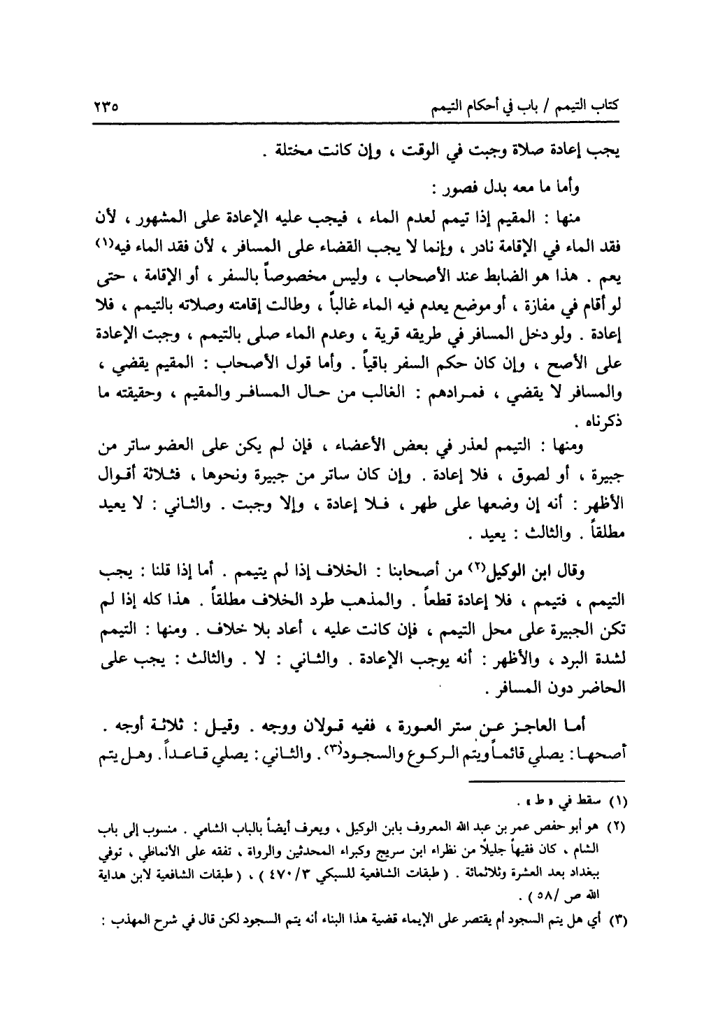 يجب إعادة صلاة وجبت في الوقت، وإن كانت مختلة. وأما ما معه بدل فصور: منها: المقيم إذا تيمم لعدم الماء، فيجب عليه الاعادة على المشهور، لان فقد الماء في الاقامة نادر، وإنما لا يجب القضاء على المسافر، لان فقد الماء فيه (1) يعم. هذا هو الضابط عند الاصحاب، وليس مخصوصا بالسفر، أو الاقامة، حتى لو أقام في مفازة، أو موضع يعدم فيه الماء غالبا، وطالت إقامته وصلاته بالتيمم، فلا إعادة. ولو دخل المسافر في طريقه قرية، وعدم الماء وصلى بالتيمم، وجبت الاعادة على الاصح، وإن كان حكم السفر باقيا. وأما قول الاصحاب: المقيم يقضي، والمسافر لا يقضي، فمرادهم: الغالب من حال المسافر والمقيم، وحقيقته ما ذكرناه. ومنها: التيمم لعذر في بعض الاعضاء، فإن لم يكن على العضو ساتر من جبيرة، أو لصوق، فلا إعادة. وإن كان ساتر من جبيرة ونحوها، فثلاثة أقوال. الاظهر: أنه إن وضعها على طهر، فلا إعادة، وإلا وجبت. والثاني: لا يعيد مطلقا. والثالث: يعيد. وقال ابن الوكيل (2) من أصحابنا: الخلاف إذا لم يتيمم. أما إذا قلنا: يجب التيمم، فتيمم، فلا إعادة قطعا. والمذهب طرد الخلاف مطلقا. هذا كله إذا لم تكن الجبيرة على محل التيمم، فإن كانت عليه، أعاد بلا خلاف. ومنها: التيمم لشدة البرد، والاظهر: أنه يوجب الاعادة. والثاني: لا. والثالث: يجب على الحاضر دون المسافر. أما العاجز عن ستر العورة، ففيه قولان ووجه. وقيل: ثلاثة أوجه. أصحها: يصلي قائما ويتم الركوع والسجود (3)، والثاني: يصلي قاعدا. وهل يتم