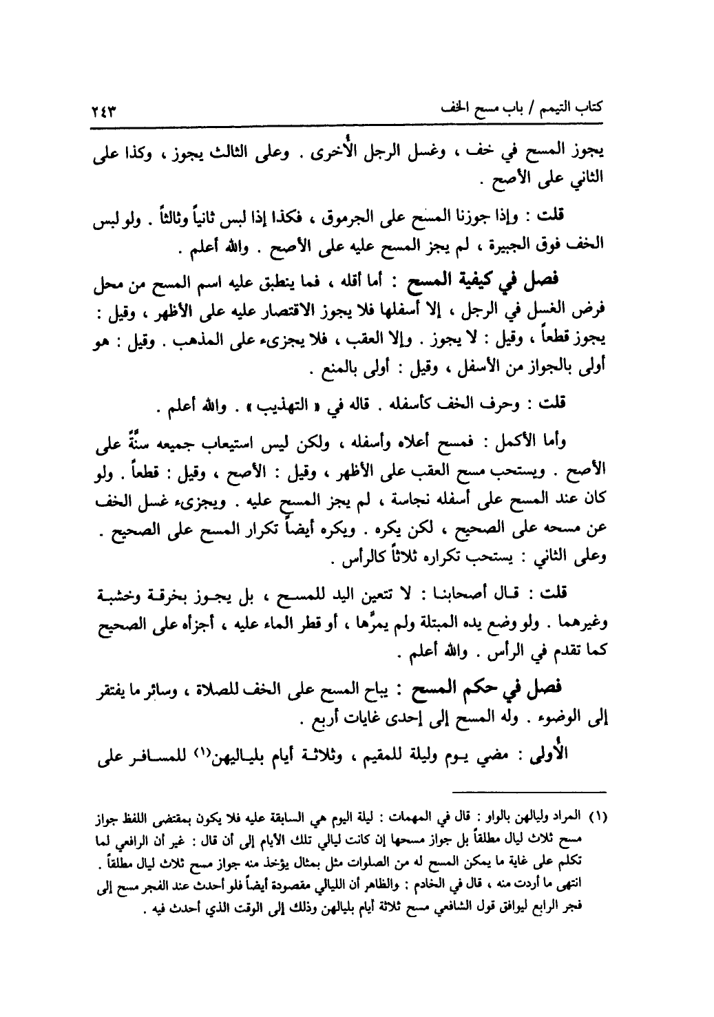 يجوز المسح في خف، وغسل الرجل الاخرى. وعلى الثالث يجوز، وكذا على الثاني على الاصح. قلت: وإذا جوزنا المسح على الجرموق، فكذا إذا لبس ثانيا وثالثا. ولو لبس الخف فوق الجبيرة، لم يجز المسح عليه على الاصح. والله أعلم. فصل في كيفية المسح أما أقله، فما ينطبق عليه اسم المسح من محل فرض الغسل في الرجل، إلا أسفلها، فلا يجوز الاقتصار عليه على الاظهر، وقيل: يجوز قطعا، وقيل: لا يجوز. وإلا العقب، فلا يجزئ على المذهب. وقيل: هو أولى بالجواز من الاسفل، وقيل: أولى بالمنع. قلت: وحرف الخف كأسفله. قاله في (التهذيب). والله أعلم. وأما الاكمل: فمسح أعلاه وأسفله، ولكن ليس استيعاب جميعه سنة على الاصح. ويستحب مسح العقب على الاظهر، وقيل: الاصح، وقيل: قطعا. ولو كان عند المسح على أسفله نجاسة، لم يجز المسح عليه. ويجزئ غسل الخف عن مسحه على الصحيح، لكن يكره. ويكره أيضا تكرار المسح على الصحيح. وعلى الثاني: يستحب تكراره ثلاثا كالرأس. قلت: قال أصحابنا: لا تتعين اليد للمسح، بل يجوز بخرقة وخشبة وغيرهما. ولو وضع يده المبتلة ولم يمرها، أو قطر الماء عليه، أجزأه على الصحيح كما تقدم في الرأس. والله أعلم. فصل في حكم المسح: يباح المسح على الخف للصلاة، وسائر ما يفتقر إلى الوضوء. وله المسح إلى إحدى غايات أربع: الاولى: مضي يوم وليلة للمقيم، وثلاثة أيام بلياليهن (1) للمسافر على