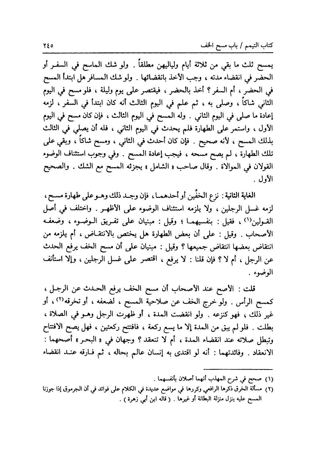 يمسح ثلث ما بقي من ثلاثة أيام ولياليهن مطلقا. ولو شك الماسح في السفر أو الحضر في انقضاء مدته، وجب الاخذ بانقضائها. ولو شك المسافر هل ابتدأ المسح في الحضر، أم السفر ؟ أخذ بالحضر، فيقتصر على يوم وليلة، فلو مسح في اليوم الثاني شاكا، وصلى به، ثم علم في اليوم الثالث أنه كان ابتدأ في السفر، لزمه إعادة ما صلى في اليوم الثاني. وله المسح في اليوم الثالث، فإن كان مسح في اليوم الاول، واستمر على الطهارة فلم يحدث في اليوم الثاني، فله أن يصلي في الثالث بذلك المسح، لانه صحيح. فإن كان أحدث في الثاني، ومسح شاكا، وبقي على تلك الطهارة، لم يصح مسحه، فيجب إعادة المسح. وفي وجوب استئناف الوضوء القولان في الموالاة. وقال صاحب (الشامل) يجزئه المسح مع الشك. والصحيح الاول. الغاية الثانية: نزع الخفين أو أحدهما، فإن وجد ذلك وهو على طهارة مسح، لزمه غسل الرجلين، ولا يلزمه استئناف الوضوء على الاظهر. واختلف في أصل القولين (1)، فقيل: بنفسيهما، وقيل: مبنيان على تفريق الوضوء، وضعفه الاصحاب. وقيل: على أن بعض الطهارة هل يختص بالانتقاض، أم يلزمه من انتقاض بعضها انتقاض جميعها ؟ وقيل: مبنيان على أن مسح الخف يرفع الحدث عن الرجل، أم لا ؟ فإن قلنا: لا يرفع، اقتصر على غسل الرجلين، وإلا استأنف الوضوء. قلت: الاصح عند الاصحاب أن مسح الخف يرفع الحدث عن الرجل، كمسح الرأس. ولو خرج الخف عن صلاحية المسح، لضعفه، أو تخرقه (2)، أو غير ذلك، فهو كنزعه. ولو انقضت المدة، أو ظهرت الرجل وهو في صلاة، بطلت. فلو لم يبق من المدة إلا ما يسع ركعة، فافتتح ركعتين، فهل يصح الافتتاح وتبطل صلاته عند انقضاء المدة، أم لا تنعقد ؟ وجهان في (البحر) أصحهما: الانعقاد. وفائدتهما: أنه لو اقتدى به إنسان عالم بحاله، ثم فارقه عند انقضاء