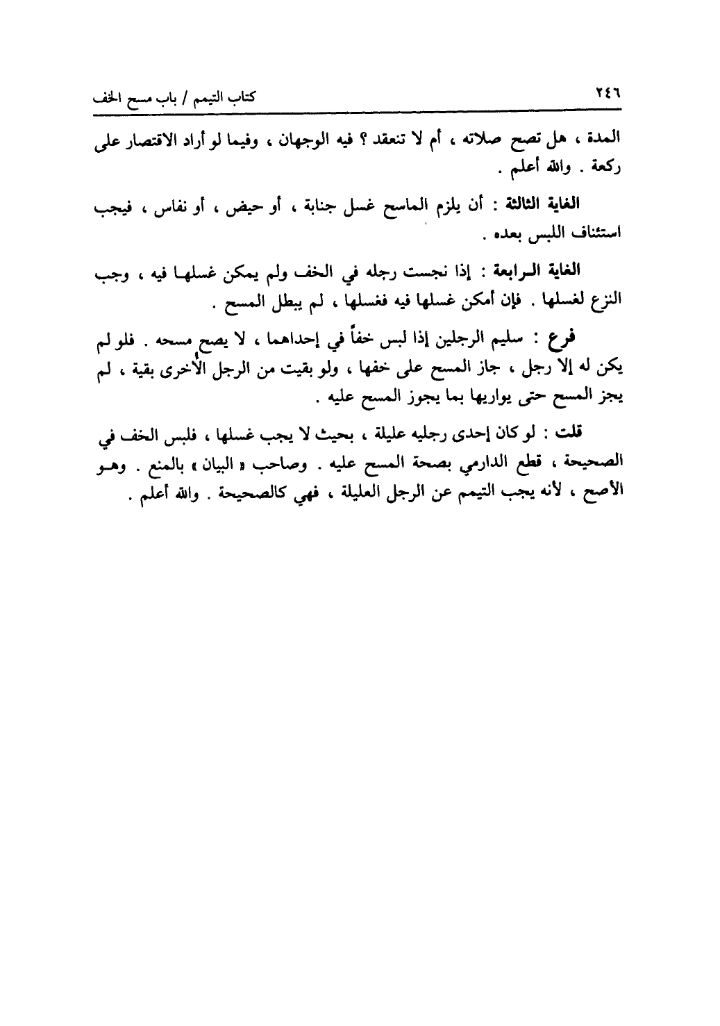 المدة، هل تصح صلاته، أم لا تنعقد ؟ فيه الوجهان، وفيما لو أراد الاقتصار على ركعة. والله أعلم. الغاية الثالثة: أن يلزم الماسح غسل جنابة، أو حيض، أو نفاس، فيجب استئناف اللبس بعده. الغاية الرابعة: إذا نجست رجله في الخف ولم يمكن غسلها فيه، وجب النزع لغسلها. فإن أمكن غسلها فيه فغسلها، لم يبطل المسح. فرع: سليم الرجلين إذا لبس خفا في إحداهما، لا يصح مسحه. فلو لم يكن له إلا رجل، جاز المسح على خفها، ولو بقيت من الرجل الاخرى بقية، لم يجز المسح حتى يواريها بما يجوز المسح عليه. قلت: لو كان إحدى رجليه عليلة، بحيث لا يجب غسلها، فلبس الخف في الصحيحة، قطع الدارمي بصحة المسح عليه. وصاحب (البيان) بالمنع. وهو الاصح، لانه يجب التيمم عن الرجل العليلة، فهي كالصحيحة. والله أعلم.