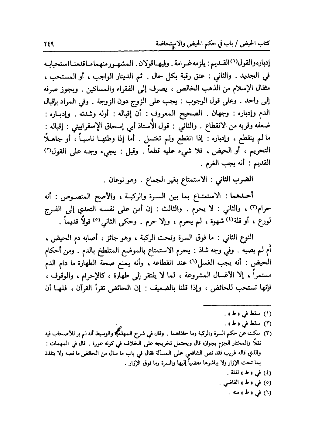 إدباره والقول (1) والقديم: يلزمه غرامة. وفيها قولان. المشهور منهما ما قدمنا استحبابه في الجديد. والثاني: عتق رقبة بكل حال. ثم الدينار الواجب، أو المستحب، مثقال الاسلام من الذهب الخالص، يصرف إلى الفقراء والمساكين. ويجوز صرفه إلى واحد. وعلى قول الوجوب: يجب على الزوج دون الزوجة. وفي المراد بإقبال الدم وإدباره: وجهان. الصحيح المعروف: أن إقباله: أوله وشدته. وإدباره: ضعفه وقربه من الانقطاع. والثاني: قول الاستاذ أبي إسحاق الاسفراييني: إقباله: ما لم ينقطع، وإدباره: إذا انقطع ولم تغتسل. أما إذا وطئها ناسيا، أو جاهلا التحريم، أو الحيض، فلا شئ عليه قطعا. وقيل: يجئ وجه على القول (2) القديم: أنه يجب الغرم. الضرب الثاني: الاستمتاع بغير الجماع. وهو نوعان. أحدهما: الاستمتاع بما بين السرة والركبة، والاصح المنصوص: أنه حرام (3)، والثاني: لا يحرم. والثالث: إن أمن على نفسه التعدي إلى الفرج لورع، أو لقلة (4) شهوة، لم يحرم، وإلا حرم. وحكي الثاني (5) قولا قديما. النوع الثاني: ما فوق السرة وتحت الركبة، وهو جائز، أصابه دم الحيض، أم لم يصبه. وفي وجه شاذ: يحرم الاستمتاع بالموضع المتلطخ بالدم. ومن أحكام الحيض: أنه يجب الغسل (6) عند انقطاعه، وأنه يمنع صحة الطهارة ما دام الدم مستمرا، إلا الاغسال المشروعة، لما لا يفتقر إلى طهارة، كالاحرام، والوقوف، فإنها تستحب للحائض، وإذا قلنا بالضعيف: إن الحائض تقرأ القرآن، فلها أن