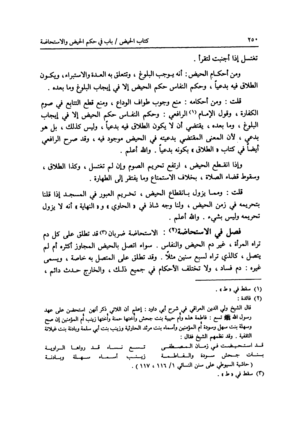 تغتسل إذا أجنبت لتقرأ. ومن أحكام الحيض: أنه يوجب البلوغ، وتتعلق به العدة والاستبراء، ويكون الطلاق فيه بدعيا، وحكم النفاس حكم الحيض إلا في إيجاب البلوغ وما بعده. قلت: ومن أحكامه: منع وجوب طواف الوداع، ومنع قطع التتابع في صوم الكفارة، وقول الامام (1) الرافعي: وحكم النفاس حكم الحيض إلا في إيجاب البلوغ، وما بعده، يقتضي أن لا يكون الطلاق فيه بدعيا، وليس كذلك، بل هو بدعي، لان المعنى المقتضي بدعيته في الحيض موجود فيه، وقد صرح الرافعي أيضا في كتاب (الطلاق) بكونه بدعيا. والله أعلم. وإذا انقطع الحيض، ارتفع تحريم الصوم وإن لم تغتسل، وكذا الطلاق، وسقوط قضاء الصلاة، بخلاف الاستمتاع وما يفتقر إلى الطهارة. قلت: ومما يزول بانقطاع الحيض، تحريم العبور في المسجد إذا قلنا بتحريمه في زمن الحيض، ولنا وجه شاذ في (الحاوي) و (النهاية) أنه لا يزول تحريمه وليس بشئ. والله أعلم. فصل في الاستحاضة (2): الاستحاضة ضربان (3) قد تطلق على كل دم تراه المرأة، غير دم الحيض والنفاس. سواء اتصل بالحيض المجاوز أكثره أم لم يتصل، كالذي تراه لسبع سنين مثلا. وقد تطلق على المتصل به خاصة، ويسمى غيره: دم فساد، ولا تختلف الاحكام في جميع ذلك، والخارج حدث دائم،
