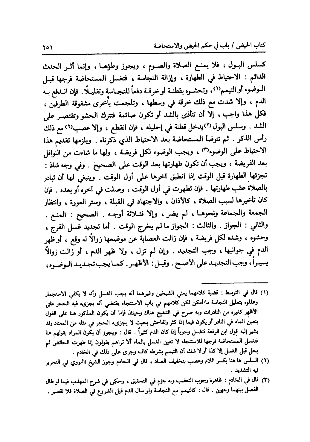 كسلس البول، فلا يمنع الصلاة والصوم، ويجوز وطؤها، وإنما أثر الحدث الدائم: الاحتياط في الطهارة، وإزالة النجاسة، فتغسل المستحاضة فرجها قبل الوضوء أو التيمم (1)، وتحشوه بقطنة أو خرقة دفعا للنجاسة وتقليلا. فإن اندفع به الدم، وإلا شدت مع ذلك خرقة في وسطها، وتلجمت بأخرى مشقوقة الطرفين، فكل هذا واجب، إلا أن تتأذى بالشد أو تكون صائمة فتترك الحشو وتقتصر على الشد. وسلس البول (2) يدخل قطنة في إحليله، فإن انقطع، وإلا عصب (2) مع ذلك رأس الذكر. ثم تتوضأ المستحاضة بعد الاحتياط الذي ذكرناه. ويلزمها تقديم هذا الاحتياط على الوضوء (3)، ويجب الوضوء لكل فريضة، ولها ما شاءت من النوافل بعد الفريضة، ويجب أن تكون طهارتها بعد الوقت على الصحيح. وفي وجه شاذ: تجزئها الطهارة قبل الوقت إذا انطبق آخرها على أول الوقت. وينبغي لها أن تبادر بالصلاة عقب طهارتها. فإن تطهرت في أول الوقت، وصلت في آخره أو بعده. فإن كان تأخيرها لسبب الصلاة، كالاذان، والاجتهاد في القبلة، وستر العورة، وانتظار الجمعة والجماعة ونحوها، لم يضر، وإلا فثلاثة أوجه. الصحيح: المنع. والثاني: الجواز. والثالث: الجواز ما لم يخرج الوقت. أما تجديد غسل الفرج، وحشوه، وشده لكل فريضة، فإن زالت العصابة عن موضعها زوالا له وقع، أو ظهر الدم في جوانبها، وجب التجديد. وإن لم تزل، ولا ظهر الدم، أو زالت زوالا يسيرا، وجب التجديد على الاصح. وقيل: الاظهر. كما يجب تجديد الوضوء،