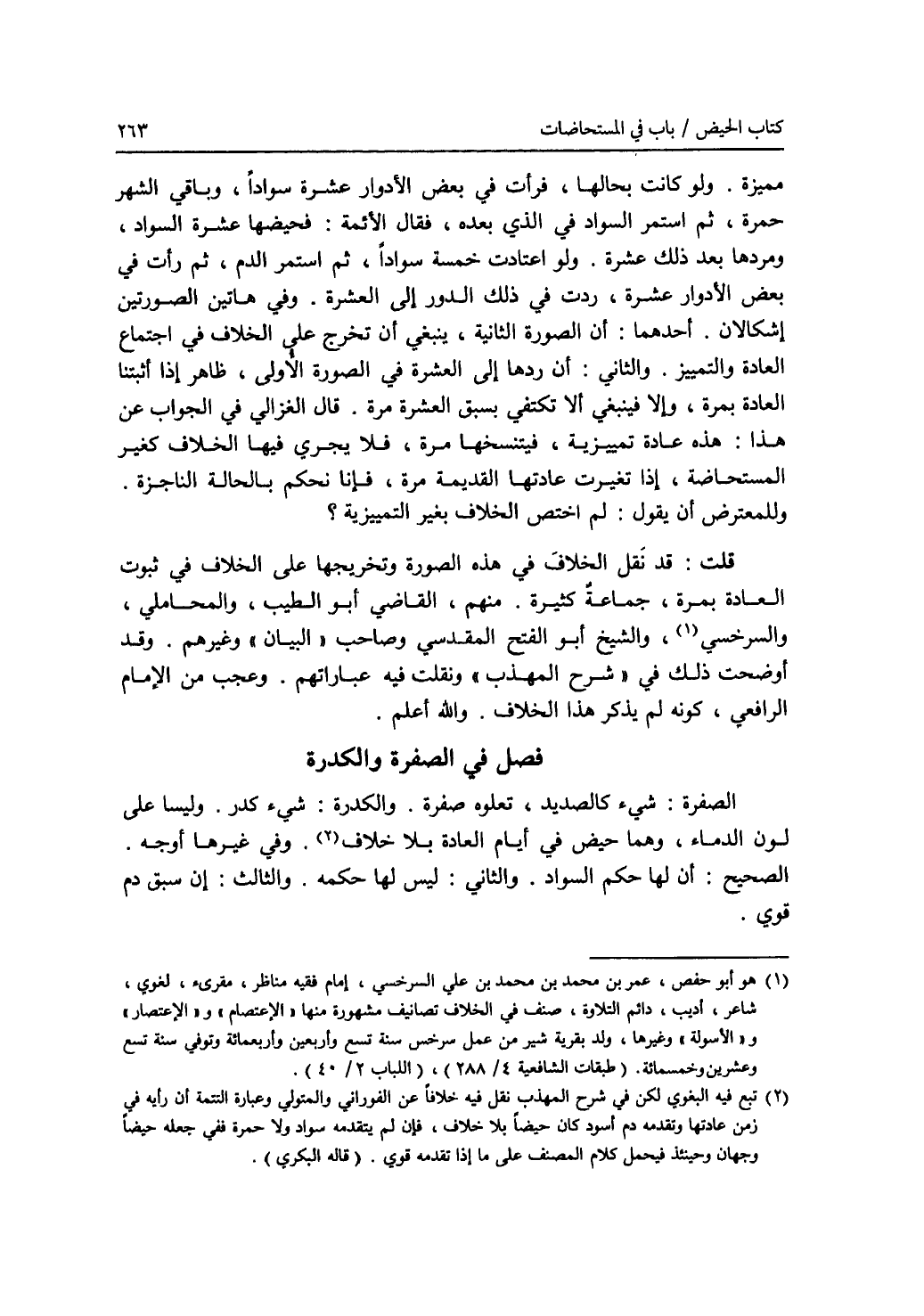 مميزة. ولو كانت بحالها، فرأت في بعض الادوار عشرة سوادا، وباقي الشهر حمرة، ثم استمر السواد في الذي بعده، فقال الائمة: فحيضها عشرة السواد، ومردها بعد ذلك عشرة. ولو اعتادت خمسة سوادا، ثم استمر الدم، ثم رأت في بعض الادوار عشرة، ردت في ذلك الدور إلى العشرة. وفي هاتين الصورتين إشكالان. أحدهما: أن الصورة الثانية، ينبغي أن تخرج على الخلاف في اجتماع العادة والتمييز. والثاني: أن ردها إلى العشرة في الصورة الاولى، طاهر إذا أثبتنا العادة بمرة، وإلا فينبغي ألا تكتفق بسبق العشرة مرة. قال الغزالي في الجواب عن هذا: هذه عادة تمييزية، فتنسخها مرة، فلا يجري فيها الخلاف كغير المستحاضة، إذا تغيرت عادتها القديمة مرة، فإنا نحكم بالحالة الناجزة. وللمعترض أن يقول: لم اختص الخلاف بغير التمييزية ؟ قلت: قد نقل الخلاف في هذه الصورة وتخريجها على الخلاف في ثبوت العادة بمرة، جماعة كثيرة. منهم، القاضي أبو الطيب، والمحاملي، والسرخسي (1)، والشيخ أبو الفتح المقدسي وصاحب (البيان) وغيرهم. وقد أوضحت ذلك في (شرح المهذب) ونقلت فيه عباراتهم. وعجب من الامام الرافعي، كونه لم يذكر هذا الخلاف. والله أعلم. فصل في الصفرة والكدرة الصفرة: شئ كالصديد، تعلوه صفرة. والكدرة: شئ كدر. وليسا على لون الدماء، وهما حيض في أيام العادة بلا خلاف (2). وفي غيرها أوجه. الصحيح: أن لها حكم السواد. والثاني: ليس لها حكمه. والثالث: إن سبق دم قوي.