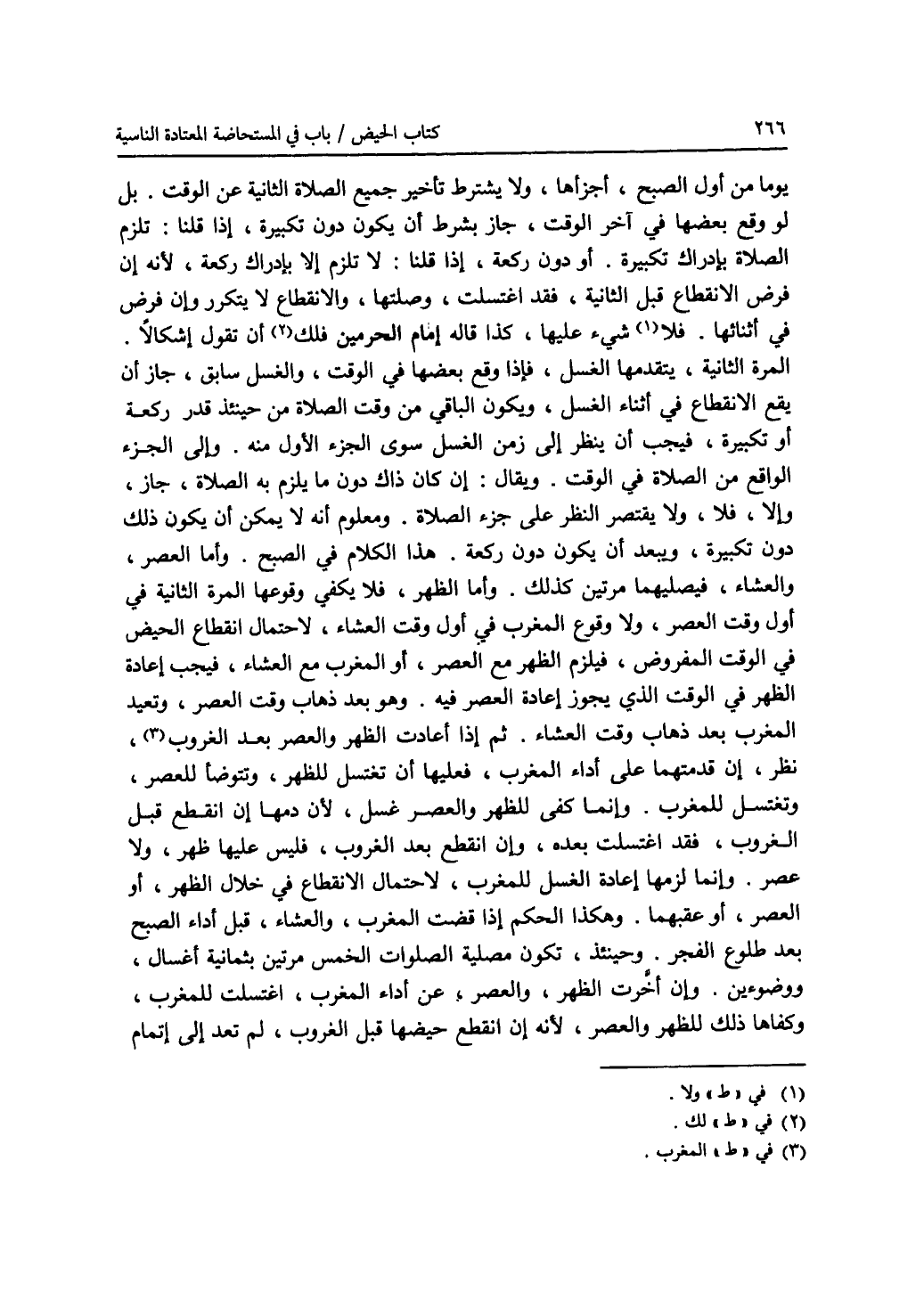 يوما من أول الصبح، أجزأها، ولا يشترط تأخير جميع الصلاة الثانية عن الوقت. بل لو وقع بعضها في آخر الوقت، جاز بشرط أن يكون دون تكبيرة، إذا قلنا: تلزم الصلاة بإدراك تكبيرة. أو دون ركعة، إذا قلنا: لا تلزم إلا بإدراك ركعة، لانه إن فرض الانقطاع قبل الثانية، فقد اغتسلت، وصلتها، والانقطاع لا يتكرر وإن فرض في أثنائها. فلا (1) شئ عليها، كذا قاله إمام الحرمين فلك (2) أن تقول أشكالا. المرة الثانية، يتقدمها الغسل، فإذا وقع بعضها في الوقت، والغسل سابق، جاز أن يقع الانقطاع في أثناء الغسل، ويكون الباقي من وقت الصلاة من حينئذ قدر ركعة أو تكبيرة، فيجب أن ينظر إلى زمن الغسل سوى الجزء الاول منه. وإلى الجزء الواقع من الصلاة في الوقت. ويقال: إن كان ذاك دون ما يلزم به الصلاة، جاز، وإلا، فلا، ولا يقتصر النظر على جزء الصلاة. ومعلوم أنه لا يمكن أن يكون ذلك دون تكبيرة، ويبعد أن يكون دون ركعة. هذا الكلام في الصبح. وأما العصر، والعشاء، فيصليهما مرتين كذلك. وأما الظهر، فلا يكفي وقوعها المرة الثانية في أول وقت العصر، ولا وقوع المغرب في أول وقت العشاء، لاحتمال انقطاع الحيض في الوقت المفروض، فيلزم الظهر مع العصر، أو المغرب مع العشاء، فيجب إعادة الظهر في الوقت الذي يجوز إعادة العصر فيه. وهو بعد ذهاب وقت العصر، وتعيد المغرب بعد ذهاب وقت العشاء. ثم إذا أعادت الظهر والعصر بعد المغرب (3)، نظر، إن قدمتهما على أداء المغرب، فعليها أن تغتسل للظهر، وتتوضأ للعصر، وتغتسل للمغرب. وإنما كفى للظهر والعصر غسل، لان دمها إن انقطع قبل الغروب، فقد اغتسلت بعده. وإن انقطع بعد الغروب، فليس عليها ظهر، ولا عصر. وإنما لزمها إعادة الغسل للمغرب، لاحتمال الانقطاع في خلال الظهر، أو العصر، أو عقبيهما. وهكذا الحكم إذا قضت المغرب، والعشاء، قبل أداء الصبح بعد طلوع الفجر. وحينئذ، تكون مصلية الصلوات الخمس مرتين بثمانية أغسال، ووضوءين. وإن أخرت الظهر، والعصر، عن أداء المغرب، اغتسلت للمغرب، وكفاها ذلك للظهر والعصر، لانه إن انقطع حيضها قبل الغروب، لم تعد إلى إتمام