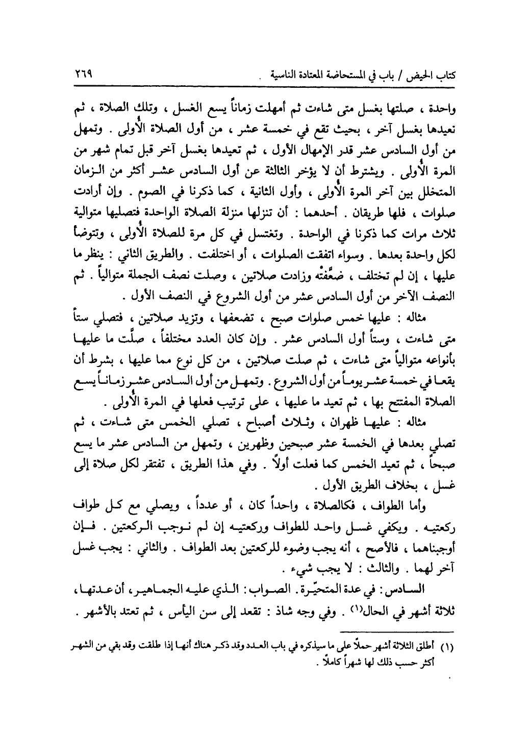 واحدة، صلتها بغسل متى شاءت ثم أمهلت زمانا يسع الغسل، وتلك الصلاة، ثم تعيدها بغسل آخر، بحيث تقع في خمسة عشر، من أول الصلاة الاولى. وتمهل من أول السادس عشر قدر الامهال الاول، ثم تعيدها بغسل آخر قبل تمام شهر من المرة الاولى. ويشترط أن لا يؤخر الثالثة عن أول السادس عشر أكثر من الزمان المتخلل بين آخر المرة الاولى، وأول الثانية، كما ذكرنا في الصوم. وإن أرادت صلوات. فلها طريقان. أحدهما: أن تنزلها منزلة الصلاة الواحدة فتصليها متوالية ثلاث مرات كما ذكرنا في الواحدة. وتغتسل في كل مرة للصلاة الاولى، وتتوضأ لكل واحدة بعدها. وسواء اتفقت الصلوات، أو اختلفت. والطريق الثاني: ينظر ما عليها، إن لم تختلف، ضعفته وزادت صلاتين، وصلت نصف الجملة متواليا. ثم النصف الآخر من أول السادس عشر من أول الشروع في النصف الاول. مثاله: عليها خمس صلوات صبح، تضعفها، وتزيد صلاتين، فتصلي ستا متى شاءت، وستا أول السادس عشر. وإن كان العدد مختلفا، صلت ما عليها بأنواعه متواليا متى شاءت، ثم صلت صلاتين، من كل نوع مما عليها، بشرط أن يقعا في خمسة عشر يوما من أول الشروع. وتمهل من أول السادس عشر زمانا يسع الصلاة المفتتح بها، ثم تعيد ما عليها، على ترتيب فعلها في المرة الاولى. مثاله: عليها ظهران، وثلاث أصباح، تصلي الخمس متى شاءت، ثم تصلي بعدها في الخمسة عشر صبحين وظهرين، وتمهل من السادس عشر ما يسع صبحا، ثم تعيد الخمس كما فعلت أولا. وفي هذا الطريق، تفتقر لكل صلاة إلى غسل، بخلاف الطريق الاول. وأما الطواف، فكالصلاة، واحدا كان، أو عددا، ويصلي مع كل طواف ركعتيه ويكفي غسل واحد للطواف وركعتيه إن لم نوجب الركعتين. فإن أوجبناهما، فالاصح، أنه يجب وضوء للركعتين بعد الطواف. والثاني: يجب غسل آخر لهما. والثالث: لا يجب شئ. السادس: في عدة المتحيرة. الصواب: الذي عليه الجماهير، أن عدتها، ثلاثة أشهر في الحال (1). وفي وجه شاذ: تقعد إلى سن اليأس، ثم تعتد بالاشهر.