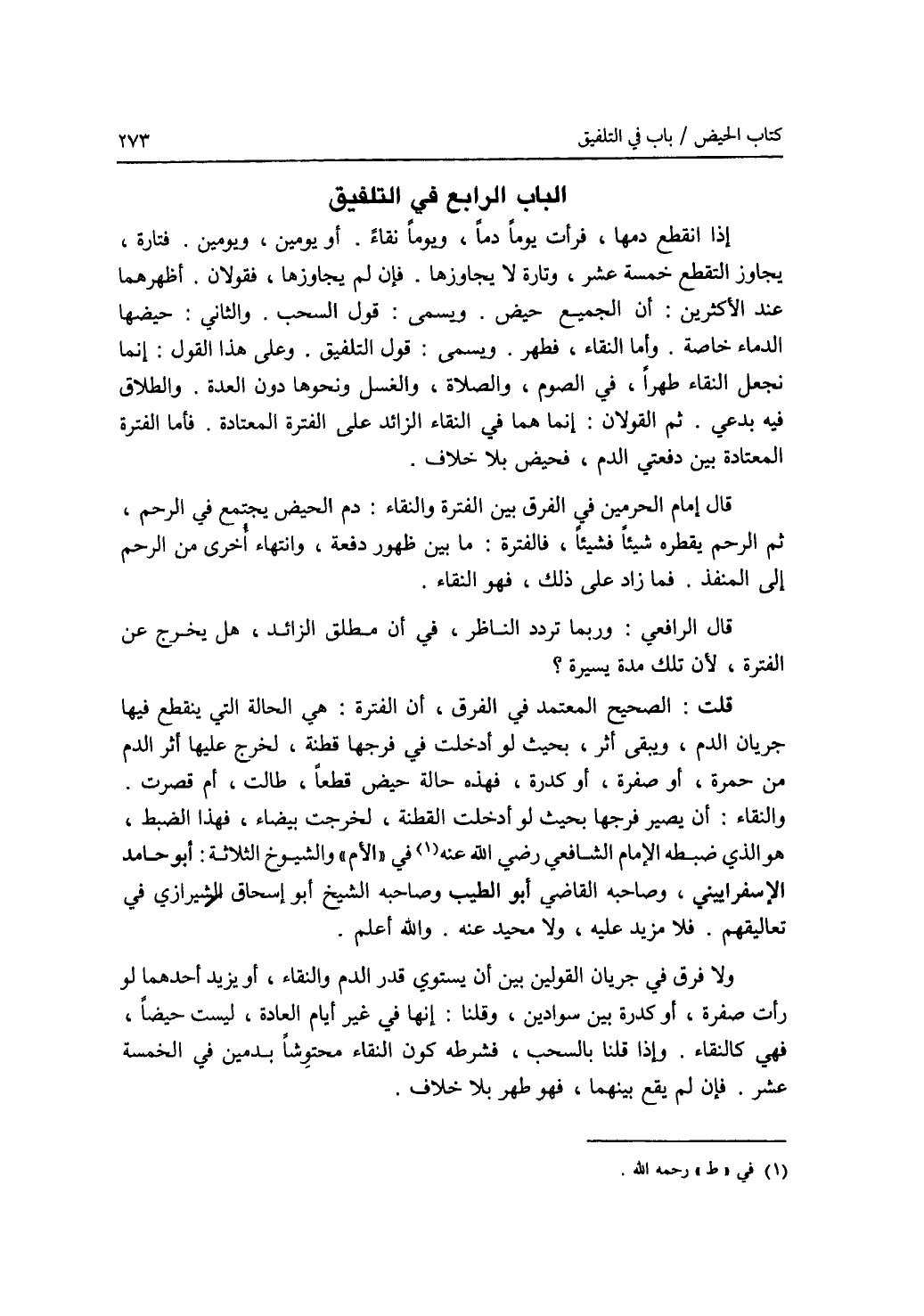 الباب الرابع في التلفيق إذا انقطع دمها، فرأت يوما دما، ويوما نقاء. أو يومين، ويومين. فتارة، يجاوز التقطع خمسة عشر، وتارة لا يجاوزها. فإن لم يجاوزها، فقولان. أظهرهما عند الاكثرين: أن الجميع، حيض. ويسمى: قول السحب. والثاني: حيضها الدماء خاصة. وأما النقاء، فطهر. ويسمى: قول التلفيق. وعلى هذا القول: إنما نجعل النقاء طهرا، في الصوم، والصلاة، والغسل ونحوها دون العدة. والطلاق فيه بدعي. ثم القولان: إنما هما في النقاء الزائد على الفترة المعتادة. فأما الفترة المعتادة بين دفعتي الدم، فحيض بلا خلاف. قال إمام الحرمين في الفرق بين الفترة والنقاء: دم الحيض يجتمع في الرحم، ثم الرحم يقطره شيئا فشيئا، فالفترة: ما بين ظهور دفعة، وانتهاء أخرى من الرحم إلى المنفذ. فما زاد على ذلك، فهو النقاء. قال الرافعي: وربما تردد الناظر، في أن مطلق الزائد، هل يخرج عن الفترة، لان تلك مدة يسيرة ؟ قلت: الصحيح المعتمد في الفرق، أن الفترة: هي الحالة التي ينقطع فيها جريان الدم، ويبقى أثر، بحيث لو أدخلت فرجها قطنة، لخرج عليها أثر الدم من حمرة، أو صفرة، أو كدرة، فهذه حالة حيض قطعا، طالت، أم قصرت. والنقاء: أن يصير فرجها بحيث لو أدخلت القطنة، لخرجت بيضاء، فهذا الضبط، هو الذي ضبطه الامام الشافعي رضي الله عنه (1) في (الام) والشيوخ الثلاثة: أبو حامد الاسفراييني، وصاحبه القاضي أبو الطيب، وصاحبه الشيخ أبو إسحاق الشيرازي في تعاليقهم. فلا مزيد عليه، ولا محيد عنه. والله أعلم. ولا فرق في جريان القولين بين أن يستوي قدر الدم والنقاء، أو يزيد أحدهما لو رأت صفرة، أو كدرة بين سوادين، وقلنا: إنها في غير أيام العادة، ليست حيضا، فهي كالنقاء. وإذا قلنا بالسحب، فشرطه كون النقاء محتوشا بدمين في الخمسة عشر. فإن لم يقع بينهما، فهو طهر بلا خلاف.