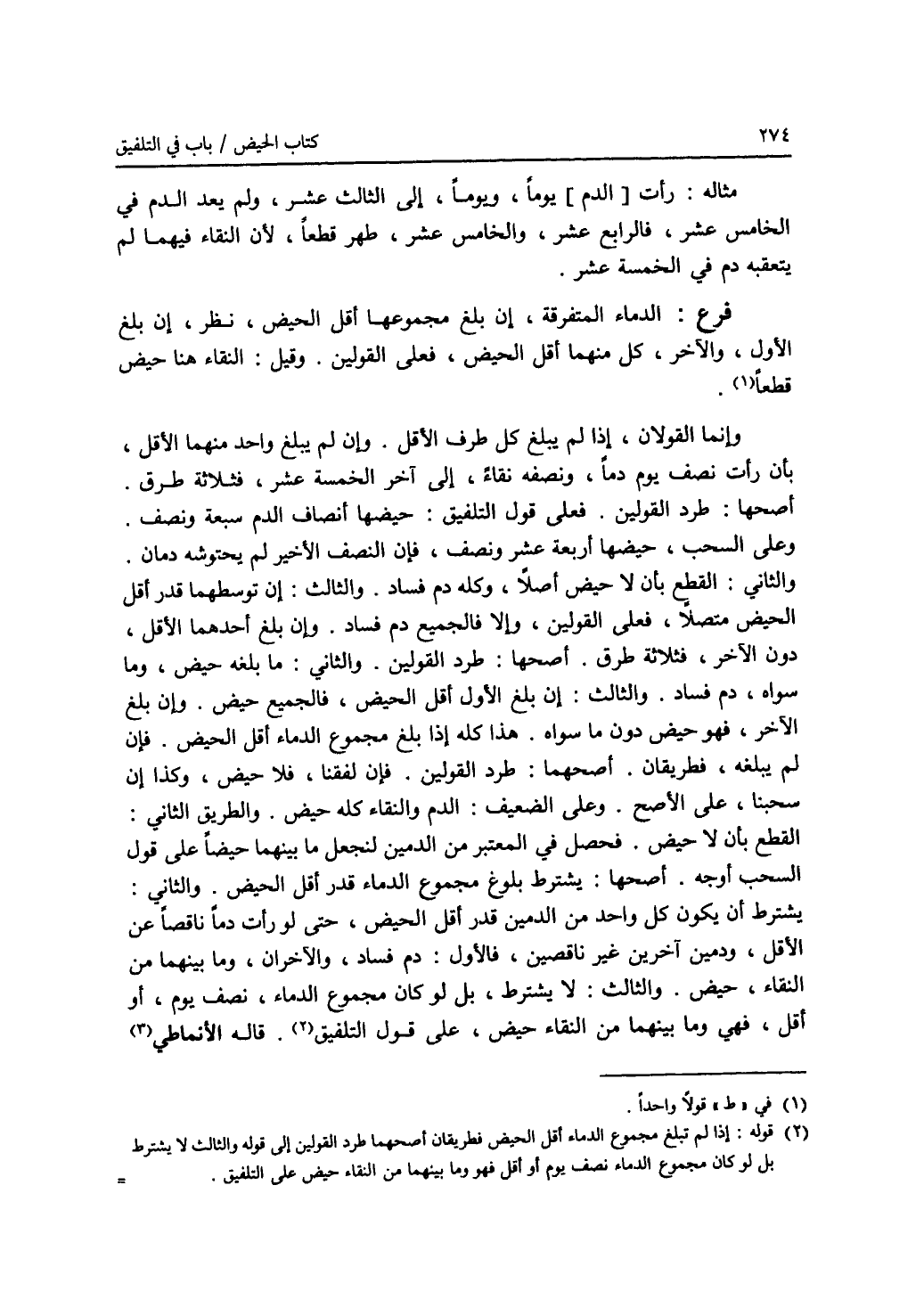 مثاله: رأت (الدم) يوما، ويوما، إلى الثالث عشر، ولم يعد الدم في الخامس عشر، فالرابع عشر، والخامس عشر، طهر قطعا، لان النقاء فيهما لم يتعقبه دم في الخمسة عشر. فرع: الدماء المتفرقة، إن بلغ مجموعها أقل الحيض، نظر، إن بلغ الاول، والآخر، كل منهما أقل الحيض، فعلى القولين. وقيل: النقاء هنا حيض قطعا (1). وإنما القولان، إذا لم يبلغ كل طرف الاقل. وإن لم يبلغ واحد منهما الاقل، بأن رأت نصف يوم دما، ونصفه نقاء، إلى آخر الخمسة عشر، فثلاثة طرق. أصحها: طرد القولين. فعلى قول التلفيق: حيضها أنصاف الدم سبعة ونصف. وعلى السحب، حيضها أربعة عشر ونصف، فإن النصف الاخير لم يحتوشه دمان. والثاني: القطع بأن لا حيض أصلا، وكله دم فساد. والثالث: أن توسطهما قدر أقل الحيض متصلا، فعلى القولين، وإلا فالجميع دم فساد. وإن بلغ أحدهما الاقل، دون الآخر، فثلاثة طرق. أصحها: طرد القولين. والثاني: ما بلغه حيض، وما سواه، دم فساد. والثالث: إن بلغ الاول أقل الحيض، فالجميع حيض. وإن بلغ الآخر، فهو حيض دون ما سواه. هذا كله إذا بلغ مجموع الدماء أقل الحيض. فإن لم يبلغه، فطريقان. أصحهما: طرد القولين. فإن لفقنا، فلا حيض، وكذا إن سحبنا، على الاصح. وعلى الضعيف: الدم والنقاء كله حيض. والطريق الثاني: القطع بأن لا حيض. فحصل في المعتبر من الدمين لنجعل ما بينهما حيضا على قول السحب أوجه. أصحهما: يشترط بلوغ مجموع الدماء قدر أقل الحيض. والثاني: يشترط أن يكون كل واحد من الدمين قدر أقل الحيض، حتى لو رأت دما ناقصا عن الاقل، ودمين آخرين غير ناقصين، فالاول: دم فساد، والآخران، وما بينهما من النقاء، حيض. والثالث: لا يشترط، بل لو كان مجموع الدماء، نصف يوم، أو أقل، فهي وما بينهما من النقاء حيض، على قول التلفيق (2). قاله الانماطي (3).