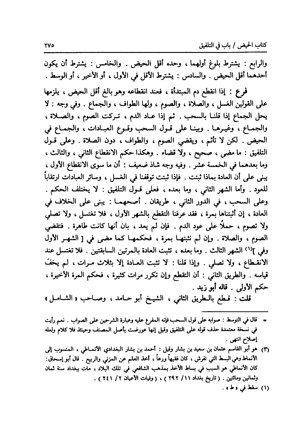والرابع: يشترط بلوغ أولهما، وحده أقل الحيض. والخامس: يشترط أن يكون أحدهما أقل الحيض. والسادس: يشترط الاقل في الاول، أو الاخير، أو الوسط. فرع: إذا انقطع دم المبتدأة، فعند انقطاعه وهو بالغ أقل الحيض، يلزمها على القولين الغسل، والصلاة، والصوم، ولها الطواف، والجماع. وفي وجه: لا يحل الجماع إذا قلنا بالسحب. ثم إذا عاد الدم، تركت الصوم، والصلاة، والجماع، وغيرها. وبينا على قول السحب وقوع العبادات، والجماع في الحيض. لكن لا تأثم، وتقضي الصوم، والطواف، دون الصلاة. وعلى قول التلفيق: ما مضى، صحيح، ولا قضاء. وهكذا حكم الانقطاع الثاني، والثالث، وما بعدهما في الخمسة عشر. وفيه وجه شاذ ضعيف: أن ما سوى الانقطاع الاول، يبنى على أن العادة بماذا ثبتت. فإذا ثبتت، توقفنا في الغسل، وسائر العبادات ارتقابا للعود. وأما الشهر الثاني، وما بعده، فعلى قول التلفيق: لا يختلف الحكم. وعلى السحب، في الدور الثاني، طريقان. أصحهما: يبنى على الخلاف في العادة، إن أثبتناها بمرة، فقد عرفنا التقطع بالشهر الاول، فلا تغتسل، ولا تصلي ولا تصوم، حملا على عود الدم. فإن لم يعد، بان أنها كانت طاهرة، فتقضي الصوم، والصلاة. وإن لم نثبتها بمرة، فحكمها كما مضى في [ الشهر الاول وفي ] (1) الشهر الثالث. وما بعده، تثبت العادة بالمرتين السابقتين. فلا تغتسل عند الانقطاع، ولا تصلي. وإذا قلنا: لا تثبت العادة إلا بثلاث مرات، لم يخف قياسه. والطريق الثاني: أن التقطع وإن تكرر مرات كثيرة، فحكم المرة الاخيرة، حكم الاولى. قاله أبو زيد. قلت: قطع بالطريق الثاني، الشيخ أبو حامد، وصاحب (الشامل)