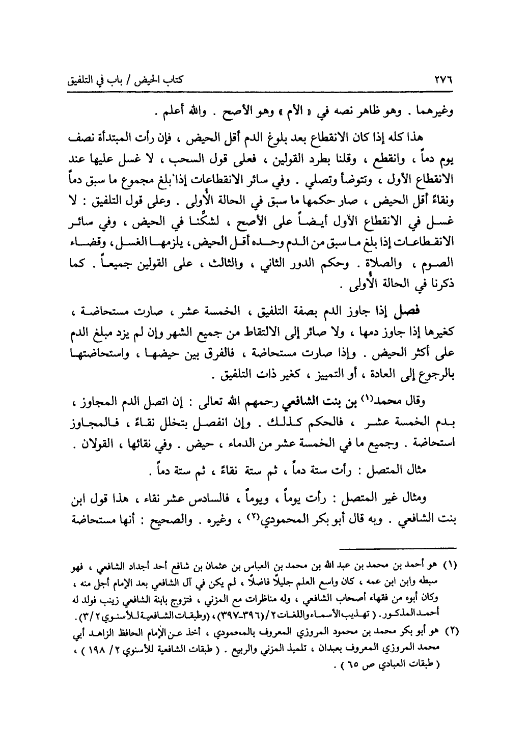 وغيرهما. وهو ظاهر نصه في (الام) وهو الاصح. والله أعلم. هذا كله إذا كان الانقطاع بعد بلوغ الدم أقل الحيض، فإن رأت المبتدأة نصف يوم دما، وانقطع، وقلنا بطرد القولين، فعلى قول السحب، لا غسل عليها عند الانقطاع الاول، وتتوضأ وتصلي. وفي سائر الانقطاعات إذا بلغ مجموع ما سبق دما ونقاء أقل الحيض، صار حكمها ما سبق في الحالة الاولى. وعلى قول التلفيق: لا غسل في الانقطاع الاول أيضا على الاصح، لشكنا في الحيض، وفي سائر الانقطاعات إذا بلغ ما سبق من الدم وحده أقل الحيض، يلزمها الغسل، وقضاء الصوم، والصلاة. وحكم الدور الثاني، والثالث، على القولين جميعا. كما ذكرنا في الحالة الاولى. فصل إذا جاوز الدم بصفة التلفيق، الخمسة عشر، صارت مستحاضة. كغيرها إذا جاوز دمها، ولا صائر إلى الالتقاط من جميع الشهر وإن لم يزد مبلغ الدم على أكثر الحيض. وإذا صارت مستحاضة، فالفرق بين حيضها، واستحاضتها، بالرجوع إلى العادة، أو التمييز، كغير ذات التلفيق. وقال محمد (1) بن بنت الشافعي رحمهم الله تعالى: إن اتصل الدم المجاوز، بدم الخمسة عشر، فالحكم كذلك. وإن انفصل بتخلل نقاء، فالمجاوز استحاضة. وجميع ما في الخمسة عشر من الدماء، حيض. وفي نقائها، القولان. مثال المتصل: رأت ستة دما، ثم ستة نقاء، ثم ستة دما. ومثال غير المتصل: رأت يوما، ويوما، فالسادس عشر نقاء، هذا قول ابن بنت الشافعي. وبه قال أبو بكر المحمودي (2)، وغيره. والصحيح: أنها مستحاضة
