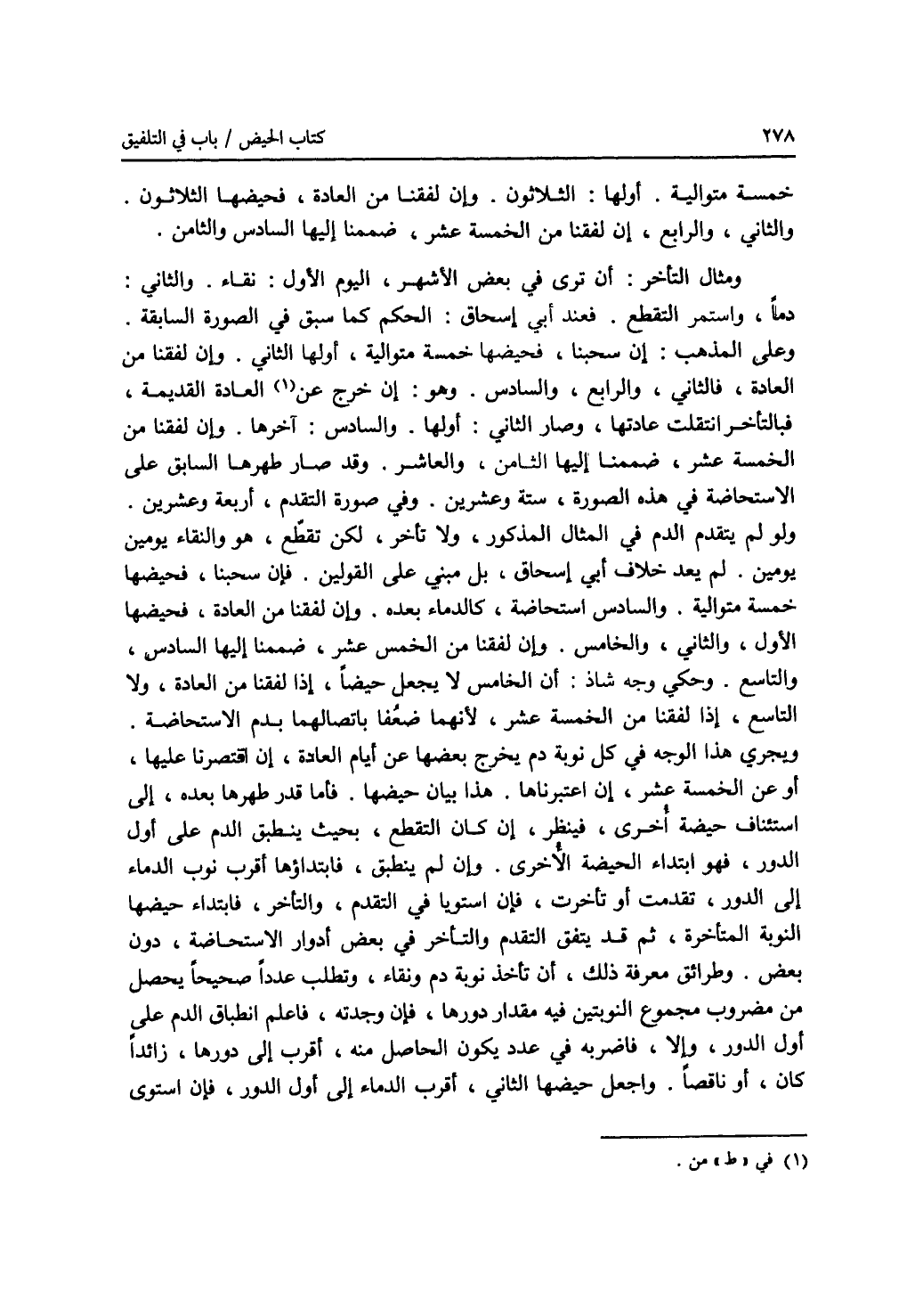 خمسة متوالية. أولها: الثلاثون. وإن لفقنا من العادة، فحيضها الثلاثون. والثاني، والرابع، إن لفقنا من الخمسة عشر، ضممنا إليها السادس، والثامن. ومثال التأخر: أن ترى في بعض الاشهر، اليوم الاول: نقاء. والثاني: دما، واستمر التقطع. فعند أبي إسحاق: الحكم كما سبق في الصورة السابقة. وعلى المذهب: إن سحبنا، فحيضها خمسة متوالية، أولها الثاني. وإن لفقنا من العادة، فالثاني، والرابع، والسادس. وهو: إن خرج عن (1) العادة القديمة، فبالتأخر انتقلت عادتها، وصار الثاني: أولها. والسادس: آخرها. وإن لفقنا من الخمسة عشر، ضممنا إليها الثامن، والعاشر. وقد صار طهرها السابق على الاستحاضة في هذه الصورة، ستة وعشرين. وفي صورة التقدم، أربعة وعشرين. ولو لم يتقدم الدم في المثال المذكور، ولا تأخر، لكن تقطع، هو والنقاء يومين يومين، لم يعد خلاف أبي إسحاق، بل مبني على القولين. فإن سحبنا، فحيضها خمسة متوالية. والسادس استحاضة، كالدماء بعده. وإن لفقنا من العادة، فحيضها الاول، والثاني، والخامس. وإن لفقنا من الخمس عشر، ضممنا إليها السادس، والتاسع. وحكي وجه شاذ: أن الخامس لا يجعل حيضا، إذا لفقنا من العادة، ولا التاسع، إذا لفقنا من الخمسة عشر، لانهما ضعفا باتصالهما بدم الاستحاضة. ويجرى هذا الوجه في كل نوبة دم يخرج بعضها عن أيام العادة، إن اقتصرنا عليها، أو عن الخمسة عشر، إن اعتبرناها. هذا بيان حيضها. فأما قدر طهرها بعده، إلى استئناف حيضة أخرى، فينظر، إن كان التقطع، بحيث ينطبق الدم على أول الدور، فهو ابتداء الحيضة الاخرى. وإن لم ينطبق، فابتداؤها أقرب نوب الدماء إلى الدور، تقدمت أو تأخرت، فإن استويا في التقدم، والتأخر، فابتداء حيضها النوبة المتأخرة، ثم قد يتفق التقدم والتأخر في بعض أدوار الاستحاضة، دون بعض. وطرائق معرفة ذلك، أن تأخذ نوبة دم ونقاء، وتطلب عددا صحيحا يحصل من مضروب مجموع النوبتين فيه مقدار دورها، فإن وجدته، فاعلم انطباق الدم على أول الدور، وإلا، فاضربه في عدد يكون الحاصل منه، أقرب إلى دورها، زائدا كان، أو ناقصا. واجعل حيضها الثاني، أقرب الدماء إلى أول الدور، فإن استوى