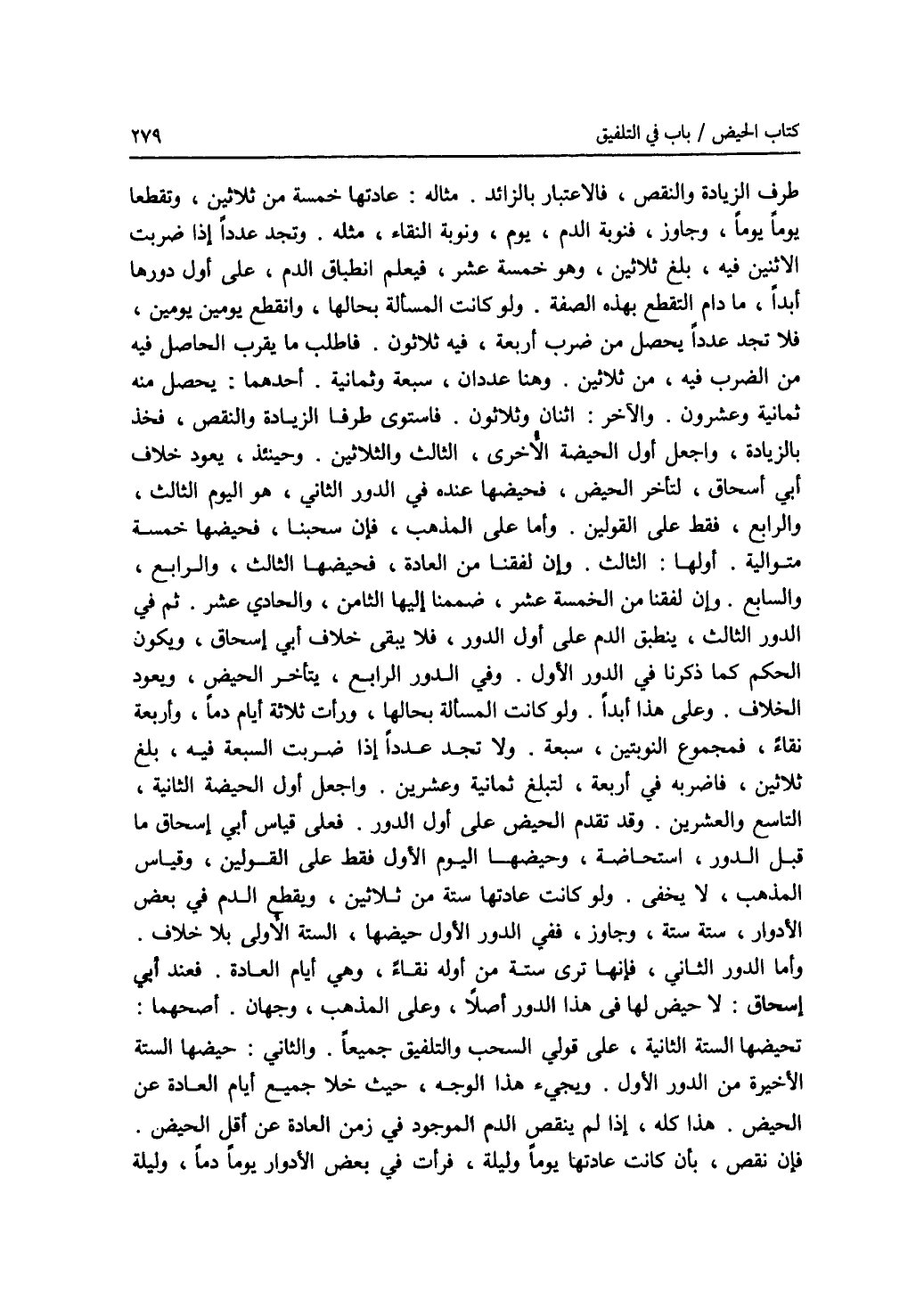 طرف الزيادة والنقص، فالاعتبار بالزائد. مثاله: عادتها خمسة من ثلاثين، وتقطعا يوما يوما، وجاوز، فنوبة الدم، يوم، ونوبة النقاء، مثله. وتجد عددا إذا ضربت الاثنين فيه، بلغ ثلاثين، وهو خمسة عشر، فيعلم انطباق الدم، على أول دورها أبدا، ما دام التقطع بهذه الصفة. ولو كانت المسألة بحالها، وانقطع يومين يومين، فلا تجد عددا يحصل من ضرب أربعة، فيه ثلاثون. فاطلب ما يقرب الحاصل فيه من الضرب فيه، من ثلاثين، وهنا عددان، سبعة وثمانية. أحدهما: يحصل منه ثمانية وعشرون. والآخر: اثنان وثلاثون. فاستوى طرفا الزيادة والنقص، فخذ بالزيادة، واجعل أول الحيضة الاخرى، الثالث والثلاثين. وحينئذ، يعود خلاف أبي إسحاق، لتأخر الحيض، فحيضها عنده في الدور الثاني، هو اليوم الثالث، والرابع، فقط على القولين. وأما على المذهب، فإن سحبنا، فحيضها خمسة متوالية. أولها: الثالث. وإن لفقنا من العادة، فحيضها الثالث، والرابع، والسابع. وإن لفقنا من الخمسة عشر، ضممنا إليها الثامن، والحادي عشر. ثم في الدور الثالث، ينطبق الدم على أول الدور، فلا يبقى خلاف أبي إسحاق، ويكون الحكم كما ذكرنا في الدور الاول. وفي الدور الرابع، يتأخر الحيض، ويعود الخلاف. وعلى هذا أبدا. ولو كانت المسألة بحالها، ورأت ثلاثة أيام دما، وأربعة نقاء، فمجموع النوبتين، سبعة. ولا تجد عددا إذا ضربت السبعة فيه، بلغ ثلاثين، فاضربه في أربعة، لتبلغ ثمانية وعشرين. واجعل أول الحيضة الثانية، التاسع والعشرين. وقد تقدم الحيض على أول الدور. فعلى قياس أبي إسحاق ما قبل الدور، استحاضة، وحيضها اليوم الاول فقط على القولين. وقياس المذهب، لا يخفى. ولو كانت عادتها ستة من ثلاثين، ويقطع الدم في بعض الادوار، ستة ستة، وجاوز، ففي الدور الاول حيضها، الستة الاولى بلا خلاف. وأما الدور الثاني، فإنها ترى ستة من أوله نقاء، وهي أيام العادة. فعند أبي إسحاق: لا حيض لها في هذا الدور أصلا، وعلى المذهب، وجهان. أصحهما: تحيضها الستة الثانية، على قولي السحب والتلفيق جميعا. والثاني: حيضها الستة الاخيرة من الدور الاول. ويجئ هذا الوجه، حيث خلا جميع أيام العادة عن الحيض. هذا كله، إذا لم ينقص الدم الموجود في زمن العادة عن أقل الحيض. فإن نقص، بأن كانت عادتها يوما وليلة، فرأت في بعض الادوار يوما دما، وليلة
