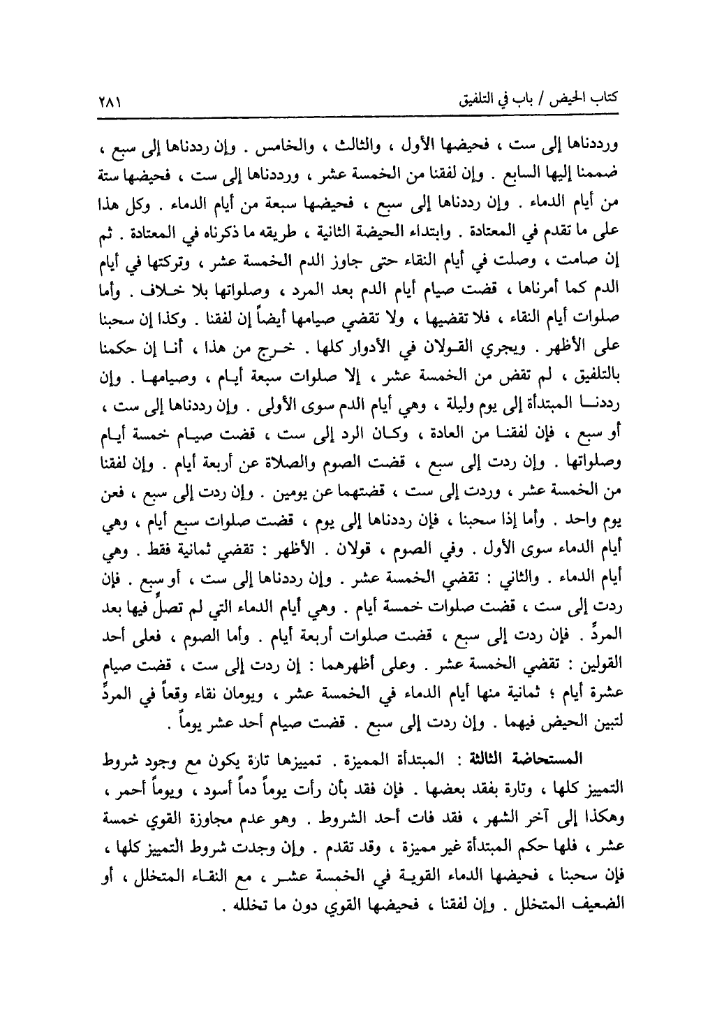 ورددناها إلى ست، فحيضها الاول، والثالث، والخامس. وإن رددناها إلى سبع، ضممنا إليها السابع. وإن لفقنا من الخمسة عشر، ورددناها إلى ست، فحيضها ستة من أيام الدماء. وإن رددناها إلى سبع، فحيضها سبعة من أيام الدماء. وكل هذا على ما تقدم في المعتادة. وابتداء الحيضة الثانية، طريقه ما ذكرناه في المعتادة. ثم إن صامت، وصلت في أيام النقاء حتى جاوز الدم الخمسة عشر، وتركتها في أيام الدم كما أمرناها، قضت صيام أيام الدم بعد المرد، وصلواتها بلا خلاف. وأما صلوات أيام النقاء، فلا تقضيها، ولا تقضي صيامها أيضا إن لفقنا. وكذا إن سحبنا على الاظهر. ويجري القولان في الادوار كلها. خرج من هذا، أنا إن حكمنا بالتلفيق، لم تقض من الخمسة عشر، إلا صلوات سبعة أيام، وصيامها. وإن رددنا المبتدأة إلى يوم وليلة، وهي أيام الدم سوى الاولى. وإن رددناها إلى ست، أو سبع فإن لفقنا من العادة، وكان الرد إلى ست، قضت صيام خمسة أيام وصلواتها. وإن ردت إلى سبع، قضت الصوم والصلاة عن أربعة أيام. وإن لفقنا من الخمسة عشر، وردت إلى ست، قضتهما عن يومين. وإن ردت إلى سبع، فعن يوم واحد. وأما إذا سحبنا، فإن رددناها إلى يوم، قضت صلوات سبعة أيام، وهي أيام الدماء سوى الاول. وفي الصوم، قولان. الاظهر: تقضي ثمانية فقط. وهي أيام الدماء. والثاني: تقضي الخمسة عشر. وإن رددناها إلى ست، أو سبع. فإن ردت إلى ست، قضت صلوات خمسة أيام. وهي أيام الدماء التي لم تصل فيها بعد المرد. فإن ردت إلى سبع، قضت صلوات أربعة أيام. وأما الصوم، فعلى أحد القولين: تقضي الخمسة عشر. وعلى أظهرهما: إن ردت إلى ست، قضت صيام عشرة أيام، ثمانية منها أيام الدماء في الخمسة عشر، ويومان نقاء وقعا في المرد لتبين الحيض فيهما. وإن ردت إلى سبع، قضت صيام أحد عشر يوما. المستحاضة الثالثة: المبتدأة المميزة. تمييزها تارة يكون مع وجود شروط التمييز كلها، وتارة بفقد بعضها. فإن فقد بأن رأت يوما دما أسود، ويوما أحمر، وهكذا إلى آخر الشهر، فقد فات أحد الشروط. وهو عدم مجاوزة القوي خمسة عشر، فلها حكم المبتدأة غير مميزة، وقد تقدم. وإن وجدت شروط التمييز كلها، فإن سحبنا، فحيضها الدماء القوية في الخمسة عشر، مع النقاء المتخلل، أو الضعيف المتخلل. وإن لفقنا، فحيضها القوي دون ما تخلله.