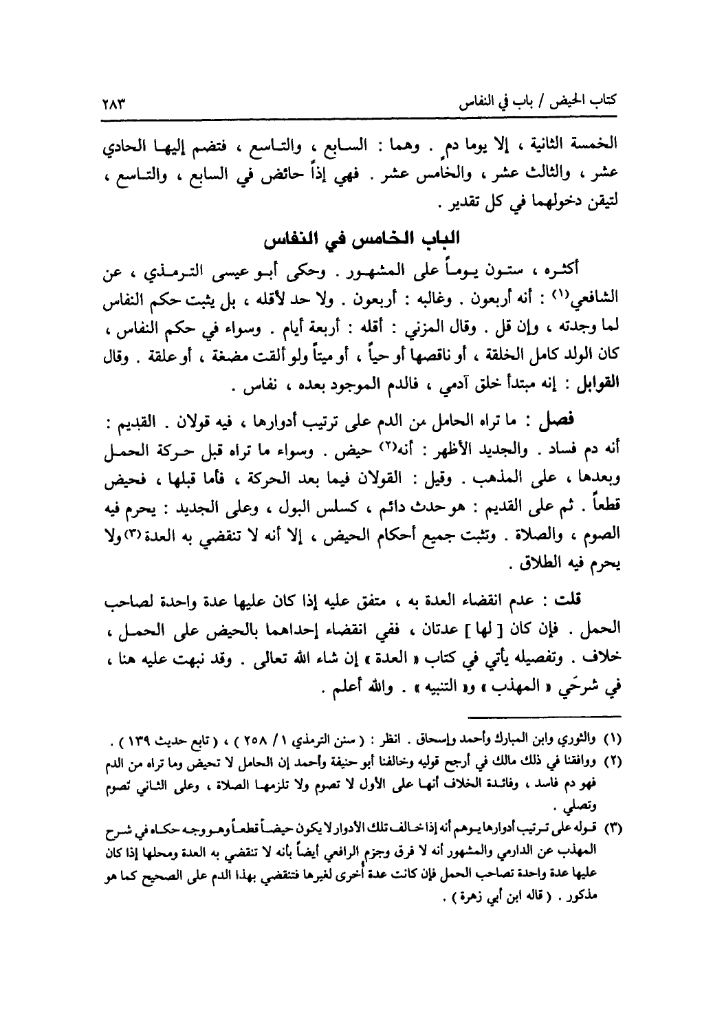 الباب الخامس في النفاس أكثره، ستون يوما على المشهور. وحكى أبو عيسى الترمذي، عن الشافعي (1): أنه أربعون. وغالبه: أربعون. ولا حد لاقله، بل يثبت حكم النفاس لما وجدته، وإن قل. وقال المزني: أقله: أربعة أيام. وسواء في حكم النفاس، كان الولد كامل الخلقة، أو ناقصها، أو حيا أو ميتا ولو ألقت مضغة، أو علقة. وقال القوابل: إنه مبتدأ خلق آدمي، فالدم الموجود بعده، نفاس. فصل: ما تراه الحامل من الدم على ترتيب أدوارها، فيه قولان. القديم: أنه دم فساد. والجديد الاظهر: أنه (2) حيض. وسواء ما تراه قبل حركة الحمل وبعدها، على المذهب. وقيل: القولان فيما بعد الحركة، فأما قبلها، فحيض قطعا. ثم على القديم: هو حدث دائم، كسلس البول. وعلى الجديد: يحرم فيه الصوم، والصلاة. وتثبت جميع أحكام الحيض، إلا أنه لا تنقضي به العدة (3). ولا يحرم فيه الطلاق. قلت: عدم انقضاء العدة به، متفق عليه إذا كان عليها عدة واحدة لصاحب الحمل. فإن كان (لها) عدتان، ففي انقضاء إحداهما بالحيض على الحمل، خلاف. وتفصيله يأتي في كتاب (العدة) إن شاء الله تعالى. وقد نبهت عليه هنا في شرحي (المهذب) و (التنبيه). والله أعلم.