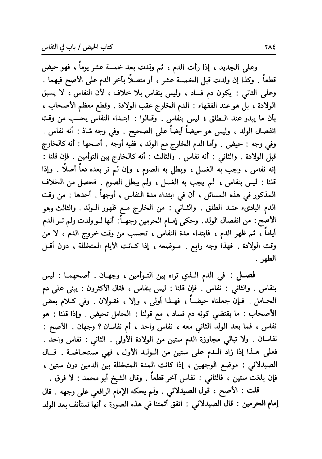 وعلى الجديد، إذا رأت الدم، ثم ولدت بعد خمسة عشر يوما، فهو حيض قطعا. وكذا إن ولدت قبل الخمسة عشر، أو متصلا بآخر الدم على الاصح فيهما. وعلى الثاني: يكون دم فساد، وليس بنفاس بلا خلاف، لان النفاس، لا يسبق الولادة، بل هو عند الفقهاء: الدم الخارج عقب الولادة. وقطع معظم الاصحاب، بأن ما يبدو عند الطلق، ليس بنفاس. وقالوا: ابتداء النفاس يحسب من وقت انفصال الولد، وليس هو حيضا أيضا على الصحيح. وفي وجه شاذ: أنه نفاس. وفي وجه: حيض. وأما الدم الخارج مع الولد، ففيه أوجه. أصحها: أنه كالخارج قبل الولادة. والثاني: أنه نفاس. والثالث: أنه كالخارج بين التوأمين. فإن قلنا: إنه نفاس، وجب به الغسل، وبطل به الصوم، وإن لم تر بعده دما أصلا. وإذا قلنا: ليس بنفاس، لم يجب به الغسل، ولم يبطل الصوم. فحصل من الخلاف المذكور في هذه المسائل، أن في ابتداء مدة النفاس، أوجها. أحدها: من وقت الدم البادئ عند الطلق. والثاني: من الخارج مع ظهور الولد. والثالث وهو الاصح: من انفصال الولد. وحكى إمام الحرمين وجها: أنها لو ولدت ولم تر الدم أياما، ثم ظهر الدم، فابتداء مدة النفاس، تحسب من وقت خروج الدم، لا من وقت الولادة. فهذا وجه رابع. وموضعه، إذا كانت الايام المتخللة، دون أقل الطهر. فصل: في الدم الذي تراه بين التوأمين، وجهان. أصحهما: ليس بنفاس. والثاني: نفاس. فإن قلنا: ليس بنفاس، فقال الاكثرون: يبنى على دم الحامل. فإن جعلناه حيضا، فهذا أولى، وإلا، فقولان. وفي كلام بعض الاصحاب: ما يقتضي كونه دم فساد، مع قولنا: الحامل تحيض. وإذا قلنا: هو نفاس، فما بعد الولد الثاني معه، نفاس واحد، أم نفاسان ؟ وجهان. الاصح: نفاسان. ولا تبالي مجاوزة الدم ستين من الولادة الاولى. الثاني: نفاس واحد. فعلى هذا إذا زاد الدم على ستين من الولد الاول، فهي مستحاضة. قال الصيدلاني: موضع الوجهين، إذا كانت المدة المتخللة بين الدمين دون الستين، فإن بلغت ستين، فالثاني: نفاس آخر قطعا. وقال الشيخ أبو محمد: لا فرق. قلت: الاصح، قول الصيدلاني. ولم يحكه الامام الرافعي على وجهه. قال إمام الحرمين: قال الصيدلاني: اتفق أئمتنا في هذه الصورة، أنها تستأنف بعد الولد