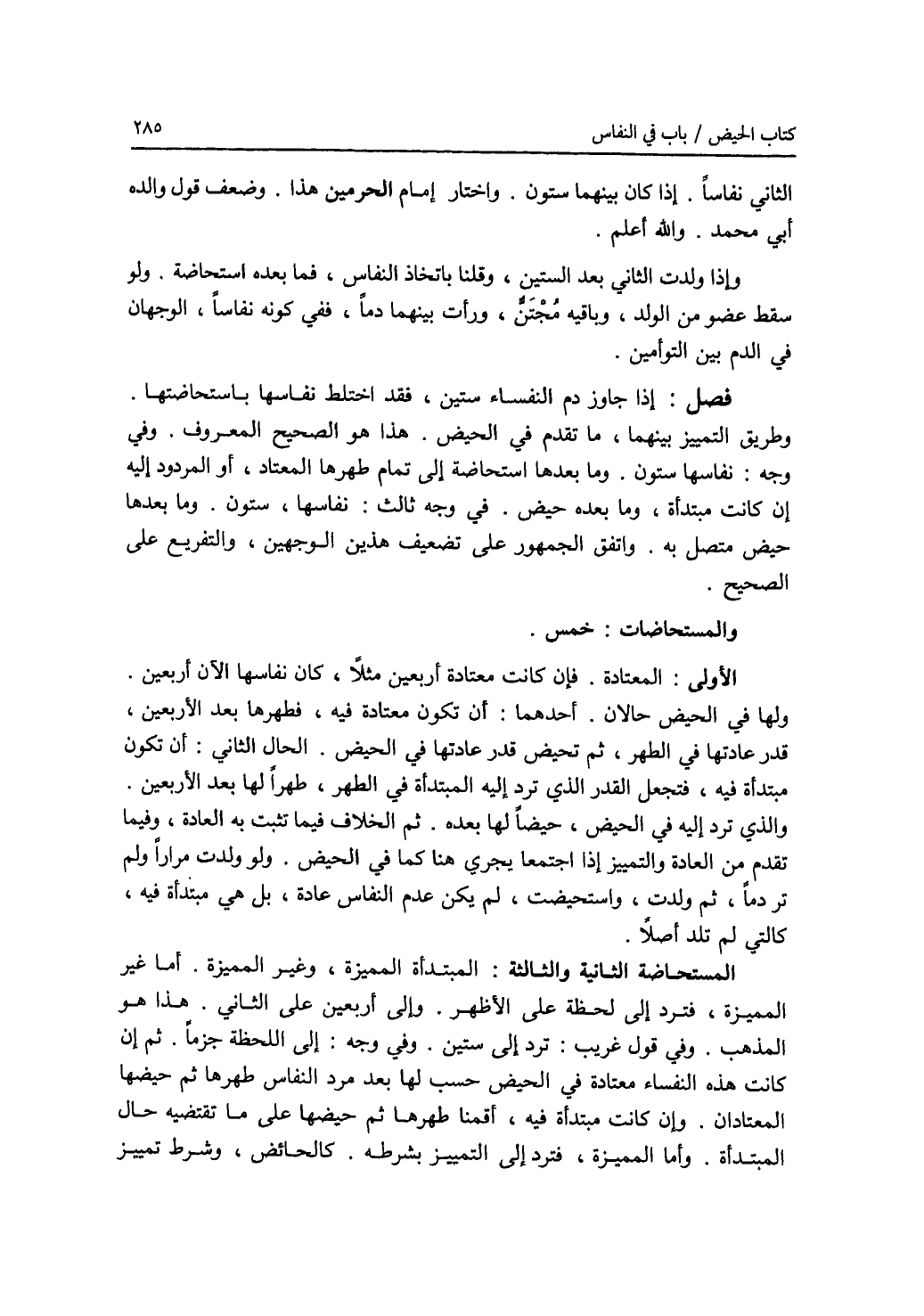 الثاني نفاسا. إذا كان بينهما ستون. واختار إمام الحرمين هذا. وضعف قول والده أبي محمد. والله أعلم. وإذا ولدت الثاني بعد الستين، وقلنا باتخاذ النفاس، فما بعده استحاضة. ولو سقط عضو من الولد، وباقيه مجتن، ورأت بينهما دما، ففي كونه نفاسا، الوجهان في الدم بين التوأمين. فصل: إذا جاوز دم النفساء ستين، فقد اختلط نفاسها باستحاضتها. وطريق التمييز بينهما، ما تقدم في الحيض. هذا هو الصحيح المعروف. وفي وجه: نفاسها ستون. وما بعدها استحاضة إلى تمام طهرها المعتاد، أو المردود إليه إن كانت مبتدأة، وما بعده حيض. في وجه ثالث: نفاسها، ستون. وما بعدها حيض متصل به. واتفق الجمهور على تضعيف هذين الوجهين، والتفريع على الصحيح. والمستحاضات: خمس. الاولى: المعتادة. فإن كانت معتادة أربعين مثلا، كان نفاسها الآن أربعين. ولها في الحيض حالان. أحدهما: أن تكون معتادة فيه، فطهرها بعد الاربعين، قدر عادتها في الطهر، ثم تحيض قدر عادتها في الحيض. الحال الثاني: أن تكون مبتدأة فيه، فتجعل القدر الذي ترد إليه المبتدأة في الطهر، طهرا لها بعد الاربعين. والذي ترد إليه في الحيض، حيضا لها بعده. ثم الخلاف فيما تثبت به العادة، وفيما تقدم من العادة والتمييز إذا اجتمعا يجري هنا كما في الحيض. ولو ولدت مرارا ولم تر دما، ثم ولدت، واستحيضت، لم يكن عدم النفاس عادة، بل هي مبتدأة فيه، كالتي لم تلد أصلا. المستحاضة الثانية والثالثة: المبتدأة المميزة، وغير المميزة. أما غير المميزة، فترد إلى لحظة على الاظهر. وإلى أربعين على الثاني. هذا هو المذهب. وفي قول غريب: ترد إلى ستين. وفي وجه: إلى اللحظة جزما. ثم إن كانت هذه النفساء معتادة في الحيض حسب لها بعد مرد النفاس طهرها ثم حيضها المعتادان. وإن كانت مبتدأة فيه، أقمنا طهرها ثم حيضها على ما تقتضيه حال المبتدأة. وأما المميزة، فترد إلى التمييز بشرطه. كالحائض، وشرط تمييز