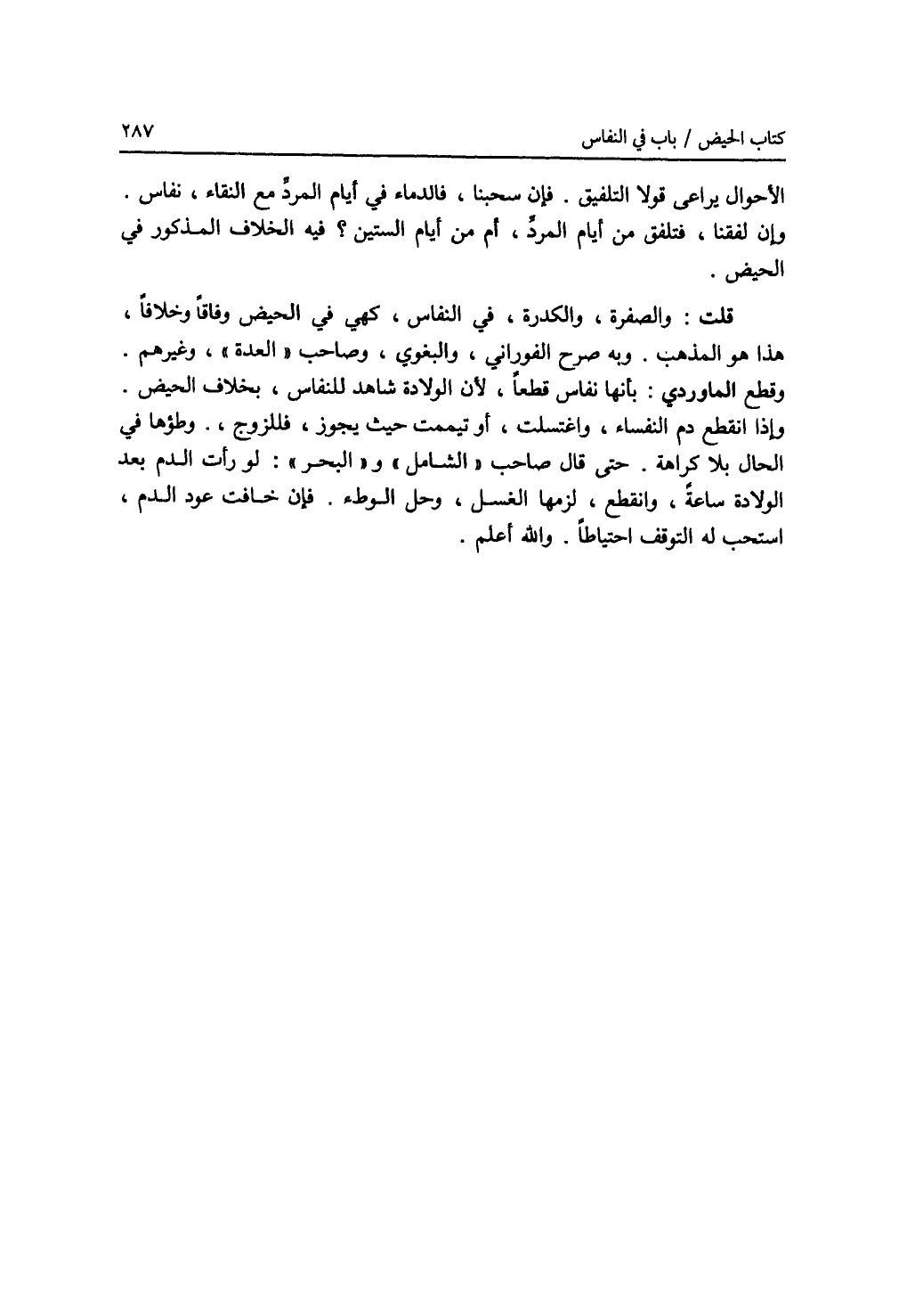 الاحوال يراعى قولا التلفيق. فإن سحبنا، فالدماء في أيام المرد مع النقاء، نفاس. وإن لفقنا، فتلفق من أيام المرد، أم من أيام الستين ؟ فيه الخلاف المذكور في الحيض. قلت: والصفرة، والكدرة، في النفاس، كهي في الحيض وفاقا وخلافا، هذا هو المذهب. وبه صرح الفوراني، والبغوي، وصاحب (العدة)، وغيرهم. وقطع الماوردي: بأنها نفاس قطعا، لان الولادة شاهد للنفاس، بخلاف الحيض. وإذا انقطع دم النفساء، واغتسلت، أو تيممت حيث يجوز، فللزوج وطؤها في الحال بلا كراهة. حتى قال صاحب (الشامل) و (البحر): لو رأت الدم بعد الولادة ساعة، وانقطع، لزمه الغسل، وحل الوطئ. فإن خافت عود الدم، استحب له التوقف احتياطا. والله أعلم.