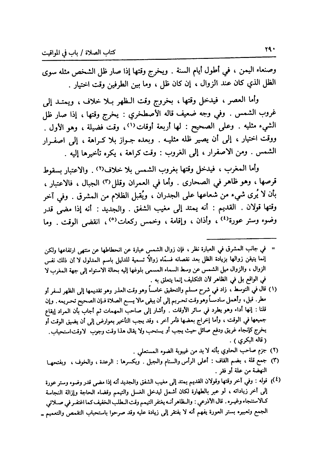 وصنعاء اليمن، في أطول أيام السنة. ويخرج وقتها إذا صار ظل الشخص مثله سوى الظل الذي كان عند الزوال، إن كان ظل، وما بين الطرفين وقت اختيار. وأما العصر، فيدخل وقتها، بخروج وقت الظهر بلا خلاف، ويمتد إلى غروب الشمس. وفي وجه ضعيف قاله الاصطخري: يخرج وقتها، إذا صار ظل الشئ مثليه. وعلى الصحيح: لها أربعة أوقات (1)، وقت فضيلة، وهو الاول. ووقت اختيار، إلى أن يصير ظله مثليه. وبعده جواز بلا كراهة، إلى اصفرار الشمس. ومن الاصفرار، إلى الغروب: وقت كراهة، يكره تأخيرها إليه. وأما المغرب، فيدخل وقتها بغروب الشمس بلا خلاف (2). والاعتبار بسقوط قرصها، وهو ظاهر في الصحاري. وأما في العمران، وقلل (3) الجبال، فالاعتبار، بأن لا يرى شئ من شعاعها على الجدران، ويقبل الظلام من المشرق. وفي آخر وقتها قولان. القديم: أنه يمتد إلى مغيب الشفق. والجديد: أنه إذا مضى قدر وضوء وستر عورة (4)، وأذان، وإقامة، وخمس ركعات (5)، انقضى الوقت. وما