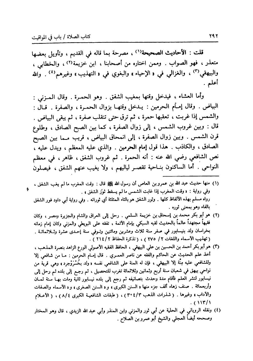 قلت: الاحاديث الصحيحة (1)، مصرحة بما قاله في القديم، وتأويل بعضها متعذر، فهو الصواب. وممن اختاره من أصحابنا، ابن خزيمة (2)، والخطابي، والبيهقي (3)، والغزالي في (الاحياء) والبغوي في (التهذيب) وغيرهم (4). والله أعلم. وأما العشاء، فيدخل وقتها بمغيب الشفق. وهو الحمرة. وقال المزني: البياض. وقال إمام الحرمين: يدخل وقتها بزوال الحمرة، والصفرة. قال: والشمس إذا غربت، تعقبها حمرة، ثم ترق حتى تنقلب صفرة، ثم يبقى البياض. قال: وبين غروب الشمس، إلى زوال الصفرة، كما بين الصبح الصادق، وطلوع قرن الشمس. وبين زوال الصفرة، إلى انمحاق البياض، قريب مما بين الصبح الصادق، والكاذب. هذا قول إمام الحرمين. والذي عليه المعظم، ويدل عليه، نص الشافعي رضي الله عنه: أنه الحمرة. ثم غروب الشفق، ظاهر، في معظم النواحي. أما الساكنون بناحية تقصر لياليهم، ولا يغيب عنهم الشفق، فيصلون