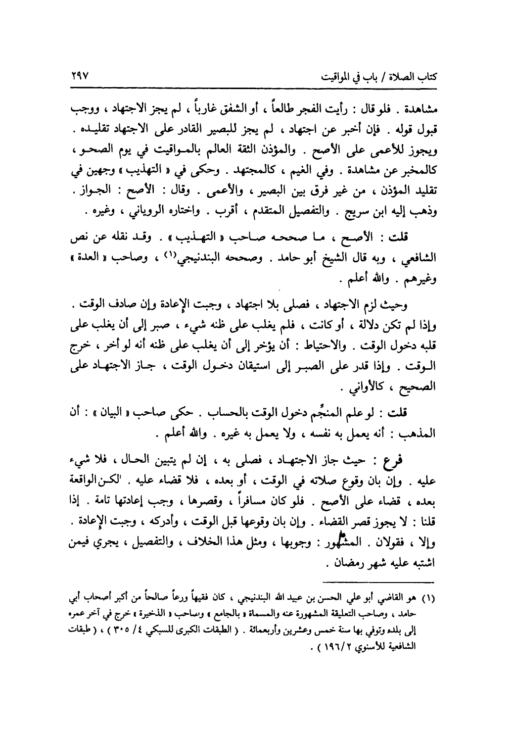 مشاهدة. فلو قال: رأيت الفجر طالعا، أو الشفق غاربا، لم يجز الاجتهاد، ووجب قبول قوله. فإن أخبر عن اجتهاد، لم يجز للبصير القادر على الاجتهاد تقليده. ويجوز للاعمى على الاصح. والمؤذن الثقة العالم بالمواقيت في يوم الصحو، كالمخبر عن مشاهدة. وفي الغيم، كالمجتهد. وحكى في (التهذيب) وجهين في تقليد المؤذن، من غير فرق بين البصير، والاعمى. وقال: الاصح: الجواز. وذهب إليه ابن سريج. والتفصيل المتقدم، أقرب. واختاره الروياني، وغيره. قلت: الاصح، ما صححه صاحب (التهذيب). وقد نقله عن نص الشافعي، وبه قال الشيخ أبو حامد. وصححه البندنيجي (1)، وصاحب (العدة) وغيرهم. والله أعلم. وحيث لزم الاجتهاد، فصلى بلا اجتهاد، وجبت الاعادة وإن صادف الوقت. وإذا لم تكن دلالة، أو كانت، فلم يغلب على ظنه شئ، صبر إلى أن يغلب على قلبه دخول الوقت. والاحتياط: أن يؤخر إلى أن يغلب على ظنه أنه لو أخر، خرج الوقت. ولو قدر على الصبر إلى استيقان دخول الوقت، جاز الاجتهاد على الصحيح، كالاواني. قلت: لو علم المنجم دخول الوقت بالحساب. حكى صاحب (البيان): أن المذهب: أنه يعمل به بنفسه، ولا يعمل به غيره. والله أعلم. فرع: حيث جاز الاجتهاد، فصلى به، إن لم يتبين الحال، فلا شئ عليه. وإن بان وقوع صلاته في الوقت أو بعده، فلا قضاء عليه. لكن الواقعة بعده، قضاء على الاصح. فلو كان مسافرا، وقصرها، وجب إعادتها تامة. إذا قلنا: لا يجوز قصر القضاء. وإن بان وقوعها قبل الوقت، وأدركه، وجبت الاعادة. وإلا، فقولان. المشهور: وجوبها، ومثل هذا الخلاف، والتفصيل، يجري فيمن اشتبه عليه شهر رمضان.