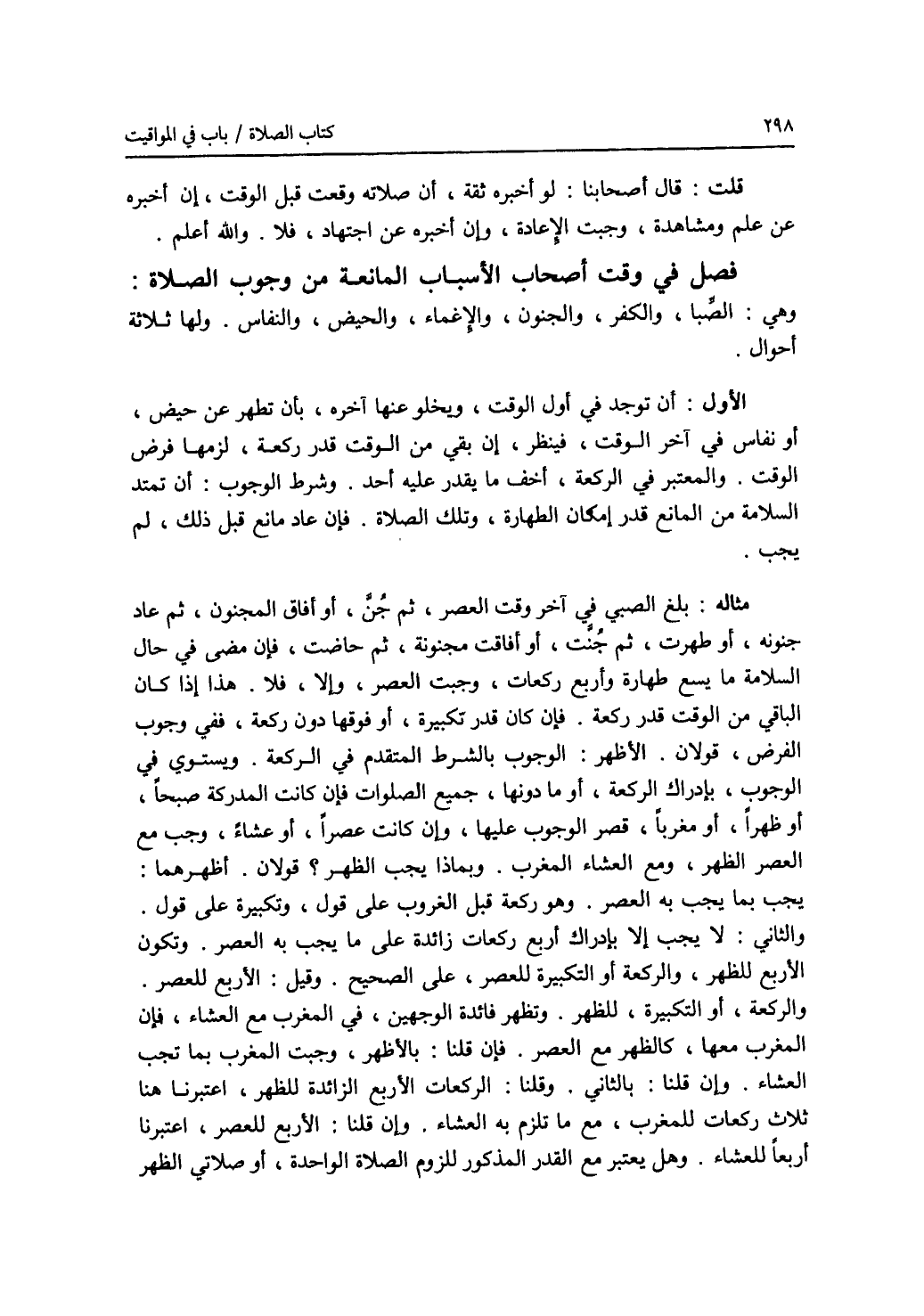 قلت: قال أصحابنا: لو أخبره ثقة، أن صلاته وقعت قبل الوقت، إن أخبره عن علم ومشاهدة، وجبت الاعادة، وإن أخبره عن اجتهاد، فلا. والله أعلم. فصل في وقت أصحاب الاسباب المانعة من وجوب الصلاة: وهي: الصبا، والكفر، والجنون، والاغماء، والحيض، والنفاس. ولها ثلاثة أحوال. الاول: أن توجد في أول الوقت، ويخلو عنها آخره، بأن تطهر عن حيض، أو نفاس في آخر الوقت، فينظر، إن بقي من الوقت قدر ركعة، لزمها فرض الوقت. والمعتبر في الركعة، أخف ما يقدر عليه أحد. وشرط الوجوب: أن تمتد السلامة من المانع قدر إمكان الطهارة، وتلك الصلاة. فإن عاد مانع قبل ذلك، لم يجب. مثاله: بلغ الصبي في آخر وقت العصر، ثم جن، أو أفاق المجنون، ثم عاد جنونه، أو طهرت. ثم جنت، أو أفاقت مجنونة، ثم حاضت، فإن مضى في حال السلامة ما يسع طهارة وأربع ركعات، وجبت العصر، وإلا، فلا. هذا إذا كان الباقي من الوقت قدر ركعة. فإن كان قدر تكبيرة، أو فوقها دون ركعة، ففي وجوب الفرض، قولان. الاظهر: الوجوب بالشرط المتقدم في الركعة. ويستوي في الوجوب، بإدراك الركعة، أو ما دونها، جميع الصلوات. فإن كانت المدركة صبحا، أو ظهرا، أو مغربا، قصر الوجوب عليها. وإن كانت عصرا، أو عشاء، وجب مع العصر الظهر، ومع العشاء المغرب. وبماذا يجب الظهر ؟ قولان. أظهرهما: يجب بما يجب به العصر. وهو ركعة قبل الغروب على قول، وتكبيرة على قول. والثاني: لا يجب إلا بإدراك أربع ركعات زائدة على ما يجب به العصر، وتكون الاربع للظهر، والركعة أو التكبيرة للعصر، على الصحيح. وقيل: الاربع للعصر. والركعة، أو التكبيرة، للظهر. وتظهر فائدة الوجهين، في المغرب مع العشاء، فإن المغرب معها، كالظهر مع العصر. فإن قلنا: بالاظهر، وجبت المغرب بما تجب العشاء. وإن قلنا: بالثاني. وقلنا: الركعات الاربع الزائدة للظهر، اعتبرنا هنا ثلاث ركعات للمغرب، مع ما تلزم به العشاء. وإن قلنا: الاربع للعصر، اعتبرنا أربعا للعشاء. وهل يعتبر مع القدر المذكور للزوم الصلاة الواحدة، أو صلاتي الظهر