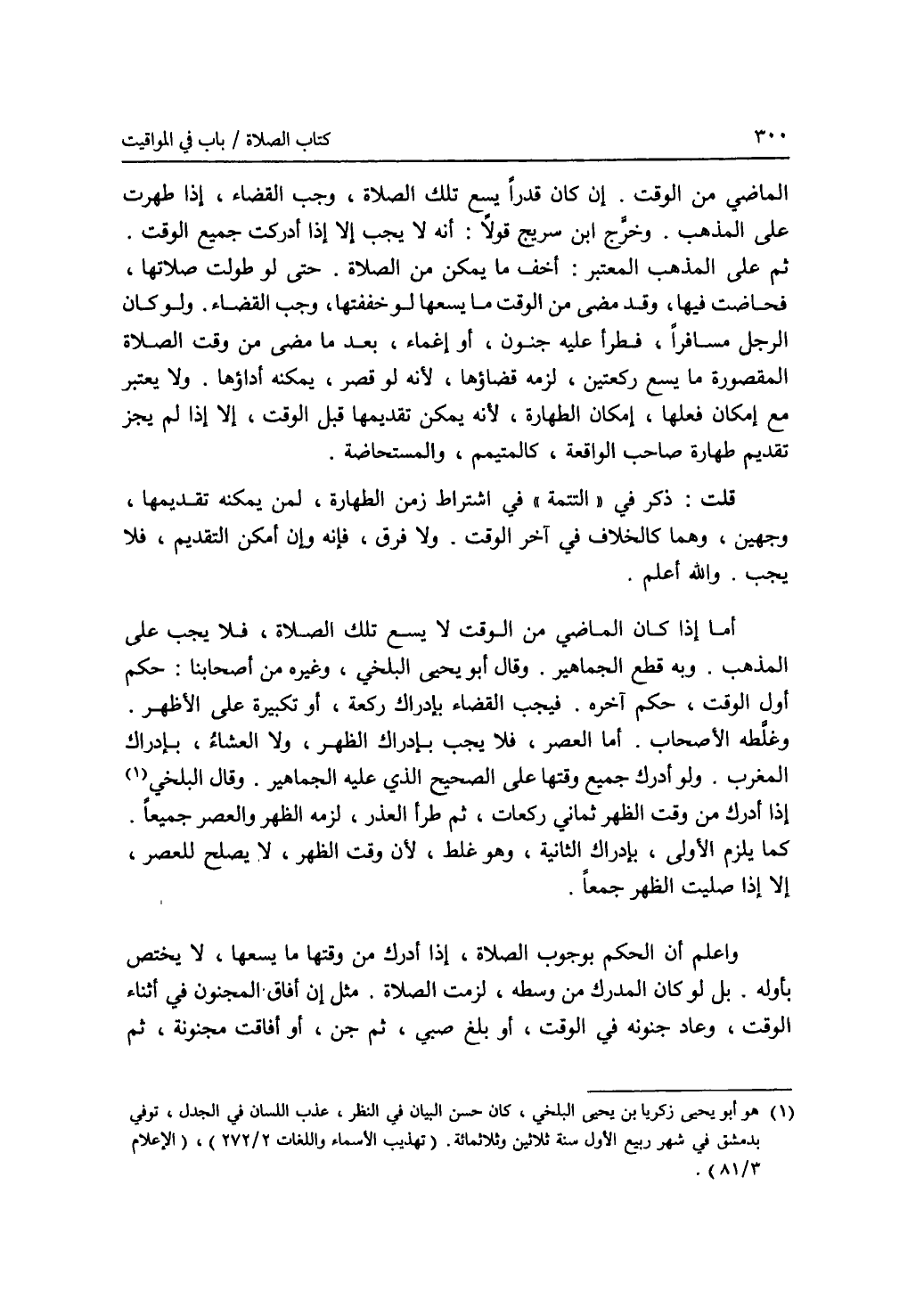 الماضي من الوقت. إن كان قدرا يسع تلك الصلاة، وجب القضاء، إذا طهرت على المذهب. وخرج ابن سريج قولا: أنه لا يجب إلا إذا أدركت جميع الوقت. ثم على المذهب المعتبر: أخف ما يمكن من الصلاة. حتى لو طولت صلاتها، فحاضت فيها، وقد مضى من الوقت ما يسعها لو خفقها، وجب القضاء. ولو كان الرجل مسافرا، فطرأ عليه جنون، أو إغماء، بعد ما مضى من وقت الصلاة المقصورة ما يسع ركعتين، لزمه قضاؤها، لانه لو قصر، يمكنه أداؤها. ولا يعتبر مع إمكان فعلها، إمكان الطهارة، لانه يمكن تقديمها قبل الوقت، إلا إذا لم يجز تقديم طهارة صاحب الواقعة. كالمتيمم، والمستحاضة. قلت: ذكر في (التتمة) في اشتراط زمن الطهارة، لمن يمكنه تقديمها، وجهين، وهما كالخلاف في آخر الوقت. ولا فرق، فإنه وإن أمكن التقديم، فلا يجب. والله أعلم. أما إذا كان الماضي من الوقت لا يسع تلك الصلاة، فلا يجب على المذهب. وبه قطع الجماهير. وقال أبويحيى البلخي، وغيره من أصحابنا: حكم أول الوقت، حكم آخره. فيجب القضاء بإدراك ركعة، أو تكبيرة على الاظهر. وغلطه الاصحاب. أما العصر، فلا يجب بإدراك الظهر، ولا العشاء، بإدراك المغرب. ولو أدرك جميع وقتها على الصحيح الذي عليه الجماهير. وقال البلخي (1) إذا أدرك من وقت الظهر ثماني ركعات، ثم طرأ العذر، لزمه الظهر والعصر جميعا. كما يلزم الاولى، بإدراك الثانية، وهو غلط، لان وقت الظهر، لا يصلح للعصر، إلا إذا صليت الظهر جمعا. واعلم أن الحكم بوجوب الصلاة، إذا أدرك من وقتها ما يسعها، لا يختص بأوله. بل لو كان المدرك من وسطه، لزمت الصلاة. مثل أن أفاق المجنون في أثناء الوقت، وعاد جنونه في الوقت، أو بلغ صبي، ثم جن، أو أفاقت مجنونة، ثم