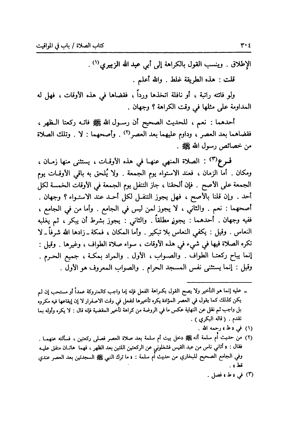 الاطلاق. وينسب القول بالكراهة إلى أبي عبد الله الزبيري (1). قلت: هذه الطريقة غلط. والله أعلم. ولو فاتته راتبة، أو نافلة اتخذها وردا، فقضاها في هذه الاوقات، فهل له المداومة على مثلها في وقت الكراهة ؟ وجهان. أحدهما: نعم، للحديث الصحيح أن رسول الله - صلى الله عليه وسلم - فاته ركعتا الظهر، فقضاهما بعد العصر، وداوم عليهما بعد العصر (2). وأصحهما: لا. وتلك الصلاة من خصائص رسول الله - صلى الله عليه وسلم -. فرع (3): الصلاة المنهي عنها في هذه الاوقات، يستثنى منها زمان، ومكان. أما الزمان، فعند الاستواء يوم الجمعة، ولا يلحق به باقي الاوقات يوم الجمعة على الاصح. فإن ألحقنا، جاز التنفل يوم الجمعة في الاوقات الخمسة لكل أحد. وإن قلنا بالاصح، فهل يجوز التنفل لكل أحد عند الاستواء ؟ وجهان. أصحهما: نعم. والثاني، لا يجوز لمن ليس في الجامع. وأما من في الجامع، ففيه وجهان. أحدهما: يجوز مطلقا والثاني: يجوز بشرط أن يبكر، ثم يغلبه النعاس. وقيل: يكفي النعاس بلا تبكير. وأما المكان، فمكة - زادها الله شرفا - لا تكره الصلاة فيها في شئ في هذه الاوقات، سواء صلاة الطواف، وغيرها. وقيل: إنما يباح ركعتا الطواف. والصواب، الاول. والمراد بمكة، جميع الحرم. وقيل: إنما يستثنى نفس المسجد الحرام. والصواب المعروف هو الاول.