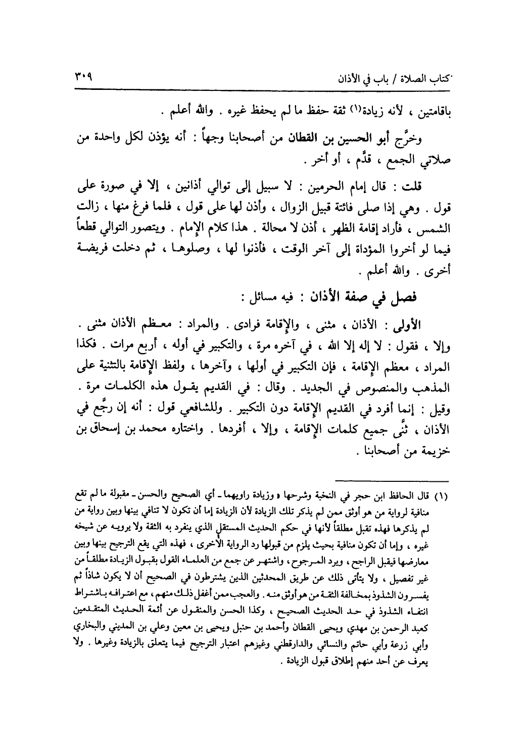 بإقامتين، لانه زيادة (1) ثقة حفظ ما لم يحفظ غيره. والله أعلم. وخرج أبو الحسين بن القطان من أصحابنا وجها: أنه يؤذن لكل واحدة من صلاتي الجمع، قدم، أو أخر. قلت: قال إمام الحرمين: لا سبيل إلى توالي أذانين، إلا في صورة على قول. وهي إذا صلى فائتة قبيل الزوال، وأذن لها على قول، فلما فرغ منها، زالت الشمس، فأراد إقامة الظهر، أذن لا محالة. هذا كلام الامام. ويتصور التوالي قطعا فيما لو أخروا المؤداة إلى آخر الوقت، فأذنوا لها، وصلوها، ثم دخلت فريضة أخرى. والله أعلم. فصل في صفة الاذان فيه مسائل: الاولى: الاذان، مثنى، والاقامة فرادى. والمراد: معظم الاذان مثنى. وإلا، فقول: لا إله إلا الله، في آخره مرة، والتكبير في أوله، أربع مرات. فكذا المراد، معظم الاقامة، فإن التكبير في أولها، وآخرها، ولفظ الاقامة بالتثنية على المذهب والمنصوص في الجديد. وقال: في القديم يقول هذه الكلمات مرة. وقيل: إنما أفرد في القديم الاقامة دون التكبير. وللشافعي قول: أنه إن رجع في الاذان، ثنى جميع كلمات الاقامة، وإلا، أفردها. واختاره محمد بن إسحاق بن خزيمة من أصحابنا.