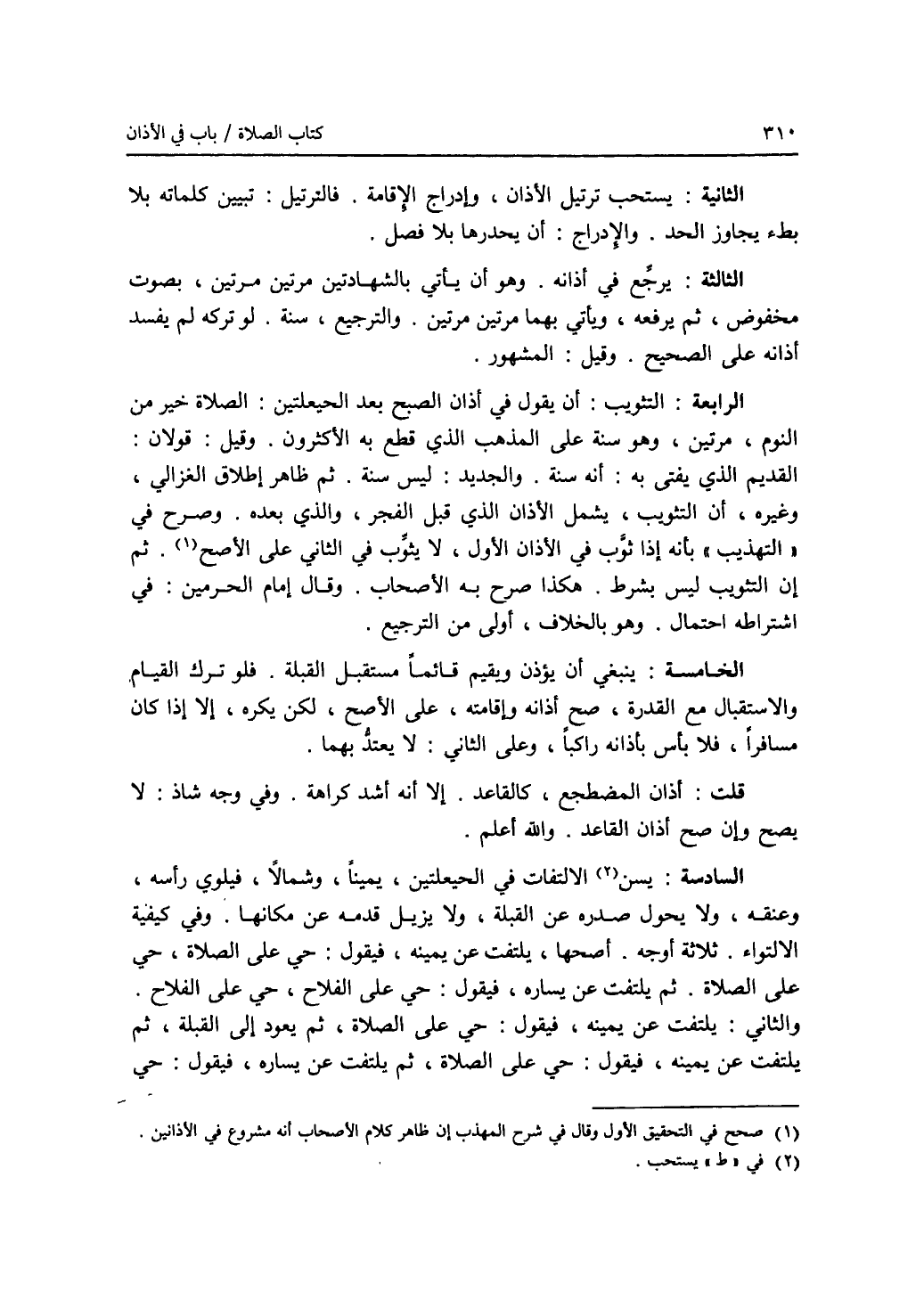 الثانية: يستحب ترتيل الاذان، وإدراج الاقامة. فالترتيل: تبيين كلماته بلا بطء يجاوز الحد. والادراج: أن يحدرها بلا فصل. الثالثة: يرجع في أذانه. وهو أن يأتي بالشهادتين مرتين مرتين، بصوت مخفوض، ثم يرفعه، ويأتي بهما مرتين مرتين. والترجيع، سنة. لو تركه لم يفسد أذانه على الصحيح. وقيل: المشهور. الرابعة: التثويب: أن يقول في أذان الصبح بعد الحيعلتين: الصلاة خير من النوم، مرتين، وهو سنة على المذهب الذي قطع به الاكثرون. وقيل: قولان: القديم الذي يفتى به: أنه سنة. والجديد: ليس سنة. ثم ظاهر إطلاق الغزالي، وغيره، أن التثويب، يشمل الاذان الذي قبل الفجر، والذي بعده. وصرح في (التهذيب) بأنه إذا ثوب في الاذان الاول، لا يثوب في الثاني على الاصح. (1). ثم إن التثويب ليس بشرط. هكذا صرح به الاصحاب. وقال إمام الحرمين: في اشتراطه احتمال. وهو بالخلاف، أولى من الترجيع. الخامسة: ينبغي أن يؤذن ويقيم قائما مستقبل القبلة. فلو ترك القيام والاستقبال مع القدرة، صح أذانه وإقامته، على الاصح، لكن يكره، إلا إذا كان مسافرا، فلا بأس بأذانه راكبا، وعلى الثاني: لا يعتد بهما. قلت: أذان المضطجع، كالقاعد. إلا أنه أشد كراهة. وفي وجه شاذ: لا يصح وإن صح أذان القاعد. والله أعلم. السادسة: يسن (2) الالتفات في الحيعلتين، يمينا، وشمالا، فيلوي رأسه، وعنقه، ولا يحول صدره عن القبلة، ولا يزيل قدمه عن مكانها. وفي كيفية الالتواء، ثلاثة أوجه. أصحها، يلتفت عن يمينه، فيقول: حي على الصلاة، حي على الصلاة. ثم يلتفت عن يساره، فيقول: حي على الفلاح، حي على الفلاح. والثاني: يلتفت عن يمينه، فيقول: حي على الصلاة، ثم يعود إلى القبلة، ثم يلتفت عن يمينه، فيقول: حي على الصلاة، ثم يلتفت عن يساره، فيقول: حي