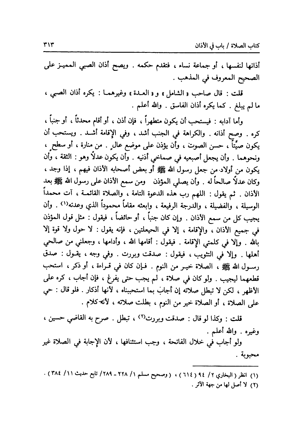 أذانها لنفسها، أو جماعة نساء، فتقدم حكمه. ويصح أذان الصبي المميز على الصحيح المعروف في المذهب. قلت: قال صاحب (الشامل) و (العدة) وغيرهما: يكره أذان الصبي، ما لم يبلغ. كما يكره أذان الفاسق، والله أعلم. وأما آدابه: فيستحب أن يكون متطهرا، فإن أذن، أو أقام محدثا، أو جنبا، كره. وصح أذانه. والكراهة في الجنب أشد، وفي الاقامة أشد. ويستحب أن يكون صيتا، حسن الصوت، وأن يؤذن على موضع عال. من منارة أو سطح، ونحوهما. وأن يجعل أصبعيه في صماخي أذنيه. وأن يكون عدلا وهو: الثقة، وأن يكون من أولاد من جعل رسول الله - صلى الله عليه وسلم - أو بعض أصحابه الاذان فيهم، إذا وجد، وكان عدلا صالحا له. وأن يصلي المؤذن. ومن سمع الاذان على رسول الله - صلى الله عليه وسلم - بعد الاذان. ثم يقول: اللهم رب هذه الدعوة التامة، والصلاة القائمة، آت محمدا الوسيلة، والفضيلة، والدرجة الرفيعة، وابعثه مقاما محمودا الذي وعدته (1). وأن يجيب كل من سمع الاذان. وإن كان جنبا، أو حائضا، فيقول: مثل قول المؤذن في جميع الاذان، والاقامة، إلا في الحيعلتين، فإنه يقول: لا حول ولا قوة إلا بالله. وإلا في كلمتي الاقامة. فيقول: أقامها الله، وأدامها، وجعلني من صالحي أهلها. وإلا في التثويب، فيقول: صدقت وبررت. وفي وجه، يقول: صدق رسول الله - صلى الله عليه وسلم -، الصلاة خير من النوم. فإن كان في قراءة، أو ذكر، استحب قطعهما ليجيب. ولو كان في صلاة، لم يجب حتى يفرغ، فإن أجاب، كره على الاظهر، لكن لا تبطل صلاته إن أجاب بما استحببناه، لانها أذكار. فلو قال: حي على الصلاة، أو الصلاة خير من النوم، بطلت صلاته، لانه كلام. قلت: وكذا لو قال: صدقت وبررت (2)، تبطل. صرح به القاضي حسين، وغيره. والله أعلم. ولو أجاب في خلال الفاتحة، وجب استئنافها، لان الاجابة في الصلاة غير محبوبة.