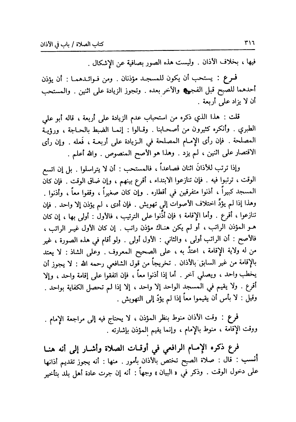 فيها، بخلاف الاذان. وليست هذه الصور بصافية عن الاشكال. فرع: يستحب أن يكون للمسجد مؤذنان. ومن فوائدهما: أن يؤذن أحدهما للصبح قبل الفجر، والآخر بعده. وتجوز الزيادة على اثنين. والمستحب أن لا يزاد على أربعة. قلت: هذا الذي ذكره من استحباب عدم الزيادة على أربعة، قاله أبو علي الطبري. وأنكره كثيرون من أصحابنا. وقالوا: إنما الضبط بالحاجة، ورؤية المصلحة. فإن رأى الامام المصلحة في الزيادة على أربعة، فعله. وإن رأى الاقتصار على اثنين، لم يزد. وهذا هو الاصح المنصوص. والله أعلم. وإذا ترتب للاذان اثنان فصاعدا، فالمستحب: أن لا يتراسلوا. بل إن اتسع الوقت، تجبوا فيه. فإن تنازعوا الابتداء، أقرع بينهم، وإن ضاق الوقت. فإن كان المسجد كبيرا، أذنوا متفرقين في أقطاره. وإن كان صغيرا وقفوا معا، وأذنوا. وهذا إذا لم يؤد اختلاف الاصوات إلى تهويش. فإن أدى، لم يؤذن إلا واحد. فإن تنازعوا، أقرع. وأما الاقامة، فإن أذنوا على الترتيب، فالاول: أولى بها، إن كان هو المؤذن الراتب، أو لم يكن هناك مؤذن راتب. إن كان الاول غير الراتب، فالاصح: أن الراتب أولى، والثاني: الاول أولى. ولو أقام في هذه الصورة، غير من له ولاية الاقامة، اعتد به، على الصحيح المعروف. وعلى الشاذ: لا يعتد بالاقامة من غير السابق بالاذان. تخريجا من قول الشافعي رحمه الله: لا يجوز أن يخطب واحد، ويصلي آخر. أما إذا أذنوا معا، فإن اتفقوا على إقامة واحد، وإلا أقرع. ولا يقيم في المسجد الواحد إلا واحد، إلا إذا لم تحصل الكفاية بواحد. وقيل: لا بأس أن يقيموا معا إذا لم يؤد إلى التهويش. فرع: وقت الاذان منوط بنظر المؤذن، لا يحتاج فيه إلى مراجعة الامام. ووقت الاقامة، منوط بالامام، وإنما يقيم المؤذن بإشارته. فرع ذكره الامام الرافعي في أوقات الصلاة وأشار إلى أنه هنا أنسب قال: صلاة الصبح تختص بالاذان بأمور. منها: أنه يجوز تقديم أذانها على دخول الوقت. وذكر في (البيان) وجها: أنه إن جرت عادة أهل بلد بتأخير