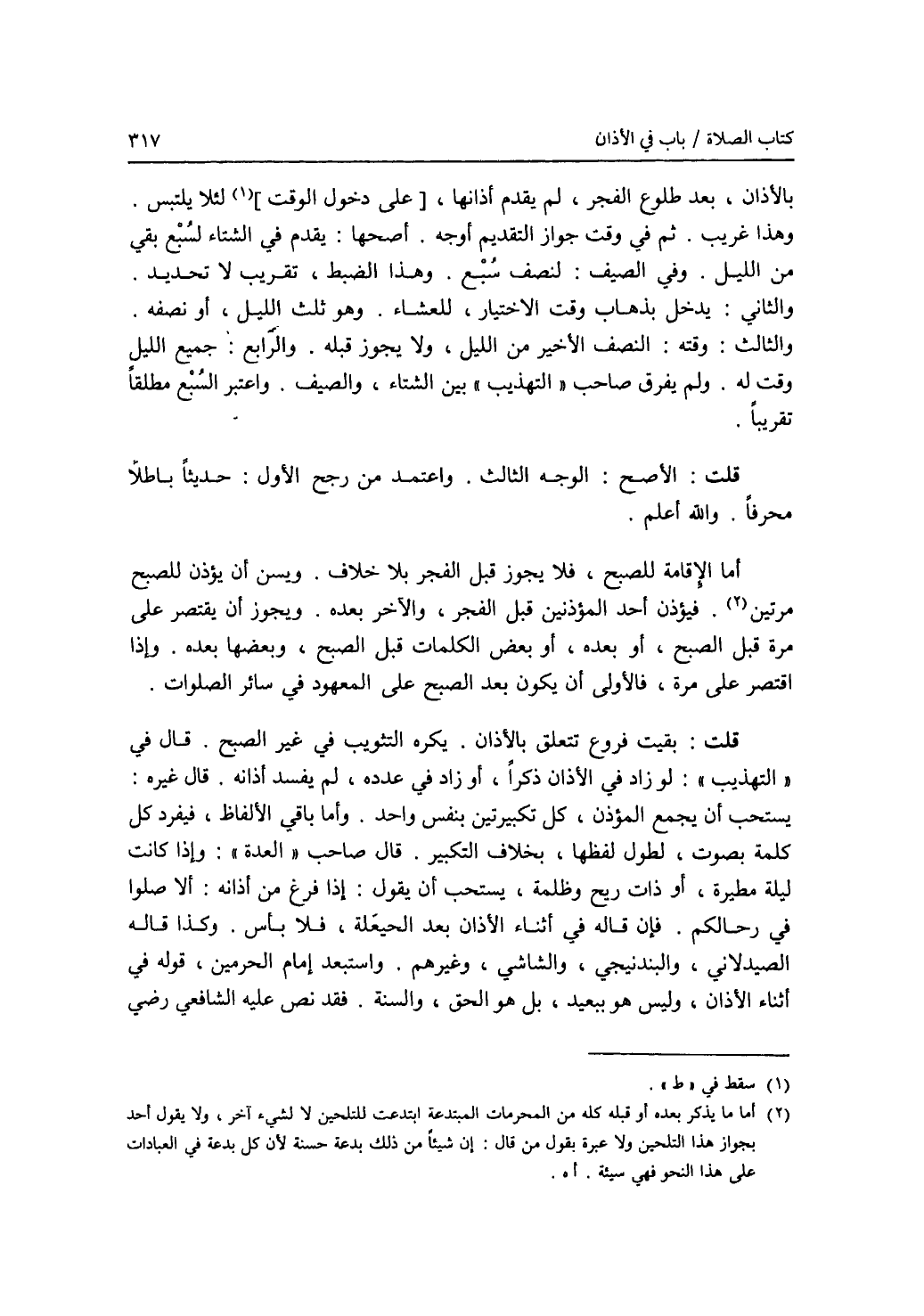 بالاذان، بعد طلوع الفجر، لم يقدم أذانها، [ على دخول الوقت ] (1) لئلا يلتبس. وهذا غريب. ثم في وقت جواز التقديم أوجه. أصحها: يقدم في الشتاء لسبع بقي من الليل. وفي الصيف: لنصف سبع. وهذا الضبط، تقريب لا تحديد. والثاني: يدخل بذهاب وقت الاختيار، للعشاء. وهو ثلث الليل، أو نصفه. والثالث: وقته: النصف الاخير من الليل، ولا يجوز قبله. والرابع: جميع الليل وقت له. ولم يفرق صاحب (التهذيب) بين الشتاء، والصيف. واعتبر السبع مطلقا تقريبا. قلت: الاصح: الوجه الثالث. واعتمد من رجح الاول: حديثا باطلا محرفا. والله أعلم. أما الاقامة للصبح، فلا يجوز قبل الفجر بلا خلاف. ويسن أن يؤذن للصبح مرتين (2). فيؤذن أحد المؤذنين قبل الفجر، والآخر بعده. ويجوز أن يقتصر على مرة قبل الصبح، أو بعده، أو بعض الكلمات قبل الصبح، وبعضها بعده. وإذا اقتصر على مرة، فالاولى أن يكون بعد الصبح على المعهود في سائر الصلوات. قلت: بقيت فروع تتعلق بالاذان. يكره التثويب في غير الصبح. قال في (التهذيب): لو زاد في الاذان ذكرا، أو زاد في عدده، لم يفسد أذانه. قال غيره: يستحب أن يجمع المؤذن، كل تكبيرتين بنفس واحد. وأما باقي الالفاظ، فيفرد كل كلمة بصوت، لطول لفظها، بخلاف التكبير. قال صاحب (العدة): وإذا كانت ليلة مطيرة، أو ذات ريح وظلمة، يستحب أن يقول: إذا فرغ من أذانه: ألا صلوا في رحالكم. فإن قاله في أثناء الاذان بعد الحيعلة، فلا بأس. وكذا قاله الصيدلاني، والبندنيجي، والشاشي، وغيرهم. واستبعد إمام الحرمين، قوله في أثناء الاذان، وليس هو ببعيد، بل هو الحق، والسنة. فقد نص عليه الشافعي رضي