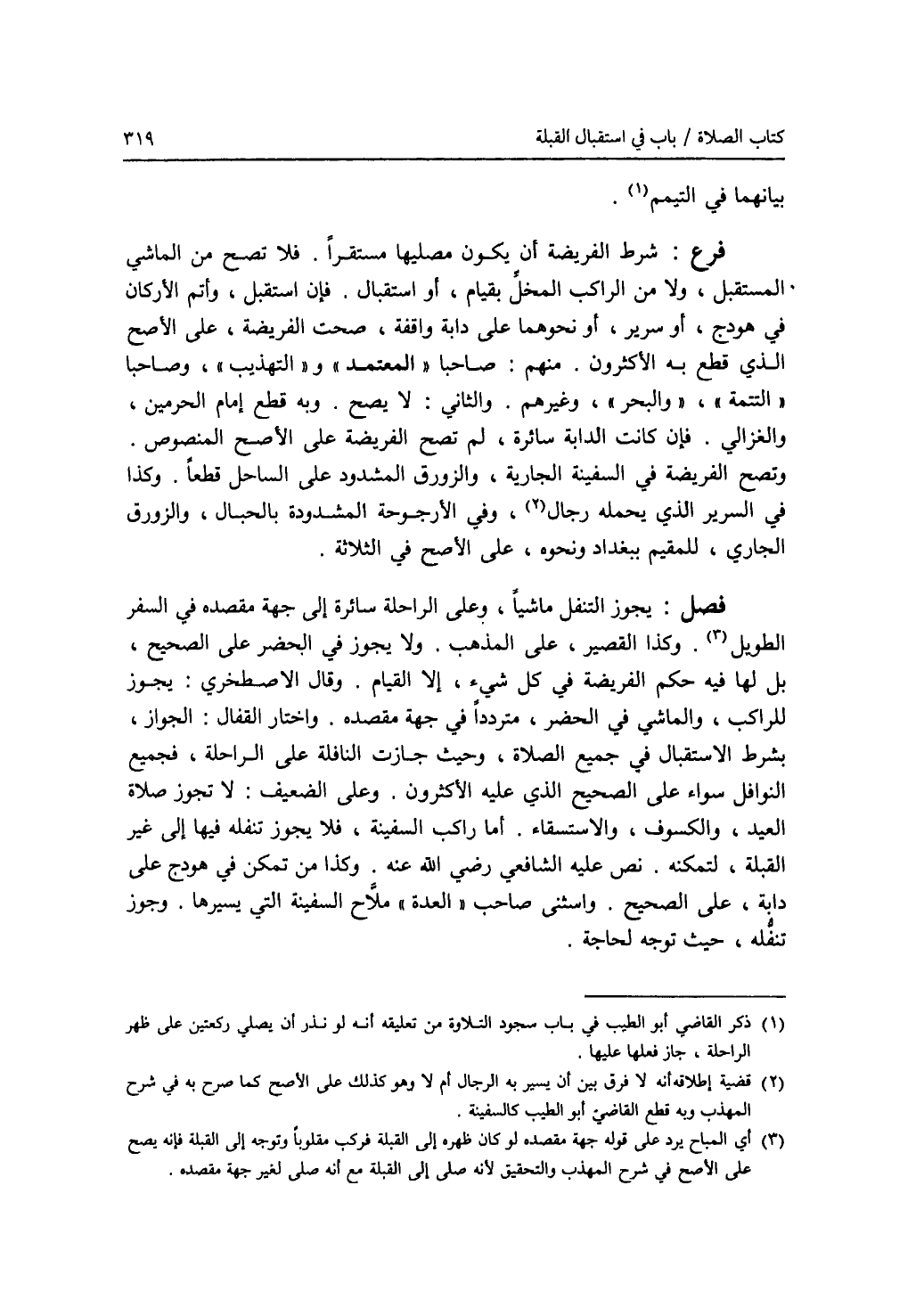 بيانهما في التيمم (1). فرع: شرط الفريضة أن يكون مصليها مستقرا. فلا تصح من الماشي المستقبل، ولا من الراكب المخل بقيام، أو استقبال. فإن استقبل، وأتم الاركان في هودج، أو سرير، أو نحوهما على دابة واقفة، صحت الفريضة، على الاصح الذي قطع به الاكثرون. منهم: صاحبا (المعتمد) و (التهذيب)، وصاحبا (التتمة)، و (البحر)، وغيرهم. والثاني: لا يصح. وبه قطع إمام الحرمين، والغزالي. فإن كانت الدابة سائرة، لم تصح الفريضة على الاصح المنصوص. وتصح الفريضة في السفينة الجارية، والزورق المشدود على الساحل قطعا. وكذا في السرير الذي يحمله رجال (2)، وفي الارجوحة المشدودة بالحبال، والزورق الجاري، للمقيم ببغداد ونحوه، على الاصح في الثلاثة. فصل: يجوز التنفل ماشيا، وعلى الراحلة سائرة إلى جهة مقصده في السفر الطويل (3). وكذا القصير، على المذهب. ولا يجوز في الحضر على الصحيح، بل لها فيه حكم الفريضة في كل شئ، إلا القيام. وقال الاصطخري: يجوز للراكب، والماشي في الحضر، مترددا في جهة مقصده. واختار القفال: الجواز، بشرط الاستقبال في جميع الصلاة، وحيث جازت النافلة على الراحلة، فجميع النوافل سواء على الصحيح الذي عليه الاكثرون. وعلى الضعيف: لا تجوز صلاة العيد، والكسوف، والاستسقاء. أما راكب السفينة، فلا يجوز تنفله فيها إلى غير القبلة، لتمكنه. نص عليه الشافعي رضي الله عنه. وكذا من تمكن في هودج على دابة، على الصحيح. واستثنى صاحب (العدة) ملاح السفينة التي يسيرها. وجوز تنفله، حيث توجه لحاجة.
