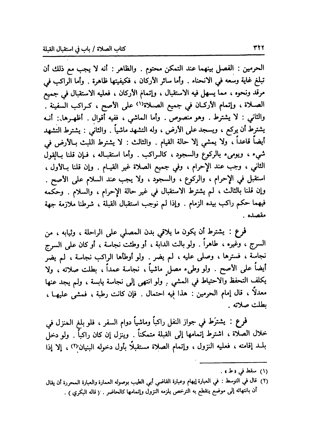 الحرمين: الفصل بينهما عند التمكن محتوم. والظاهر: أنه لا يجب مع ذلك أن تبلغ غاية وسعه في الانحناء. وأما سائر الاركان، فكيفيتها ظاهرة. وأما الراكب في مرقد ونحوه، مما يسهل فيه الاستقبال، وإتمام الاركان، فعليه الاستقبال في جميع الصلاة، وإتمام الاركان في جميع الصلاة (1) على الاصح، كراكب السفينة. والثاني: لا يشترط. وهو منصوص. وأما الماشي، ففيه أقوال. أظهرها: أنه يشترط أن يركع، ويسجد على الارض، وله التشهد ماشيا. والثاني: يشترط التشهد أيضا قاعدا، ولا يمشي إلا حالة القيام. والثالث: لا يشترط اللبث بالارض في شئ، ويومئ بالركوع والسجود، كالراكب. وأما استقباله، فإن قلنا بالقول الثاني، وجب عند الاحرام، وفي جميع الصلاة غير القيام. وإن قلنا بالاول، استقبل في الاحرام، والركوع، والسجود، ولا يجب عند السلام على الاصح. وإن قلنا بالثالث، لم يشترط الاستقبال في غير حالة الاحرام، والسلام. وحكمه فيهما حكم راكب بيده الزمام. وإذا لم نوجب استقبال القبلة، شرطنا ملازمة جهة مقصده. فرع: يشترط أن يكون ما يلاقي بدن المصلي على الراحلة، وثيابه، من السرج، وغيره، طاهرا. ولو بالت الدابة، أو وطئت نجاسة، أو كان على السرج نجاسة، فسترها، وصلى عليه، لم يضر. ولو أوطأها الراكب نجاسة، لم يضر أيضا على الاصح. ولو وطئ مصل ماشيا، نجاسة عمدا، بطلت صلاته، ولا يكلف التحفظ والاحتياط في المشي. ولو انتهى إلى نجاسة يابسة، ولم يجد عنها معدلا، قال إمام الحرمين: هذا فيه احتمال. فإن كانت رطبة، فمشى عليها، بطلت صلاته. فرع: يشترط في جواز النفل راكبا وماشيا دوام السفر، فلو بلغ المنزل في خلال الصلاة، اشترط إتمامها إلى القبلة متمكنا. وينزل إن كان راكبا. ولو دخل بلد إقامته، فعليه النزول، وإتمام الصلاة مستقبلا بأول دخوله البنيان (2)، إلا إذا