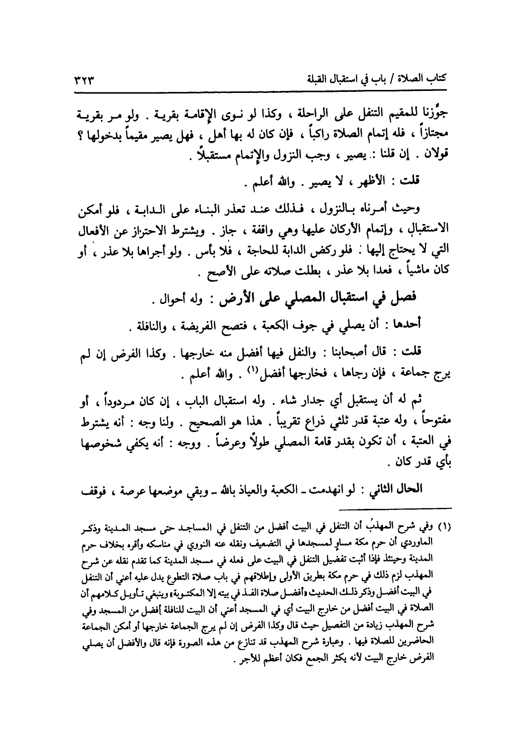 جوزنا للمقيم التنفل على الراحلة، وكذا لو نوى الاقامة بقرية. ولو مر بقرية مجتازا، فله إتمام الصلاة راكبا، فإن كان له بها أهل، فهل يصير مقيما بدخولها ؟ قولان. إن قلنا: يصير، وجب النزول والاتمام مستقبلا. قلت: الاظهر، لا يصير. والله أعلم. وحيث أمرناه بالنزول، فذلك عند تعذر البناء على الدابة، فلو أمكن الاستقبال، وإتمام الاركان عليها وهي واقفة، جاز. ويشترط الاحتراز عن الافعال التي لا يحتاج إليها. فلو ركض الدابة للحاجة، فلا بأس. ولو أجراها بلا عذر، أو كان ماشيا، فعدا بلا عذر، بطلت صلاته على الاصح. فصل في استقبال المصلي على الارض: وله أحوال.. أحدها: أن يصلي في جوف الكعبة، فتصح الفريضة، والنافلة. قلت: قال أصحابنا: والنفل فيها أفضل منه خارجها. وكذا الفرض إن لم يرج جماعة، فإن رجاها، فخارجها أفضل (1). والله أعلم. ثم له أن يستقبل أي جدار شاء. وله استقبال الباب، إن كان مردودا، أو مفتوحا، وله عتبة قدر ثلثي ذراع تقريبا. هذا هو الصحيح. ولنا وجه: أنه يشترط في العتبة، أن تكون بقدر قامة المصلي طولا وعرضا. ووجه: أنه يكفي شخوصها بأي قدر كان. الحال الثاني: لو انهدمت الكعبة - والعياذ بالله - وبقي موضعها عرصة، فوقف