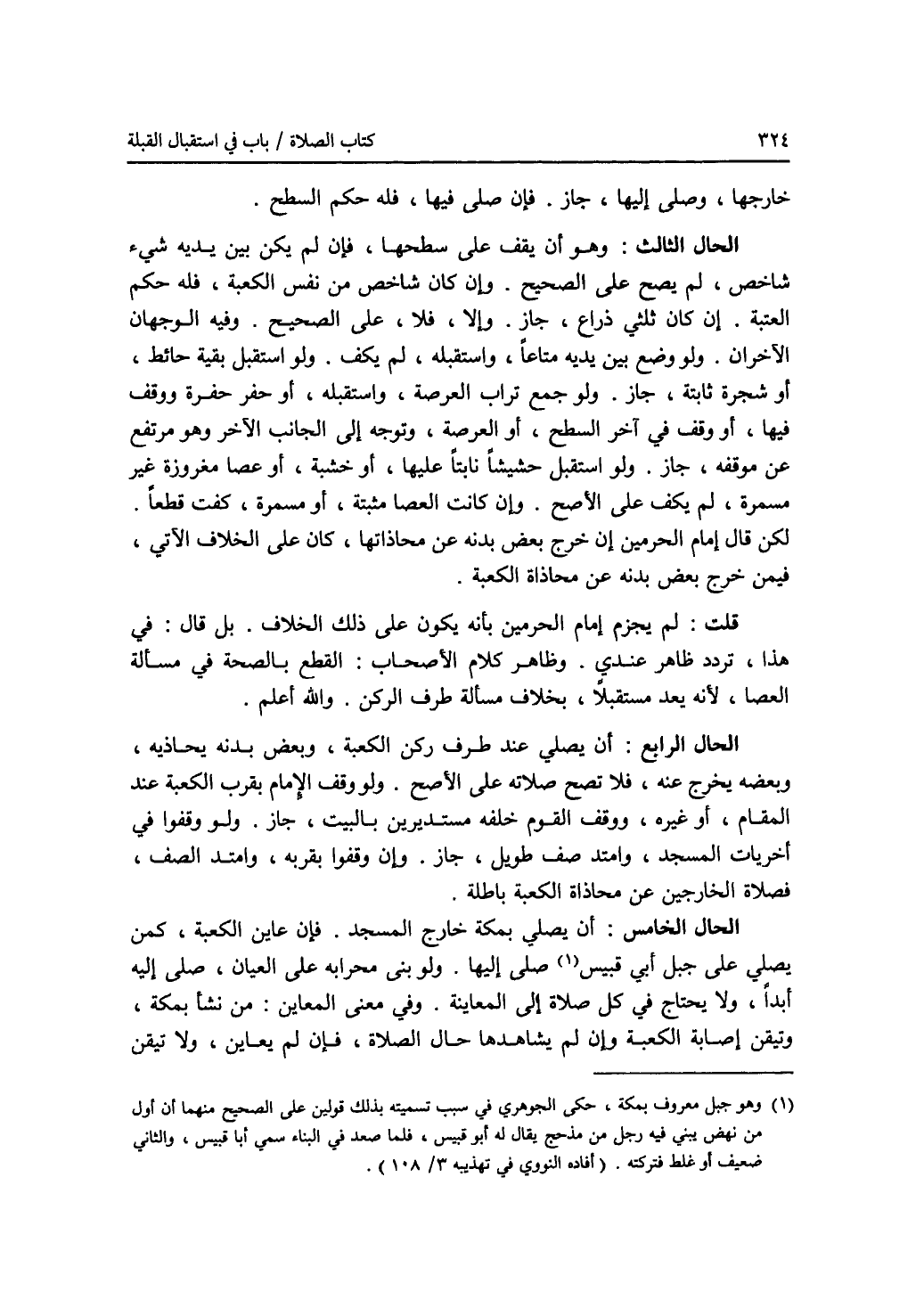 خارجها، وصلى إليها، جاز. فإن صلى فيها، فله حكم السطح. الحال الثالث: وهو أن يقف على سطحها، فإن لم يكن بين يديه شئ شاخص، لم يصح على الصحيح. وإن كان شاخص من نفس الكعبة، فله حكم العتبة. إن كان ثلثي ذراع، جاز. وإلا، فلا، على الصحيح. وفيه الوجهان الآخران. ولو وضع بين يديه متاعا، واستقبله، لم يكف. ولو استقبل بقية حائط، أو شجرة ثابتة، جاز. ولو جمع تراب العرصة، واستقبله، أو حفر حفرة ووقف فيها، أو وقف في آخر السطح، أو العرصة، وتوجه إلى الجانب الآخر وهو مرتفع عن موقفه، جاز. ولو استقبل حشيشا نابتا عليها، أو خشبة، أو عصا مغروزة غير مسمرة، لم يكف على الاصح. وإن كانت العصا مثبتة، أو مسمرة، كفت قطعا. لكن قال إمام الحرمين: إن خرج بعض بدنه عن محاذاتها، كان على الخلاف الآتي، فيمن خرج بعض بدنه عن محاذاة الكعبة. قلت: لم يجزم إمام الحرمين بأنه يكون على ذلك الخلاف. بل قال: في هذا، تردد ظاهر عندي. وظاهر كلام الاصحاب: القطع بالصحة في مسألة العصا، لانه يعد مستقبلا، بخلاف مسألة طرف الركن. والله أعلم. الحال الرابع: أن يصلي عند طرف ركن الكعبة، وبعض بدنه يحاذيه، وبعضه يخرج عنه، فلا تصح صلاته على الاصح. ولو وقف الامام بقرب الكعبة عند المقام، أو غيره، ووقف القوم خلفه مستديرين بالبيت، جاز. ولو وقفوا في أخريات المسجد، وامتد صف طويل، جاز. وإن وقفوا بقربه، وامتد الصف، فصلاة الخارجين عن محاذاة الكعبة باطلة. الحال الخامس: أن يصلي بمكة خارج المسجد. فإن عاين الكعبة، كمن يصلي على جبل أبي قبيس (1)، صلى إليها. ولو بنى محرابه على العيان، صلى إليه أبدا، ولا يحتاج في كل صلاة إلى المعاينة. وفي معنى المعاين: من نشأ بمكة، وتيقن إصابة الكعبة وإن لم يشاهدها حال الصلاة، فإن لم يعاين، ولا تيقن