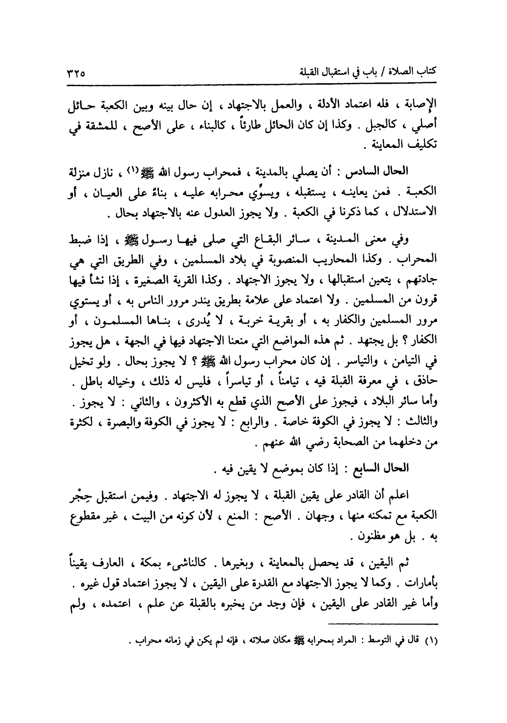 الاصابة، فله اعتماد الادلة، والعمل بالاجتهاد، إن حال بينه وبين الكعبة حائل أصلي، كالجبل. وكذا إن كان الحائل طارئا، كالبناء، على الاصح، للمشقة في تكليف المعاينة. الحال السادس: أن يصلي بالمدينة، فمحراب رسول الله - صلى الله عليه وسلم - (1)، نازل منزلة الكعبة. فمن يعاينه، يستقبله، ويسوي محرابه عليه، بناء على العيان، أو الاستدلال، كما ذكرنا في الكعبة. ولا يجوز العدول عنه بالاجتهاد بحال. وفي معنى المدينة، سائر البقاع التي صلى فيها رسول الله - صلى الله عليه وسلم -، إذا ضبط المحراب. وكذا المحاريب المنصوبة في بلاد المسلمين، وفي الطريق التي هي جادتهم، يتعين استقبالها، ولا يجوز الاجتهاد. وكذا القرية الصغيرة، إذا نشأ فيها قرون من المسلمين. ولا اعتماد على علامة بطريق يندر مرور الناس به، أو يستوي مرور المسلمين والكفار به، أو بقرية خربة، لا يدرى، بناها المسلمون، أو الكفار ؟ بل يجتهد. ثم هذه المواضع التي منعنا الاجتهاد فيها في الجهة، هل يجوز في التيامن، والتياسر. إن كان محراب رسول الله - صلى الله عليه وسلم - ؟ لا يجوز بحال. ولو تخيل حاذق، في معرفة القبلة فيه، تيامنا، أو تياسرا، فليس له ذلك، وخياله باطل. وأما سائر البلاد، فيجوز على الاصح الذي قطع به الاكثرون، والثاني: لا يجوز. والثالث: لا يجوز في الكوفة خاصة. والرابع: لا يجوز في الكوفة والبصرة، لكثرة من دخلهما من الصحابة رضي الله عنهم. الحال السابع: إذا كان بموضع لا يقين فيه. اعلم أن القادر على يقين القبلة، لا يجوز له الاجتهاد. وفيمن استقبل حجر الكعبة مع تمكنه منها، وجهان. الاصح: المنع، لان كونه من البيت، غير مقطوع به. بل هو مظنون. ثم اليقين، قد يحصل بالمعاينة، وبغيرها. كالناشئ بمكة، العارف يقينا بأمارات. وكما لا يجوز الاجتهاد مع القدرة على اليقين، لا يجوز اعتماد قول غيره. وأما غير القادر على اليقين، فإن وجد من يخبره بالقبلة عن علم، اعتمده، ولم