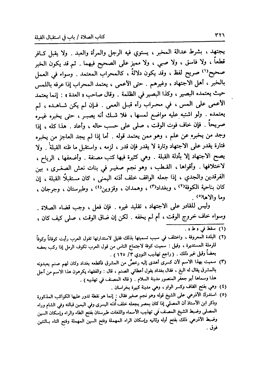 يجتهد، بشرط عدالة المخبر، يستوي فيه الرجل والمرأة والعبد. ولا يقبل كافر قطعا، ولا فاسق، ولا صبي، ولا مميز على الصحيح فيهما. ثم قد يكون الخبر صحيح (1) صرح لفظ، وقد يكون دلالة، كالمحراب المعتمد. وسواء في العمل بالخبر، أهل الاجتهاد وغيرهم. حتى الاعمى، يعتمد المحراب إذا عرفه باللمس حيث يعتمده البصير، وكذا البصير في الظلمة. وقال صاحب (العدة): إنما يعتمد الاعمى على المس، في محراب رآه قبل العمى. فإن لم يكن شاهده، لم يعتمده. ولو اشتبه عليه مواضع لمسها، فلا شك أنه يصبر، حتى يخبره غيره صريحا. فإن خاف فوت الوقت، صلى على حسب حاله، وأعاد. هذا كله، إذا وجد من يخبره عن علم، وهو ممن يعتمد قوله. أما إذا لم يجد العاجز من يخبره، فتارة يقدر على الاجتهاد، وتارة لا يقدر. فإن قدر، لزمه، واستقبل ما ظنه القبلة. ولا يصح الاجتهاد إلا بأدلة القبلة. وهي كثيرة فيها كتب مصنفة. وأضعفها، الرياح، لاختلافها. وأقواها، القطب، وهو نجم صغير في بنات نعش الصغرى، بين الفرقدين والجدي، إذا جعله الواقف خلف أذنه اليمنى، كان مستقبلا القبلة، إن كان بناحية الكوفة (2)، وبغداد (3)، وهمدان، وقزوين (4)، وطبرستان، وجرجان، وما والاها (5). وليس للقادر على الاجتهاد، تقليد غيره. فإن فعل، وجب قضاء الصلاة. وسواء خاف خروج الوقت، أم لم يخفه. لكن إن ضاق الوقت، صلى كيف كان،