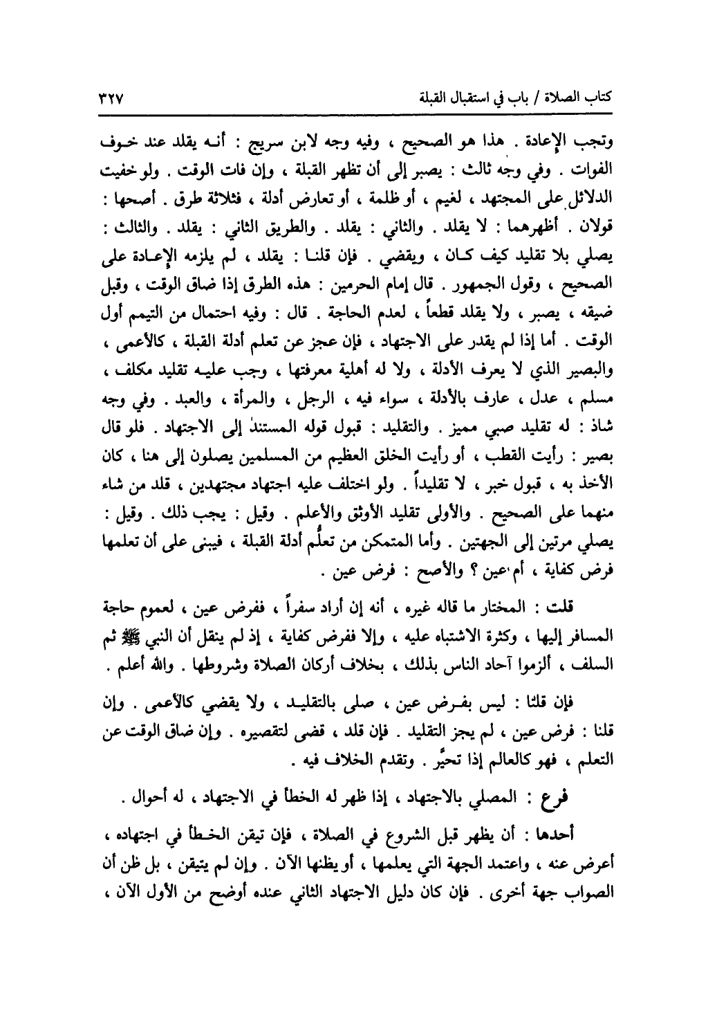 وتجب الاعادة. هذا هو الصحيح، وفيه وجه لابن سريج: أنه يقلد عند خوف الفوات. وفي وجه ثالث: يصبر إلى أن تظهر القبلة، وإن فات الوقت. ولو خفيت الدلائل على المجتهد، لغيم، أو ظلمة، أو تعارض أدلة، فثلاثة طرق. أصحها: قولان. أظهرهما: لا يقلد. والثاني: يقلد. والطريق الثاني: يقلد. والثالث: يصلي بلا تقليد كيف كان، ويقضي. فإن قلنا: يقلد، لم يلزمه الاعادة على الصحيح، وقول الجمهور. قال إمام الحرمين: هذه الطرق إذا ضاق الوقت، وقبل ضيقه، يصبر، ولا يقلد قطعا، لعدم الحاجة. قال: وفيه احتمال من التيمم أول الوقت. أما إذا لم يقدر على الاجتهاد، فإن عجز عن تعلم أدلة القبلة، كالاعمى، والبصير الذي لا يعرف الادلة، ولا له أهلية معرفتها، وجب عليه تقليد مكلف، مسلم، عدل، عارف بالادلة، سواء فيه، الرجل، والمرأة، والعبد. وفي وجه شاذ: له تقليد صبي مميز. والتقليد: قبول قوله المستند إلى الاجتهاد. فلو قال بصير: رأيت القطب، أو رأيت الخلق العظيم من المسلمين يصلون إلى هنا، كان الاخذ به، قبول خبر، لا تقليدا. ولو اختلف عليه اجتهاد مجتهدين، قلد من شاء منهما على الصحيح. والاولى تقليد الاوثق والاعلم. وقيل: يجب ذلك. وقيل: يصلي مرتين إلى الجهتين، وأما المتمكن من تعلم أدلة القبلة فيبنى على أن تعلمها فرض كفاية، أم عين ؟ والاصح: فرض عين. قلت: المختار ما قاله غيره، أنه إن أراد سفرا، ففرض عين، لعموم حاجة المسافر إليها، وكثرة الاشتباه عليه، وإلا ففرض كفاية، إذا لم ينقل أن النبي - صلى الله عليه وسلم - ثم السلف، ألزموا آحاد الناس بذلك، بخلاف أركان الصلاة وشروطها. والله أعلم. فإن قلنا: ليس بفرض عين، صلى بالتقليد، ولا يقضي كالاعمى. وإن قلنا: فرض عين، لم يجز التقليد. فإن قلد، قضى لتقصيره. وإن ضاق الوقت عن التعلم، فهو كالعالم إذا تحير. وتقدم الخلاف فيه. فرع: المصلي بالاجتهاد، إذا ظهر له الخطأ في الاجتهاد، له أحوال. أحدها: أن يظهر قبل الشروع في الصلاة، فإن تيقن الخطأ في اجتهاده، أعرض عنه، واعتمد الجهة التي يعلمها، أو يظنها الآن. وإن لم يتيقن، بل ظن أن الصواب جهة أخرى. فإن كان دليل الاجتهاد الثاني عنده أوضح من الاول الآن،