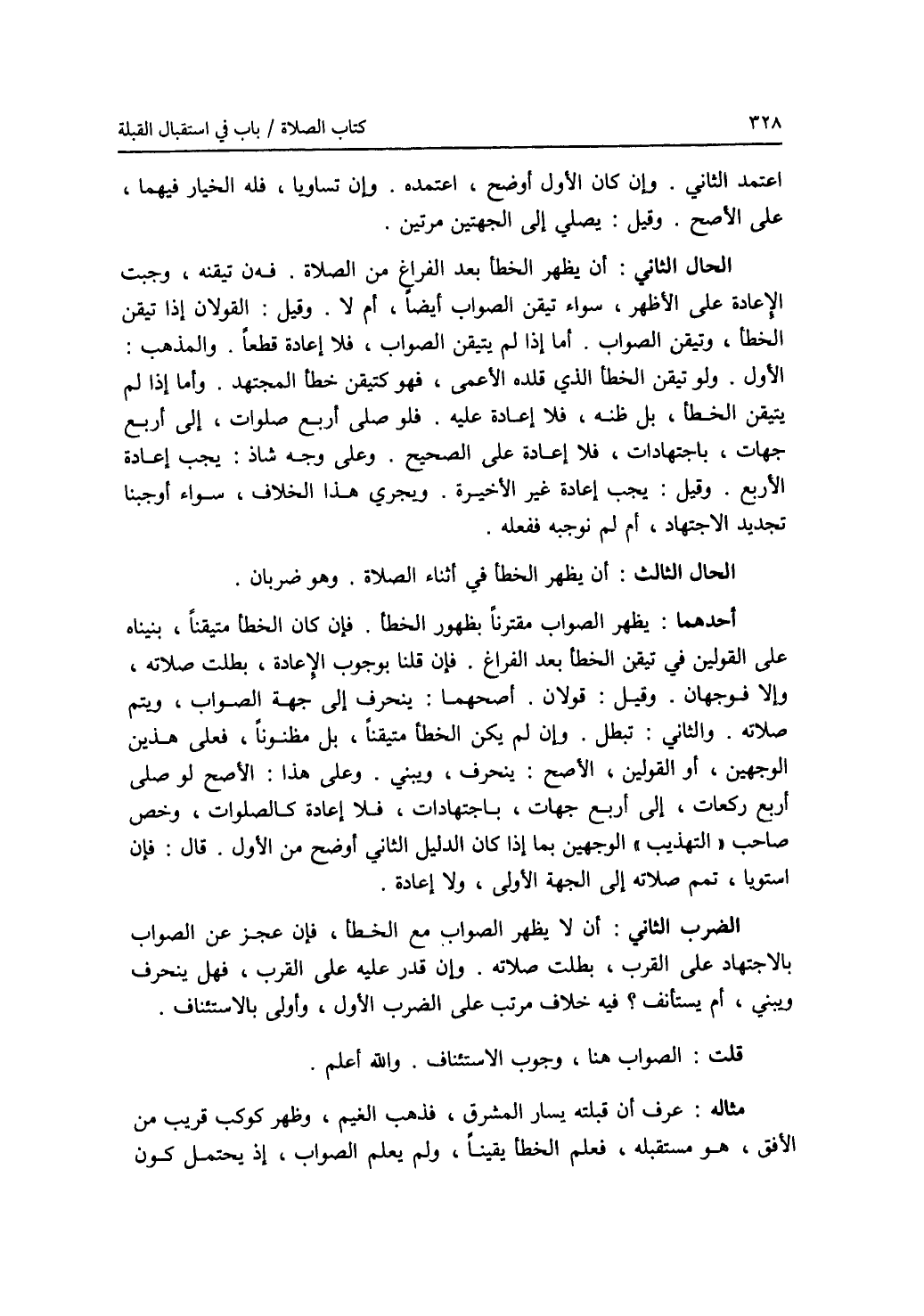 اعتمد الثاني. وإن كان الاول أوضح، اعتمده. وإن تساويا، فله الخيار فيهما، على الاصح. وقيل: يصلي إلى الجهتين مرتين. الحال الثاني: أن يظهر الخطأ بعد الفراغ من الصلاة. فإن تيقنه، وجبت الاعادة على الاظهر، سواء تيقن الصواب أيضا، أم لا. وقيل: القولان إذا تيقن الخطأ، وتيقن الصواب. أما إذا لم يتيقن الصواب، فلا إعادة قطعا. والمذهب: الاول. ولو تيقن الخطأ الذي قلده الاعمى، فهو كتيقن خطأ المجتهد. وأما إذا لم يتيقن الخطأ، بل ظنه، فلا إعادة عليه. فلو صلى أربع صلوات، إلى أربع جهات، باجتهادات، فلا إعادة على الصحيح. وعلى وجه شاذ: يجب إعادة الاربع. وقيل: يجب إعادة غير الاخيرة. ويجري هذا الخلاف، سواء أوجبنا تجديد الاجتهاد، أم لم نوجبه ففعله. الحال الثالث: أن يظهر الخطأ في أثناء الصلاة. وهو ضربان. أحدهما: يظهر الصواب مقترنا بظهور الخطأ. فإن كان الخطأ متيقنا، بنيناه على القولين في تيقن الخطأ بعد الفراغ. فإن قلنا بوجوب الاعادة، بطلت صلاته، وإلا فوجهان. وقيل: قولان. أصحهما: ينحرف إلى جهة الصواب، ويتم صلاته. والثاني: تبطل. وإن لم يكن الخطأ متيقنا، بل مظنونا، فعلى هذين الوجهين، أو القولين، الاصح: ينحرف، ويبني. وعلى هذا: الاصح لو صلى أربع ركعات، إلى أربع جهات، باجتهادات، فلا إعادة كالصلوات، وخص صاحب (التهذيب) الوجهين بما إذا كان الدليل الثاني أوضح من الاول. قال: فإن استويا، تمم صلاته إلى الجهة الاولى، ولا إعادة. الضرب الثاني: أن لا يظهر الصواب مع الخطأ، فإن عجز عن الصواب بالاجتهاد على القرب، بطلت صلاته. إن قدر عليه على القرب، فهل ينحرف ويبني، أم يستأنف ؟ فيه خلاف مرتب على الضرب الاول، وأولى بالاستئناف. قلت: الصواب هنا، وجوب الاستئناف. والله أعلم. مثاله، عرف أن قبلته يسار المشرق، فذهب الغيم، وظهر كوكب قريب من الافق، هو مستقبله، فعلم الخطأ يقينا، ولم يعلم الصواب، إذ يحتمل كون