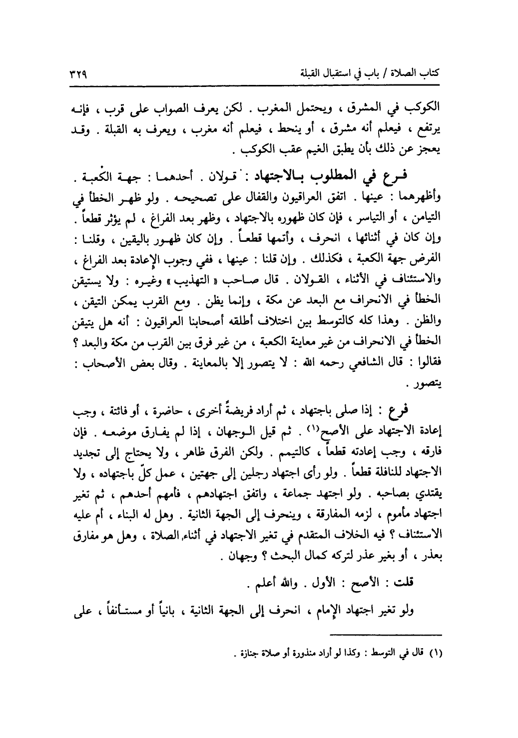 الكوكب في المشرق، ويحتمل المغرب. لكن يعرف الصواب على قرب، فإنه يرتفع، فيعلم أنه مشرق، أو ينحط، فيعلم أنه مغرب، ويعرف به القبلة. وقد يعجز عن ذلك بأن يطبق الغيم عقب الكوكب. فرع في المطلوب بالاجتهاد: قولان. أحدهما: جهة الكعبة. وأظهرهما: عينها. اتفق العراقيون والقفال على تصحيحه. ولو ظهر الخطأ في التيامن، أو التياسر، فإن كان ظهوره بالاجتهاد، وظهر بعد الفراغ، لم يؤثر قطعا. وإن كان في أثنائها، انحرف، وأتمها قطعا. وإن كان ظهور باليقين، وقلنا: الفرض جهة الكعبة، فكذلك. وإن قلنا: عينها، ففي وجوب الاعادة بعد الفراغ، والاستئناف في الاثناء، القولان. قال صاحب (التهذيب) وغيره: ولا يستيقن الخطأ في الانحراف مع البعد عن مكة، وإنما يظن. ومع القرب يمكن التيقن، والظن. وهذا كله كالتوسط بين اختلاف أطلقه أصحابنا العراقيون: أنه هل يتيقن الخطأ في الانحراف من غير معاينة الكعبة، من غير فرق بين القرب من مكة والبعد ؟ فقالوا: قال الشافعي رحمه الله: لا يتصور إلا بالمعاينة. وقال بعض الاصحاب: يتصور. فرع: إذا صلى باجتهاد، ثم أراد فريضة أخرى، حاضرة، أو فائتة، وجب إعادة الاجتهاد على الاصح (1). ثم قيل الوجهان، إذا لم يفارق موضعه. فإن فارقه وجب إعادته قطعا، كالتيمم. ولكن الفرق ظاهر، ولا يحتاج إلى تجديد الاجتهاد للنافلة قطعا ولو رأى اجتهاد رجلين إلى جهتين، عمل كل باجتهاده، ولا يقتدي بصاحبه. ولو اجتهد جماعة، واتفق اجتهادهم فأمهم أحدهم، ثم تغير اجتهاد مأموم، لزمه المفارقة، وينحرف إلى الجهة الثانية. وهل له البناء، أم عليه الاستئناف ؟ فيه الخلاف المتقدم في تغير الاجتهاد في أثناء الصلاة، وهل هو مفارق بعذر، أو بغير عذر لتركه كمال البحث ؟ وجهان. قلت: الاصح: الاول. والله أعلم. ولو تغير اجتهاد الامام، انحرف إلى الجهة الثانية، بانيا أو مستأنفا، على